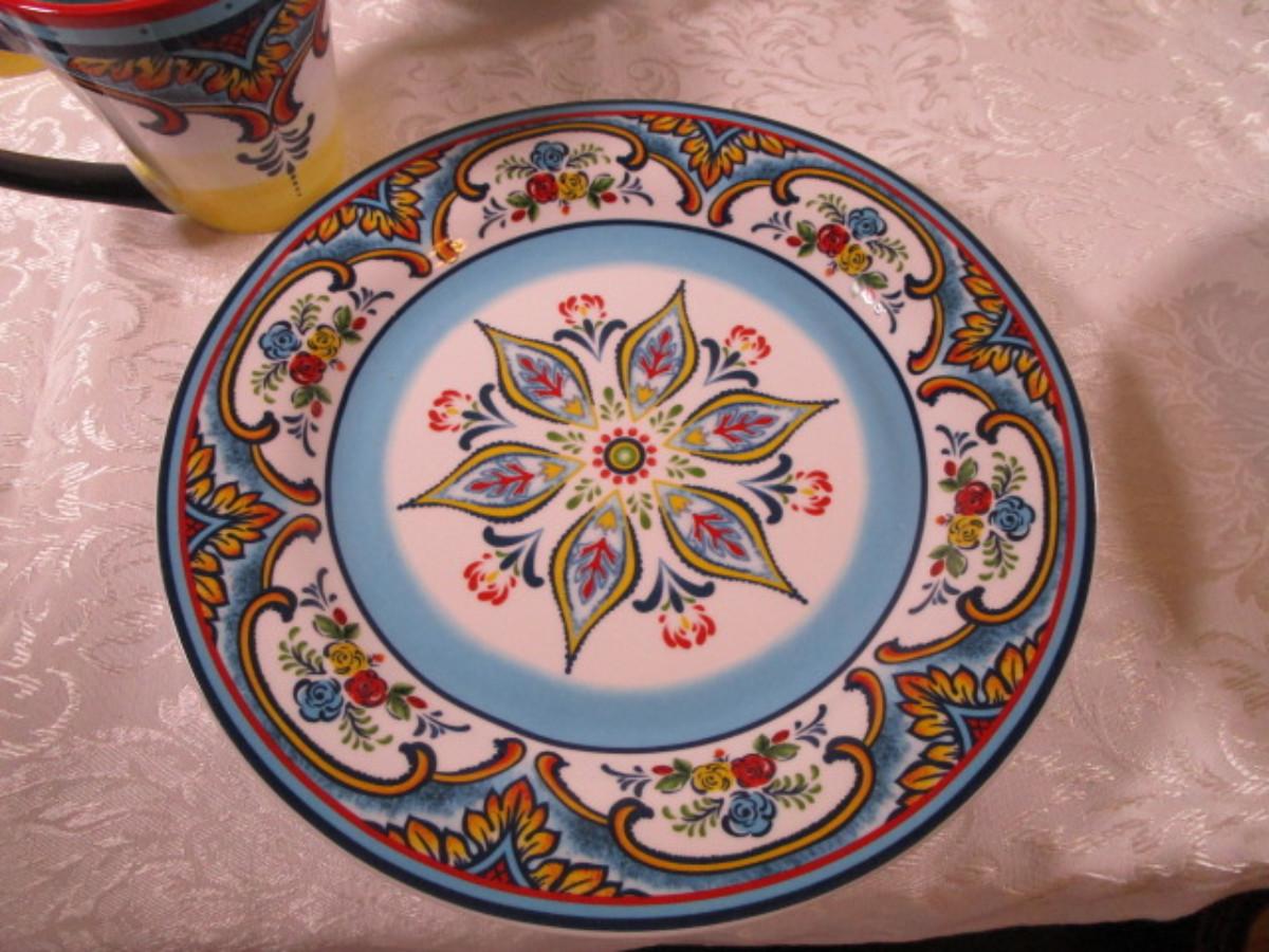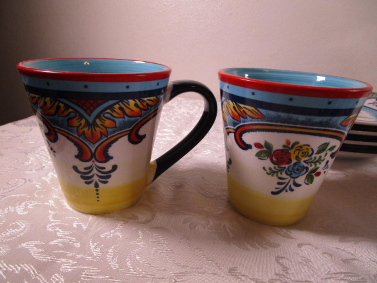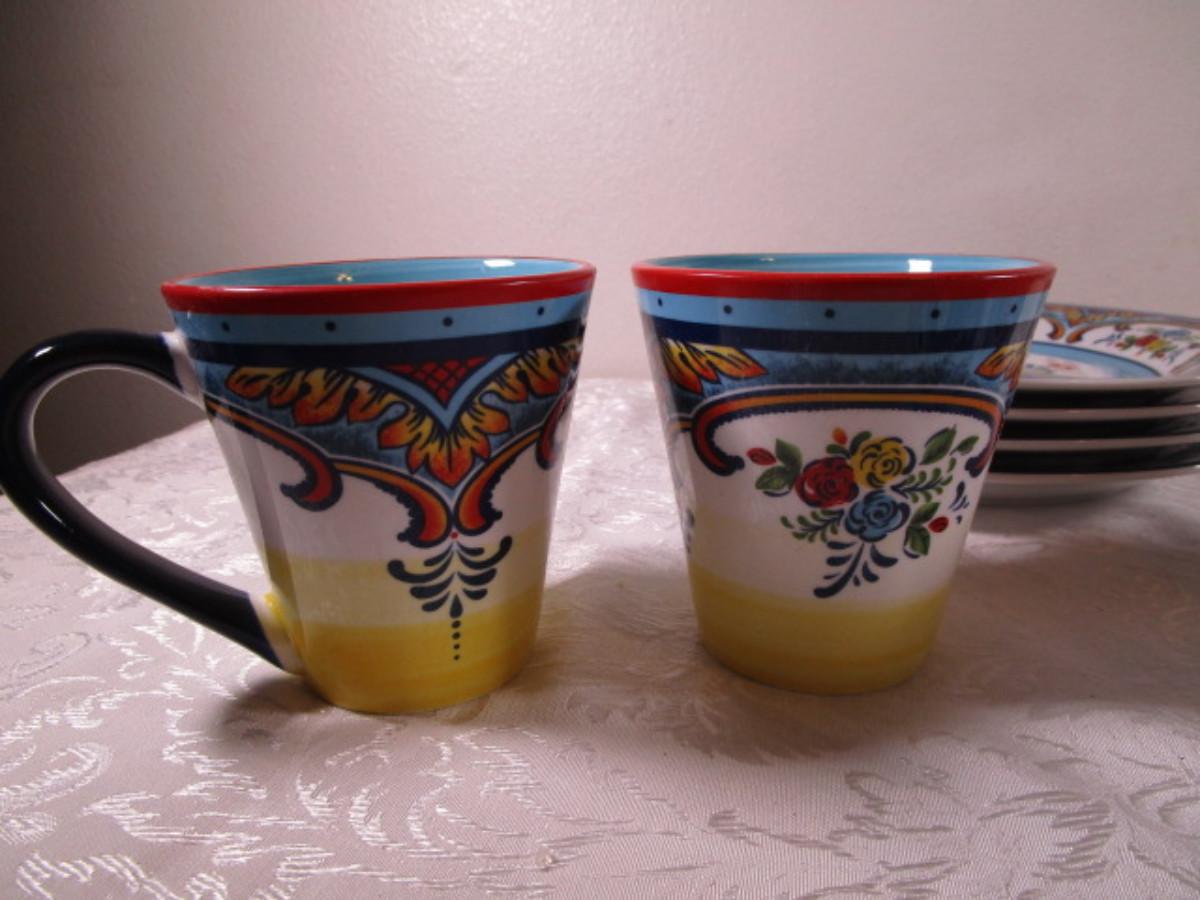 New with stickers, Service for 4, dinner plates, salad plates, mugs, bowls, Sells on Amazon for $76, Microwave safe, dishwasher safe