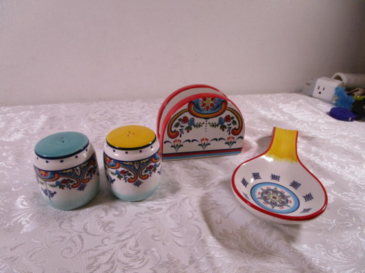 Salt & Pepper shakers, napkin holder, spoon rest
