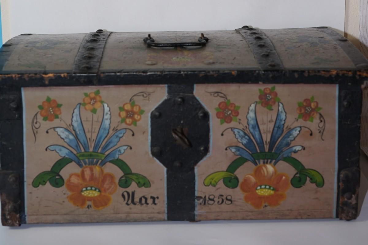travel chest that measures: length of 24: 'Width of 13" and the height of 11 1/2" dated 1858
