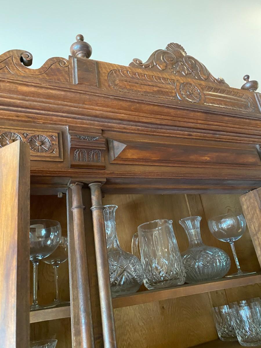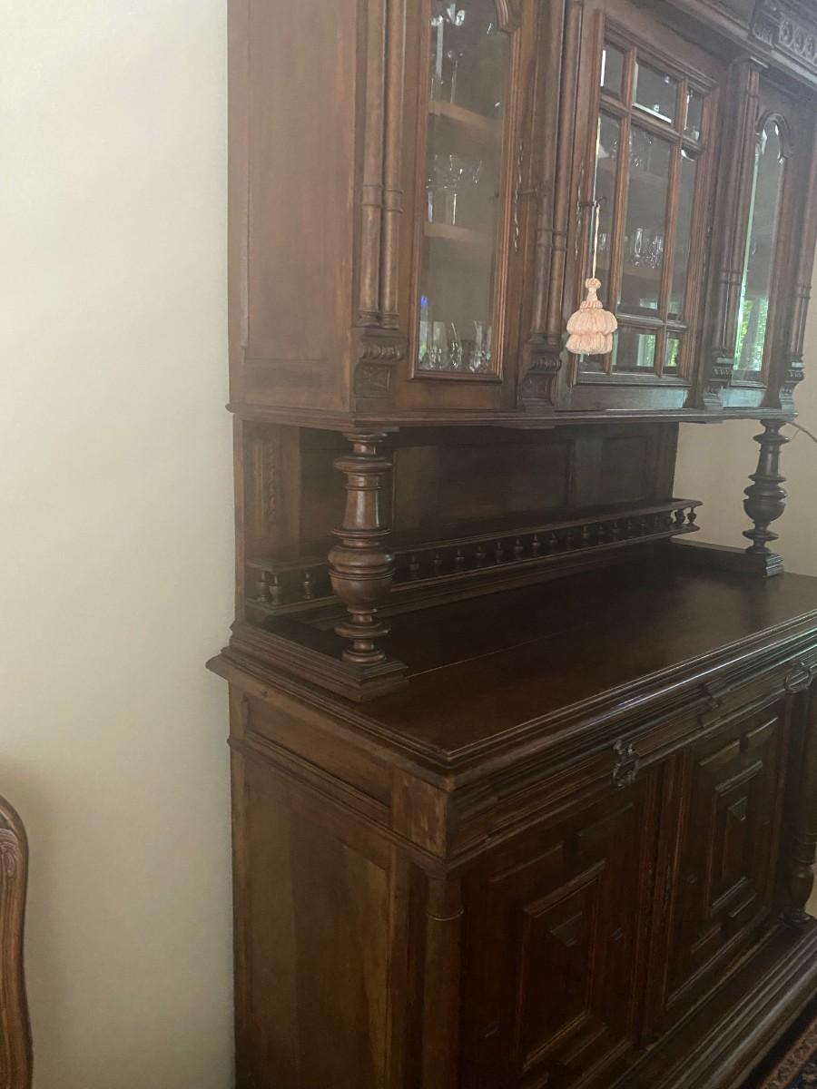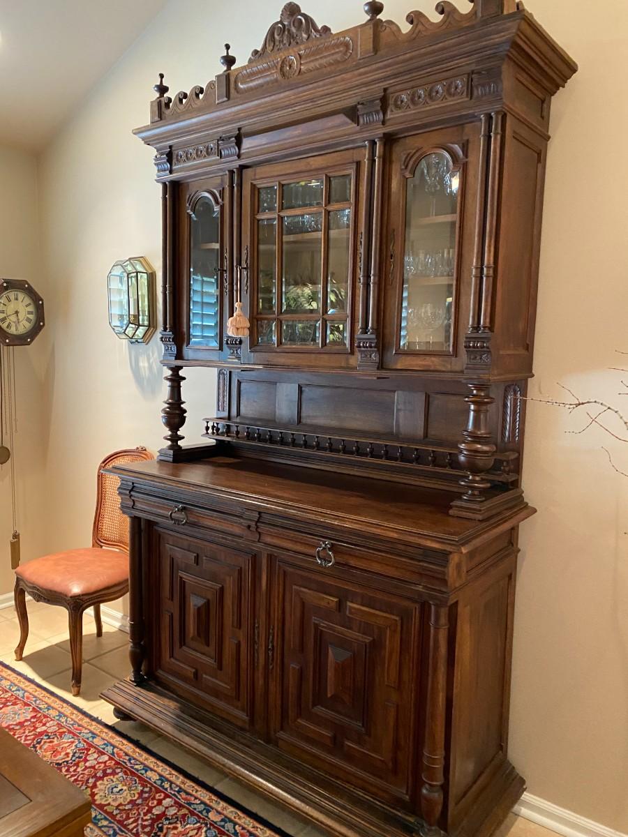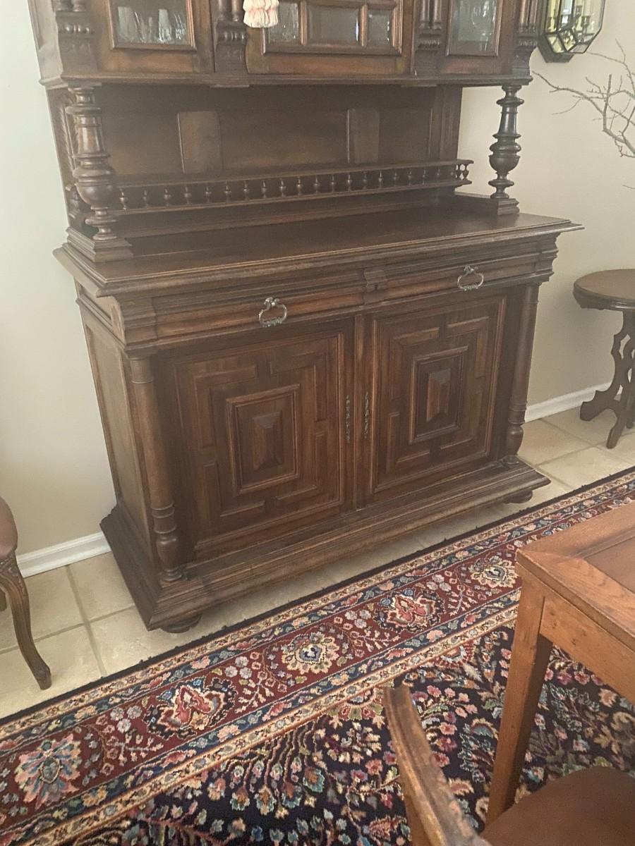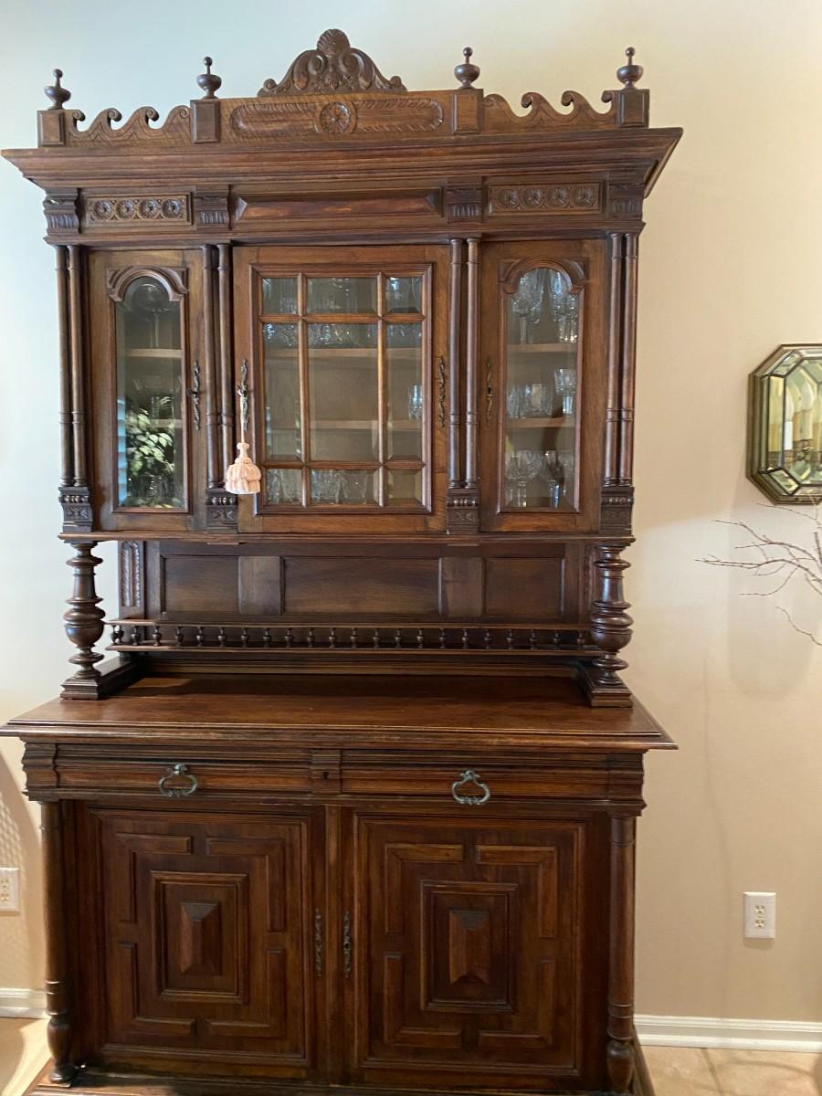 55 x 22 top 41 bottom 54 Beveled glass panels allow for display. There are 4 spindles topping the buffet. Columns enhance the base of the top portion as well as add detail to the base. Bun feet, turned spindles form the plate rack.