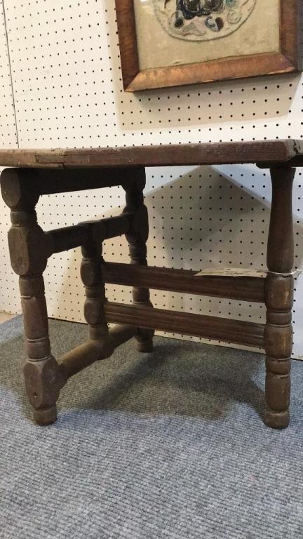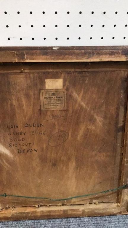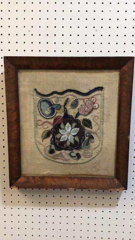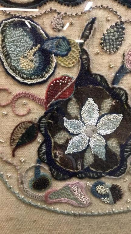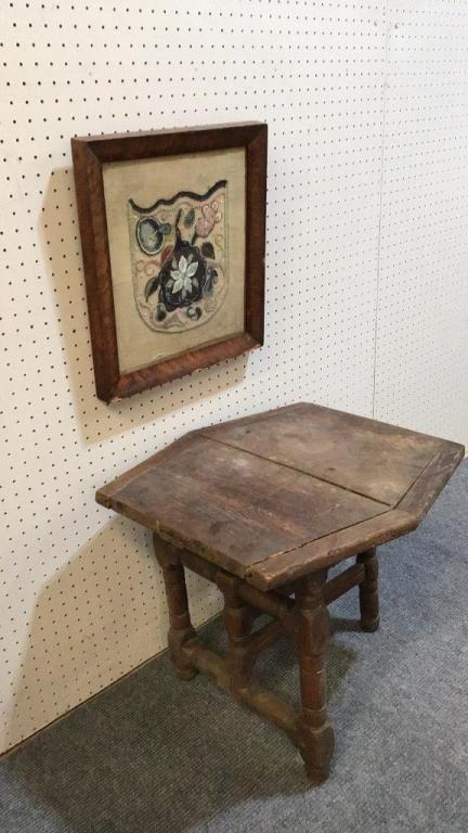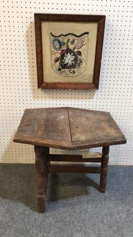 Folding table, 20 high x 22 wide x 21 deep..Framed Embroidery with beading, back signed ‘Lois Olden..Bowd..Devon..8 Mar. 43’