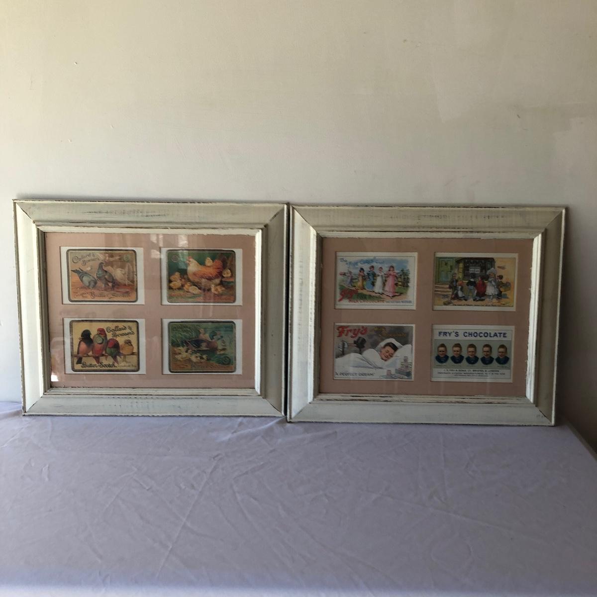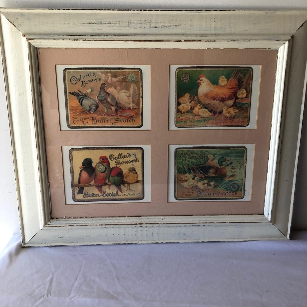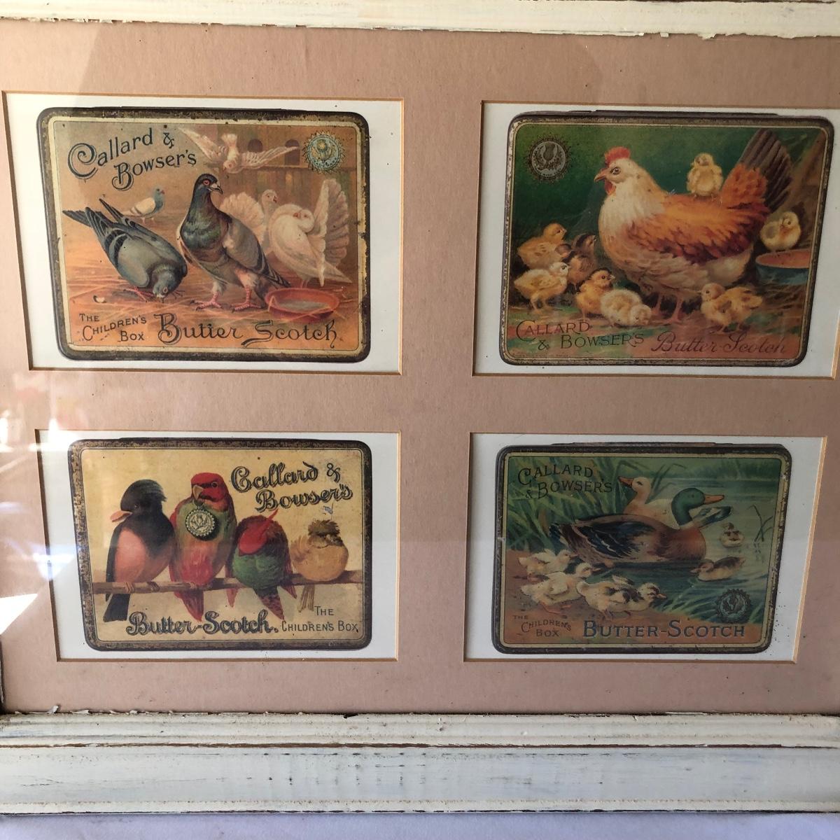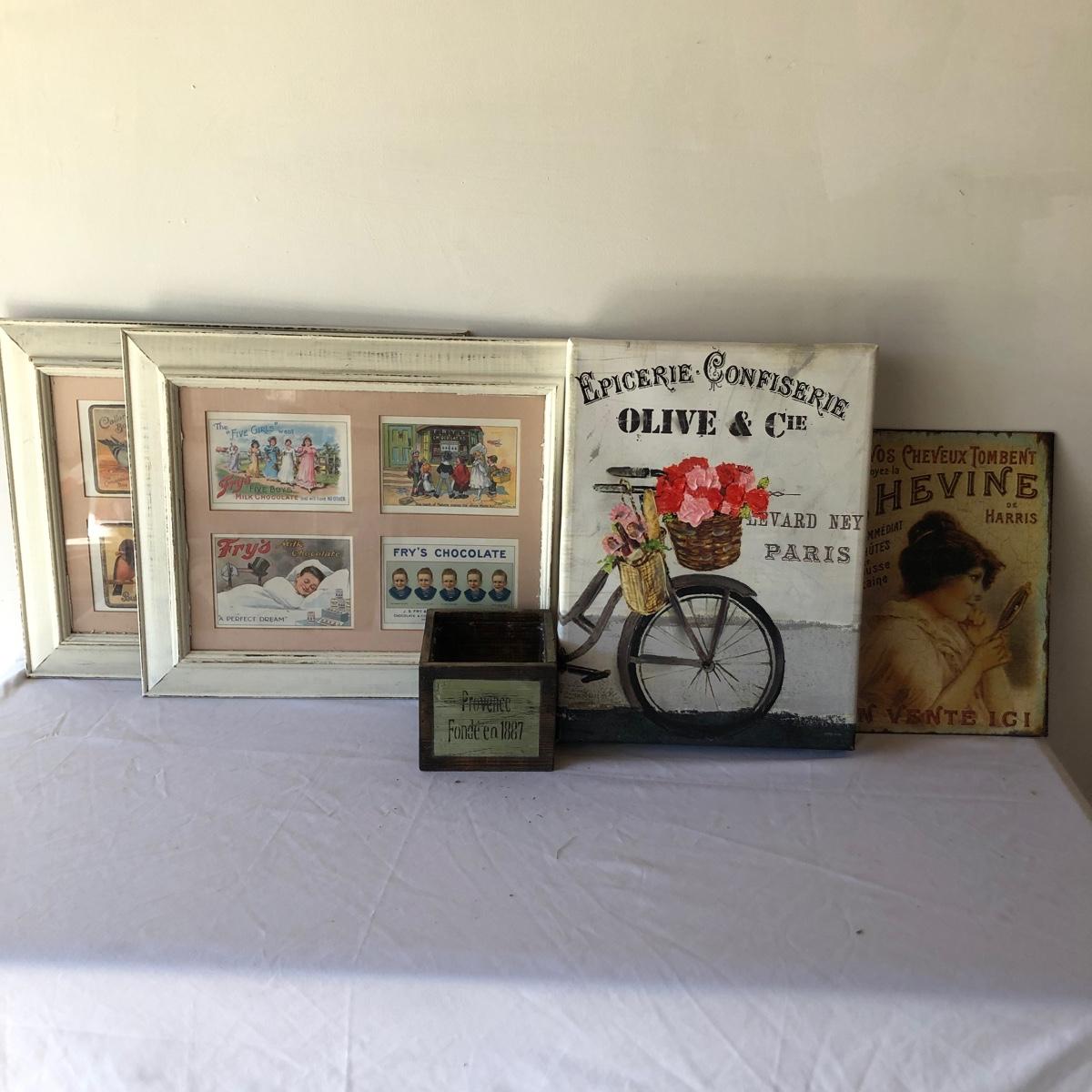 Lot includes a framed and matted Callard and Bowser artwork and framed and matted Fry’s artwork. Also, an Epicerie Confiserie print with texture, a metal Chevine sign, and a wooden plant pot. Frames measure 15.5” x 19”.