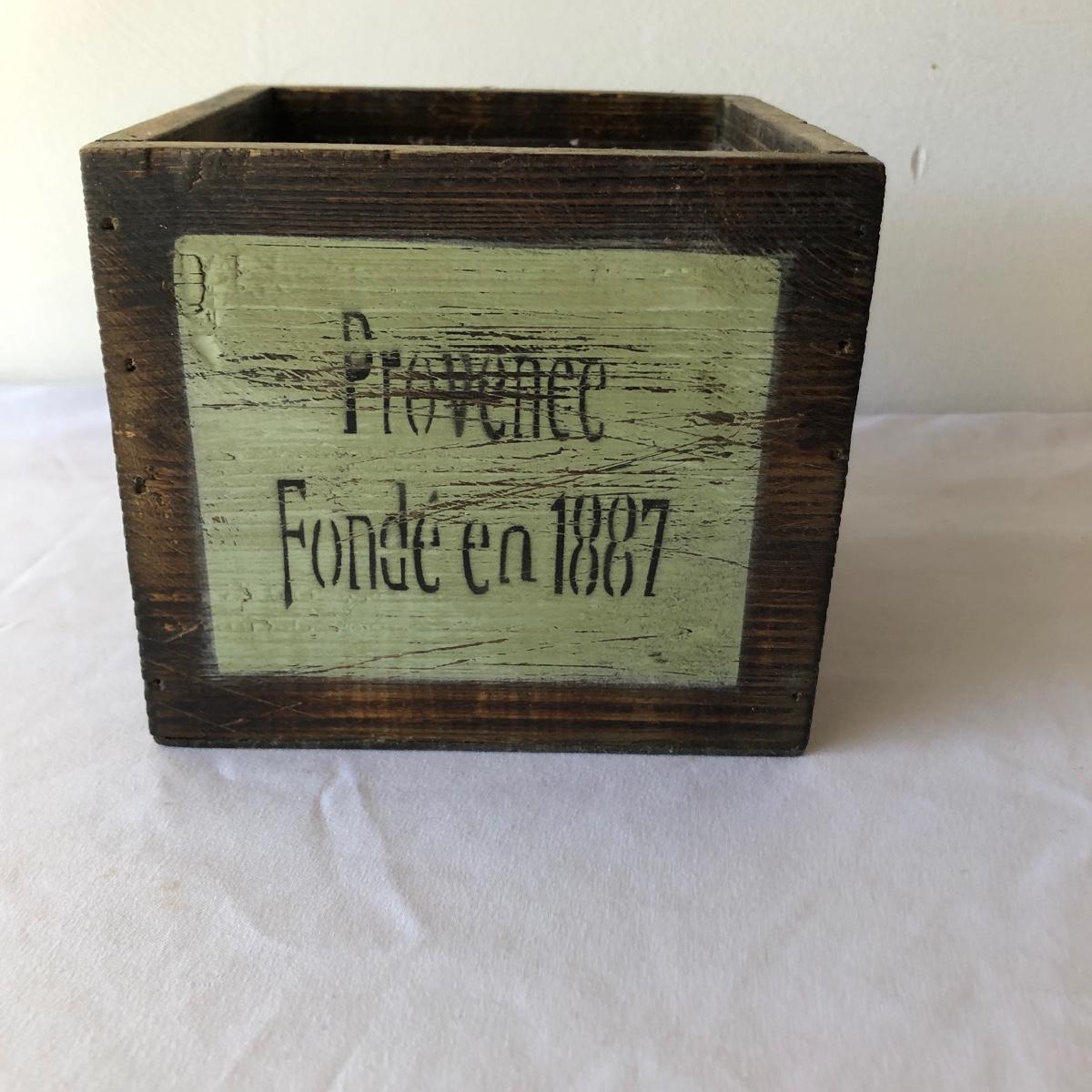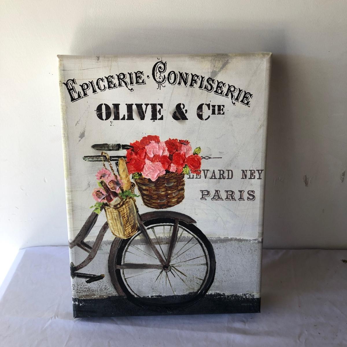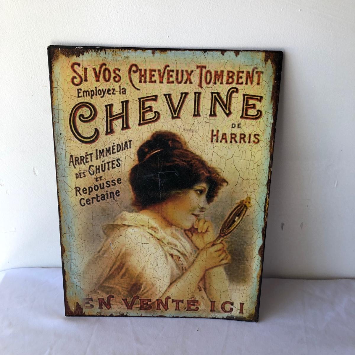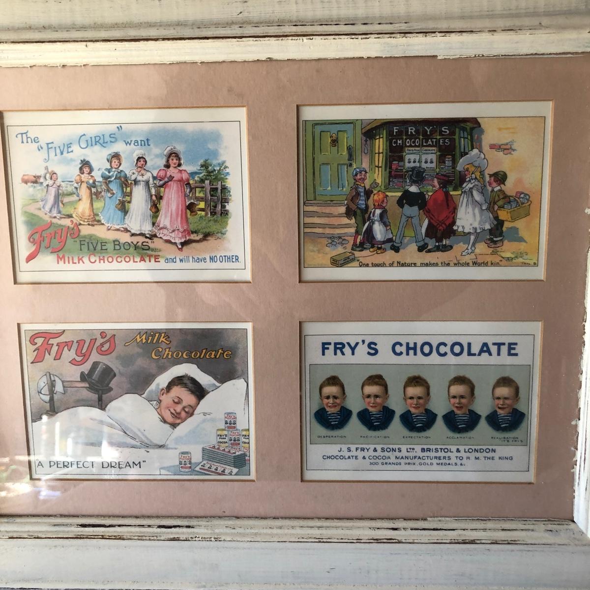 Lot includes a framed and matted Callard and Bowser artwork and framed and matted Fry’s artwork. Also, an Epicerie Confiserie print with texture, a metal Chevine sign, and a wooden plant pot. Frames measure 15.5” x 19”.