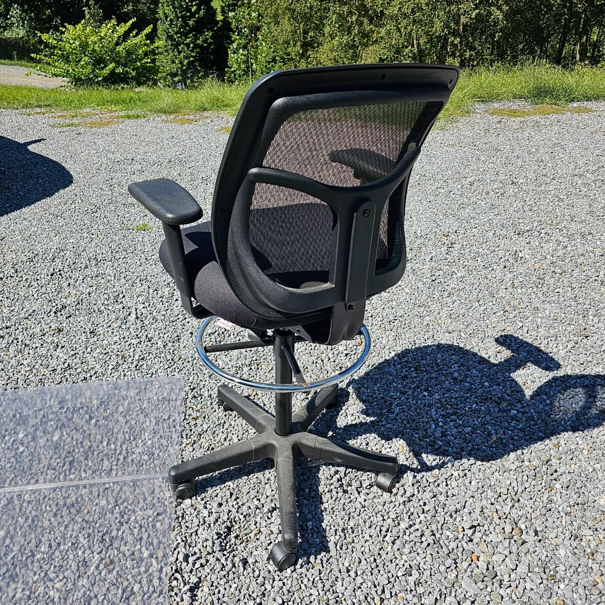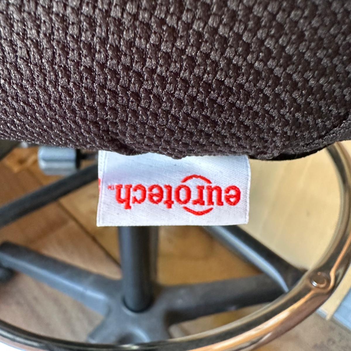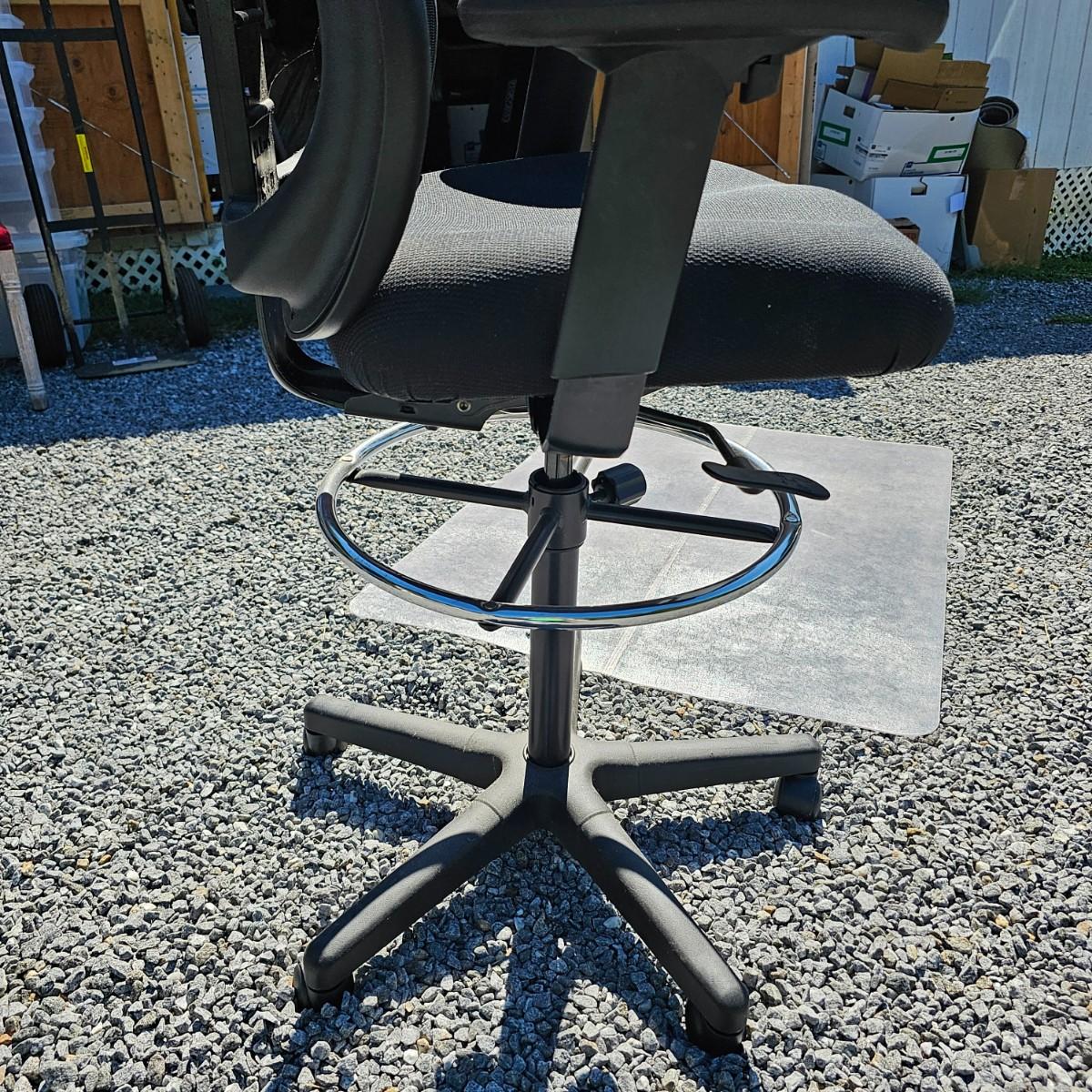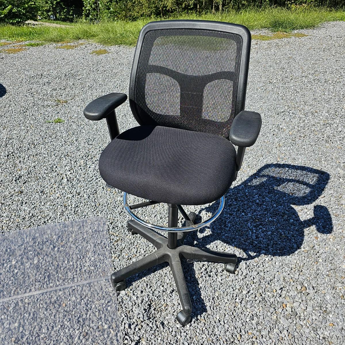 One Eurotech office/craft chair with multiple adjustment capabilities. Chair seat is foam with cool mesh back. Arms adjust up and down, swivel seat raises from 28" to 36"H. Chair has chrome foot ring for use at height. Overall it measures 25.5" x 25" x 42"H. Clear protective floor mat is 35" x 47", has standard teeth to grip carpet. See photos for details. Local pickup only.