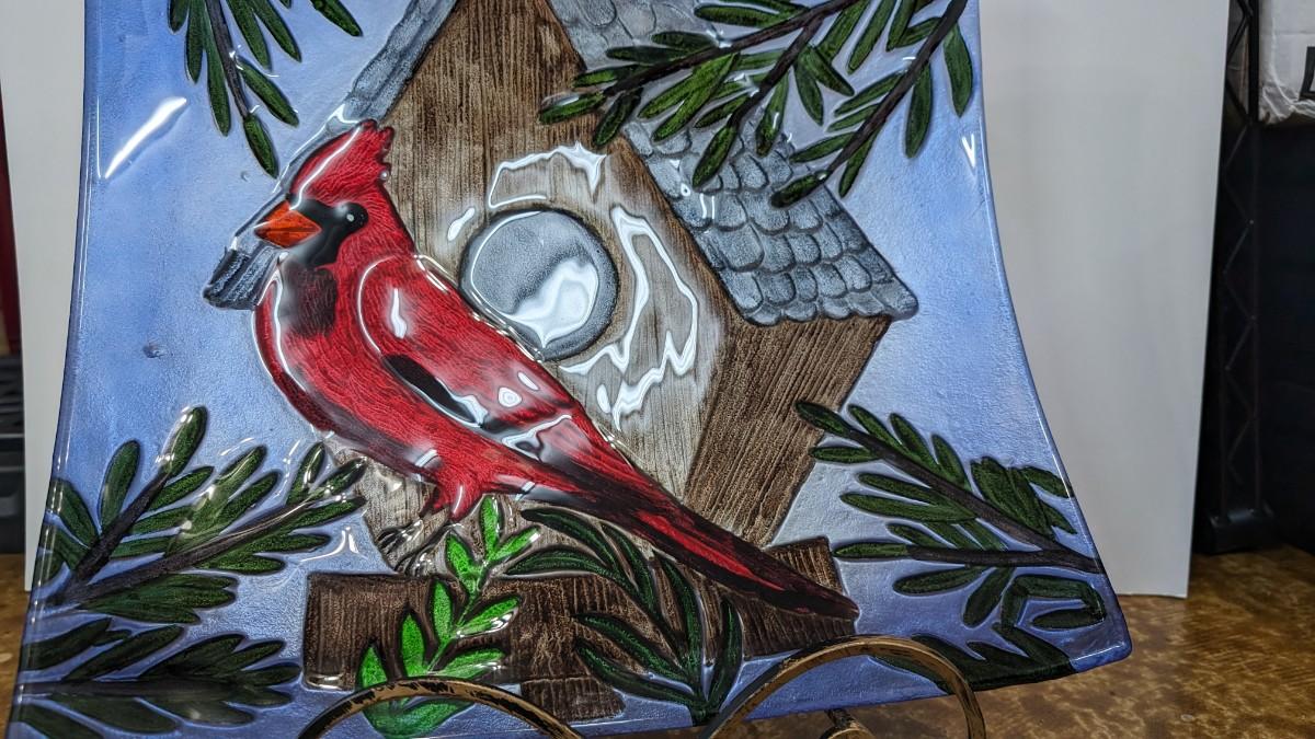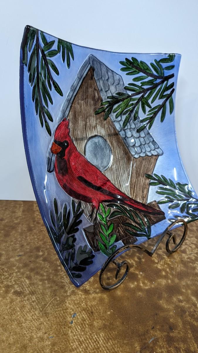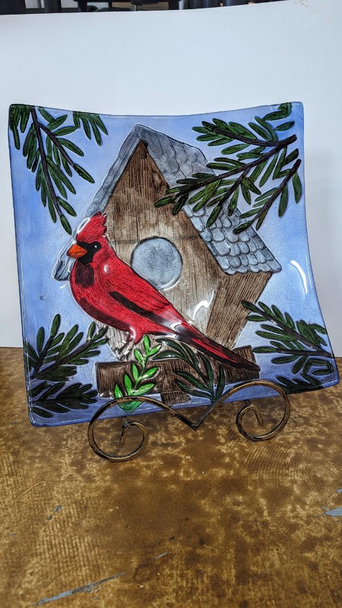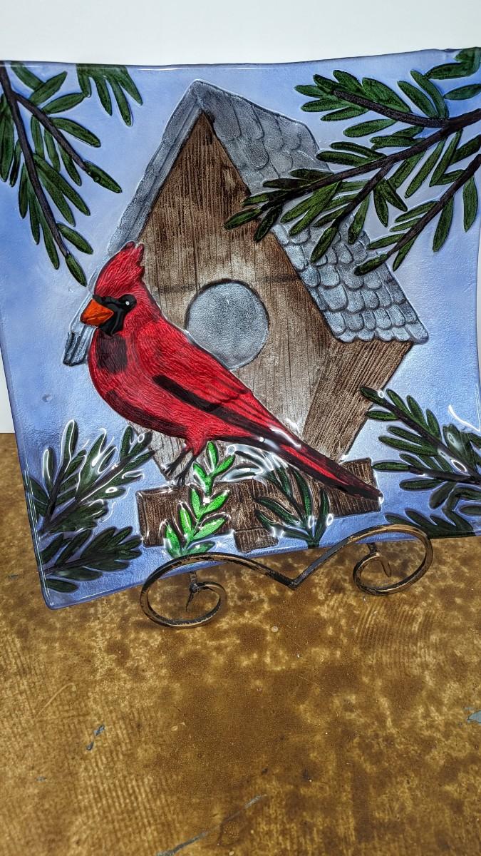 This is a 16.5" hand-painted and embossed square glass bird bath picturing a cardinal and bird house. Comes with metal display stand.
