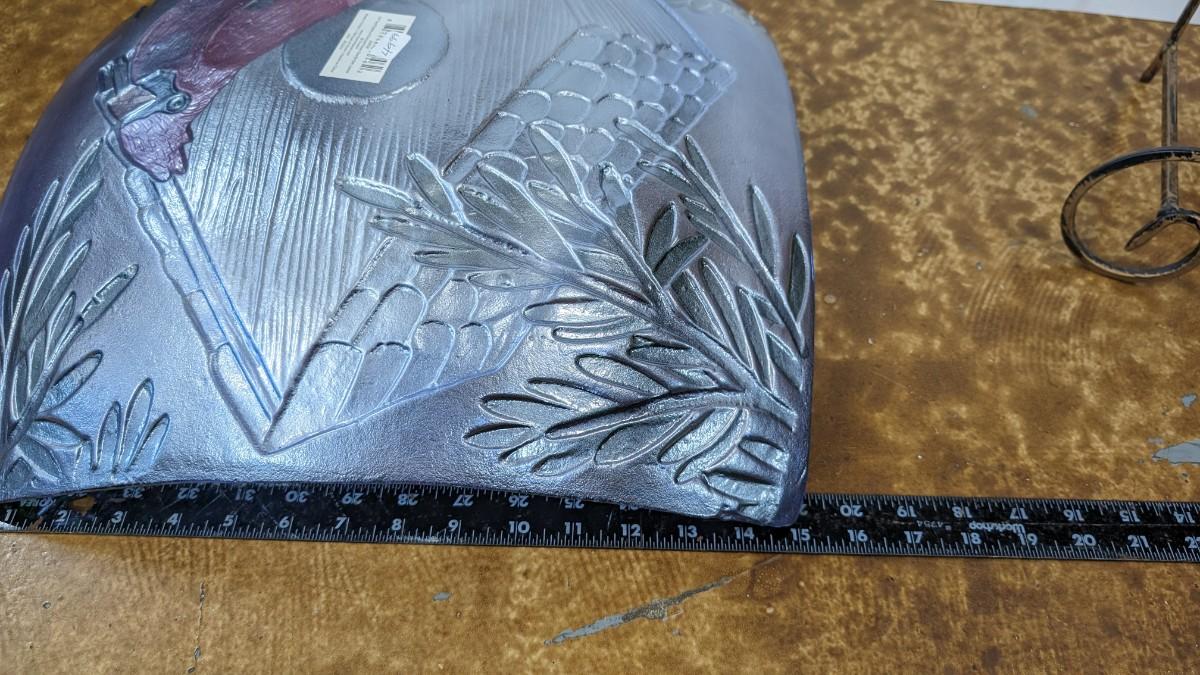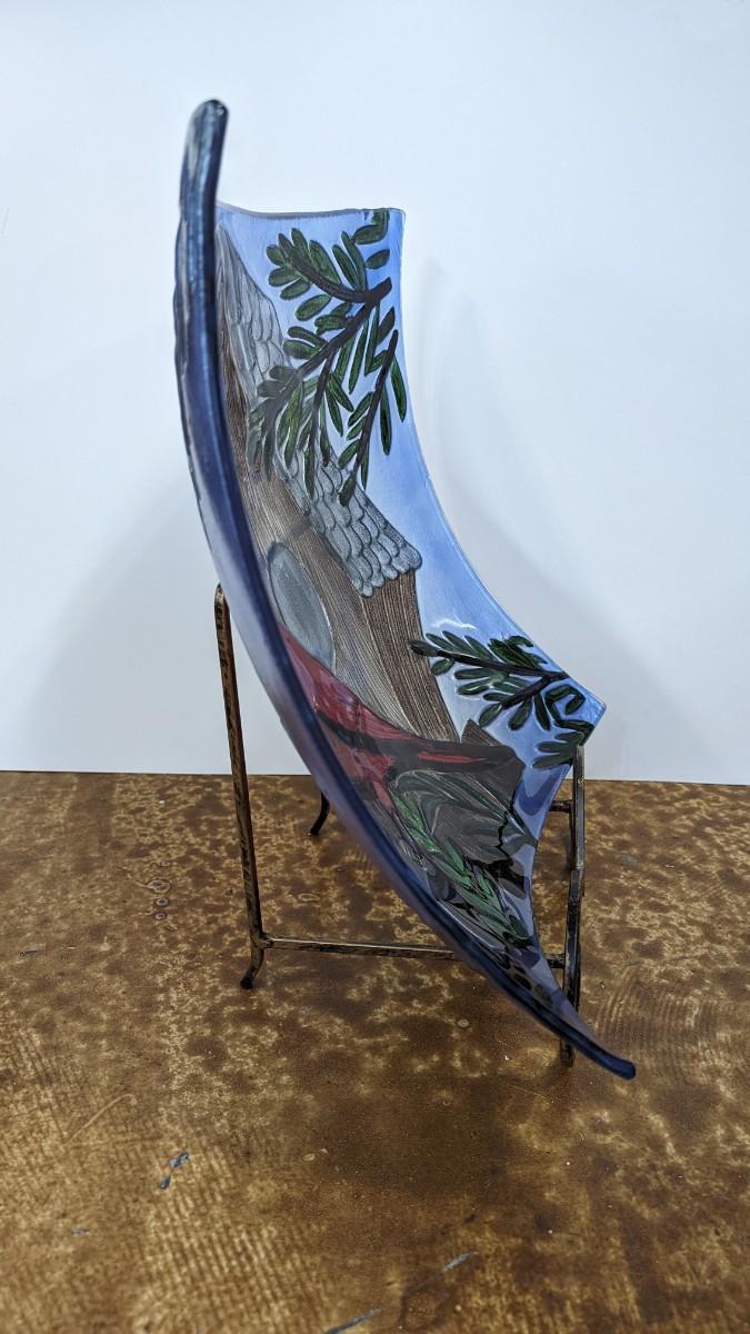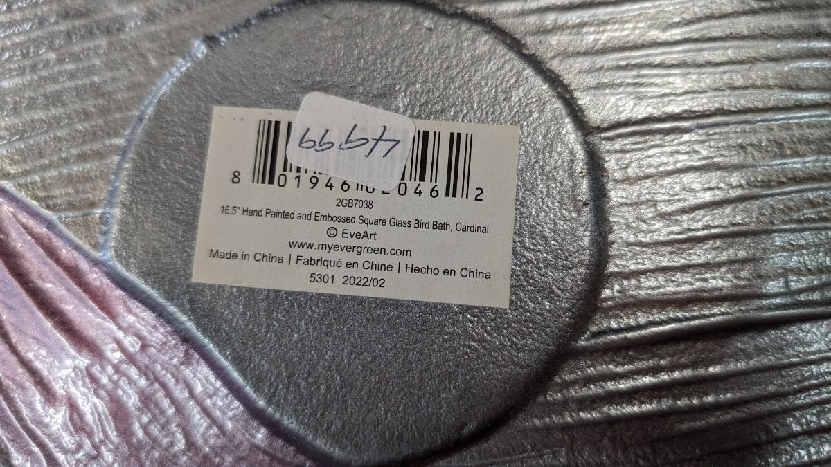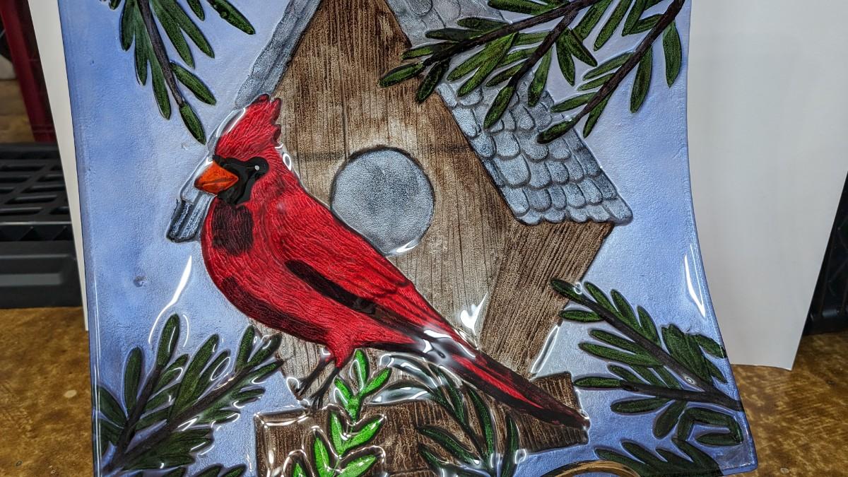 This is a 16.5" hand-painted and embossed square glass bird bath picturing a cardinal and bird house. Comes with metal display stand.