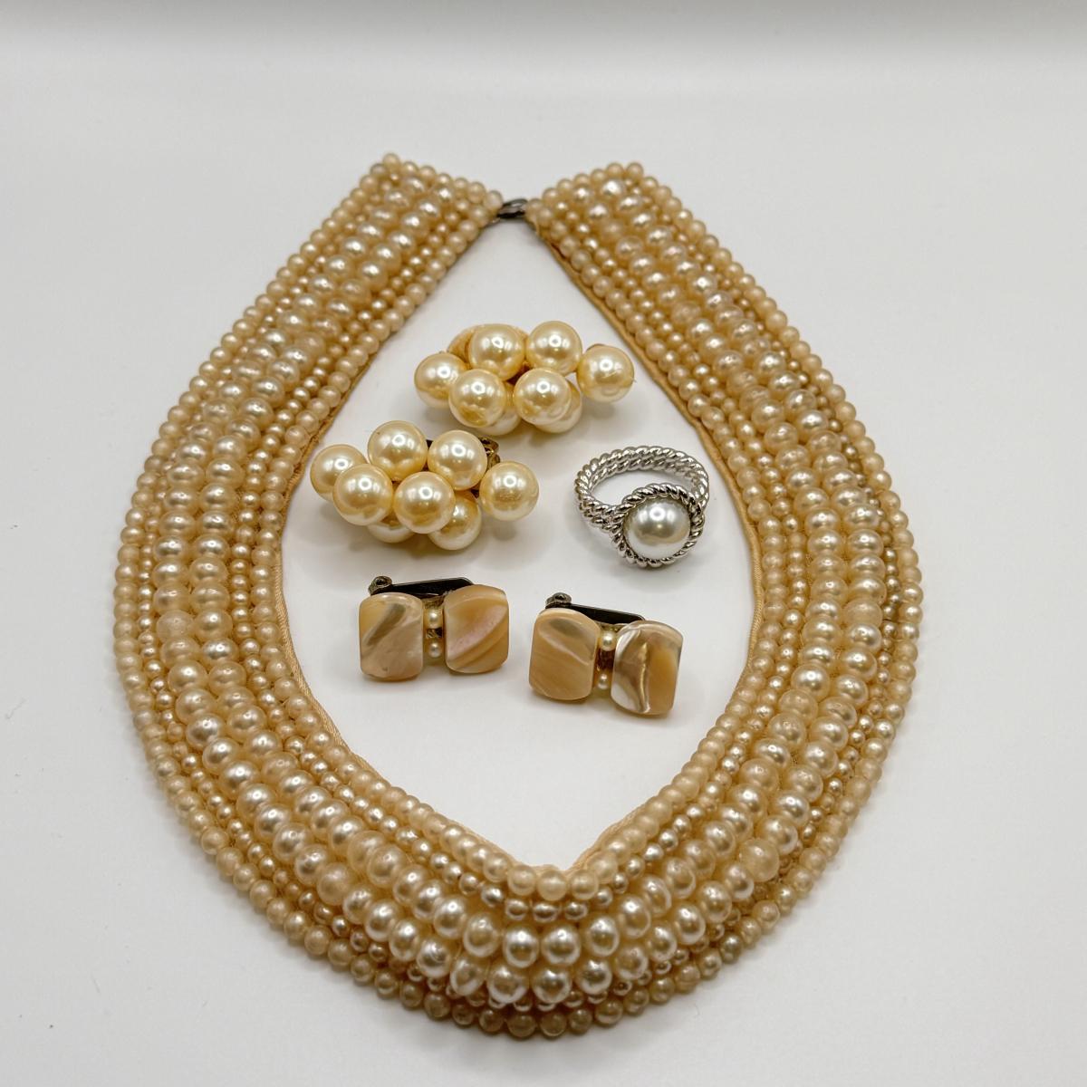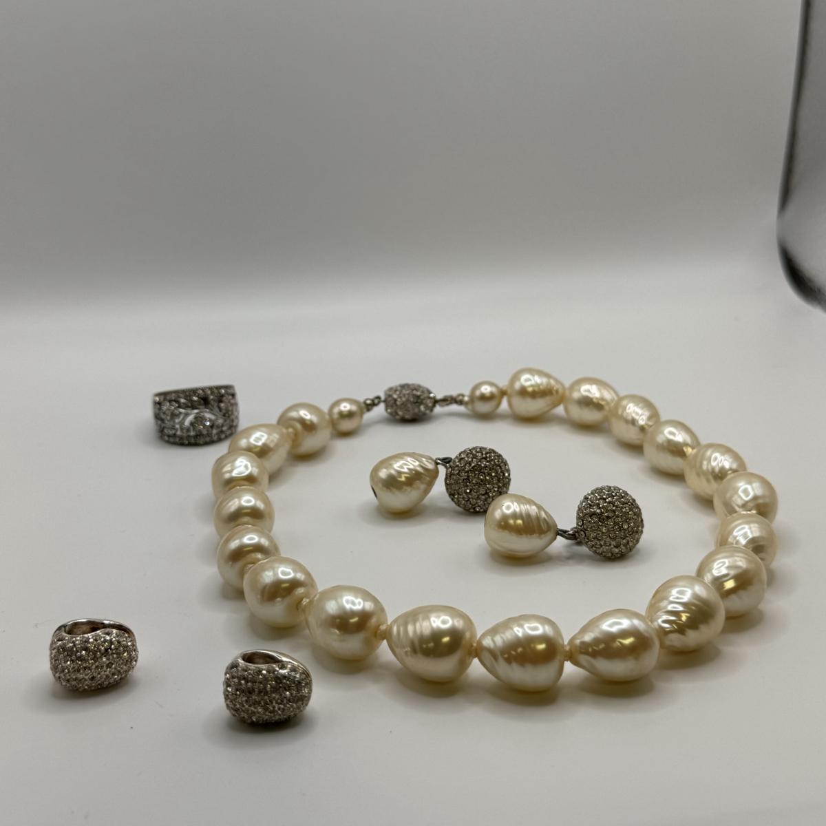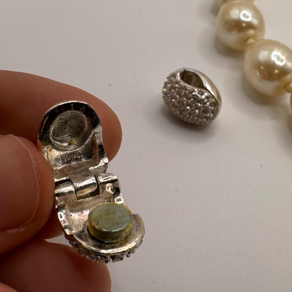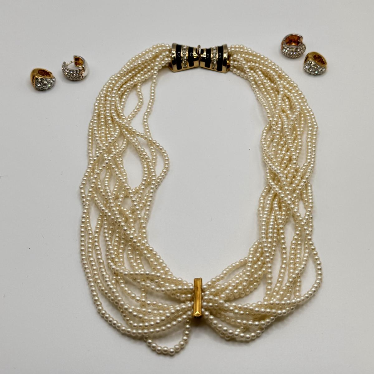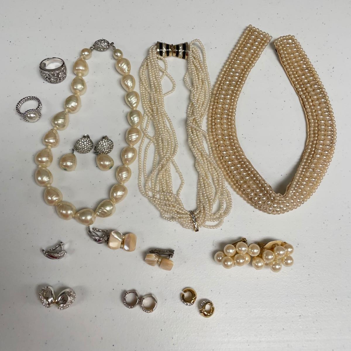 This lot includes a pair of Ardinea earrings and one pair of Les Bernard earrings for pierced ears. There are three necklaces with pearls or pearl-like beads including a layered necklace and a Miranda brand collar necklace. There are four pairs of earrings for unpierced ears: one pair of Monet magnetic “clip-on” earrings, one pair of multiple faux pearl clip-on earrings, and two pairs of small clip-on earrings with 925 stamped on the inside. There are also two rings: one is stamped with 925 and the other has a braided pattern.