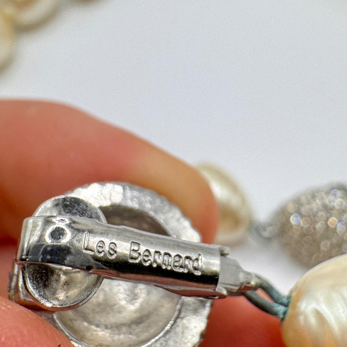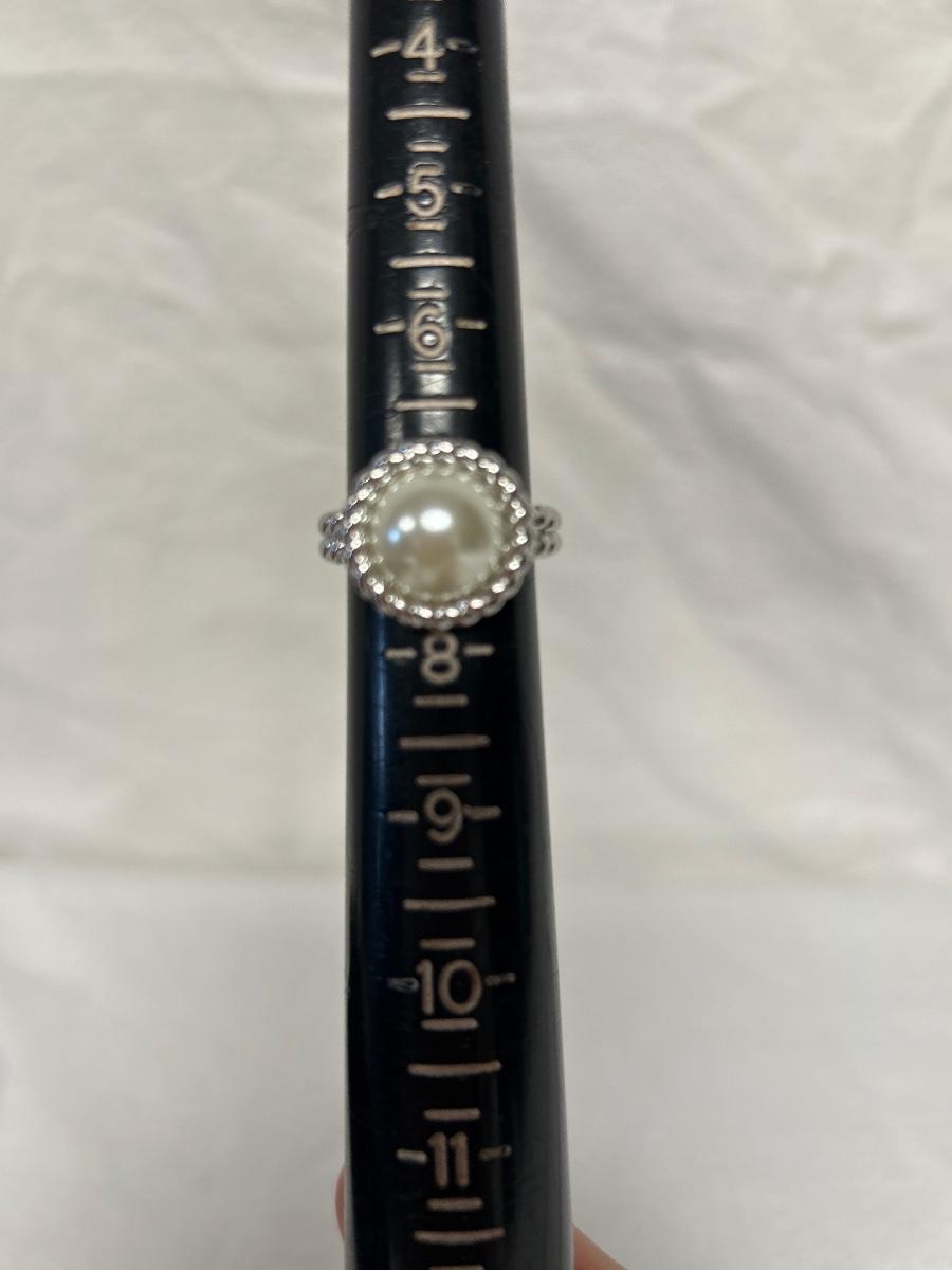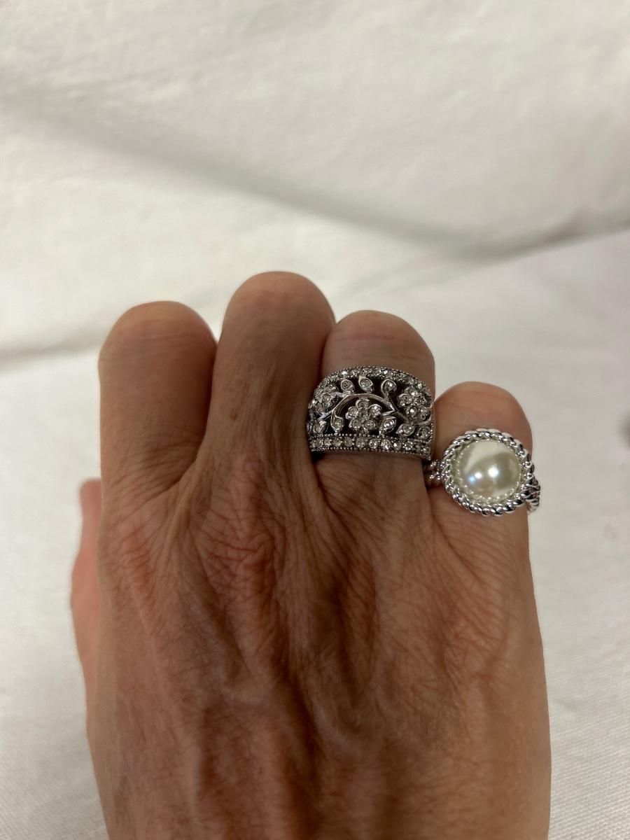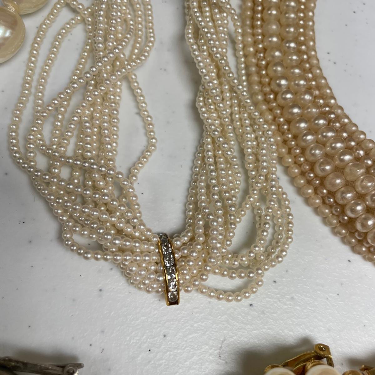 This lot includes a pair of Ardinea earrings and one pair of Les Bernard earrings for pierced ears. There are three necklaces with pearls or pearl-like beads including a layered necklace and a Miranda brand collar necklace. There are four pairs of earrings for unpierced ears: one pair of Monet magnetic “clip-on” earrings, one pair of multiple faux pearl clip-on earrings, and two pairs of small clip-on earrings with 925 stamped on the inside. There are also two rings: one is stamped with 925 and the other has a braided pattern.