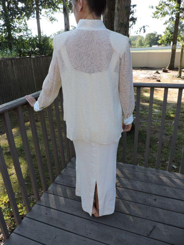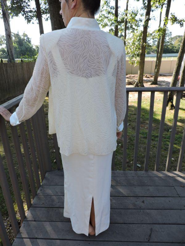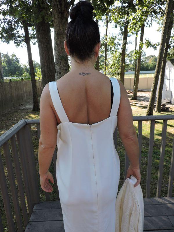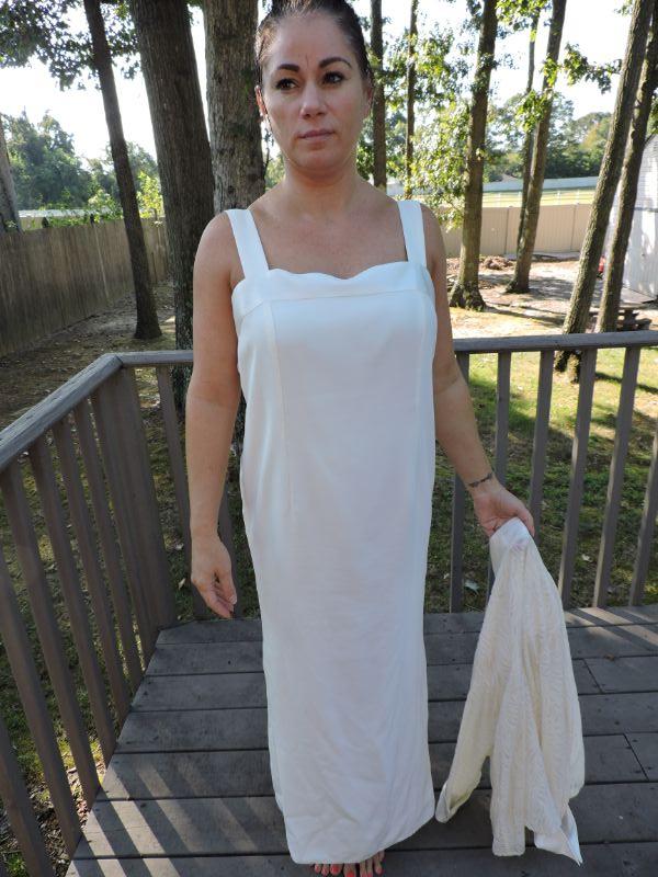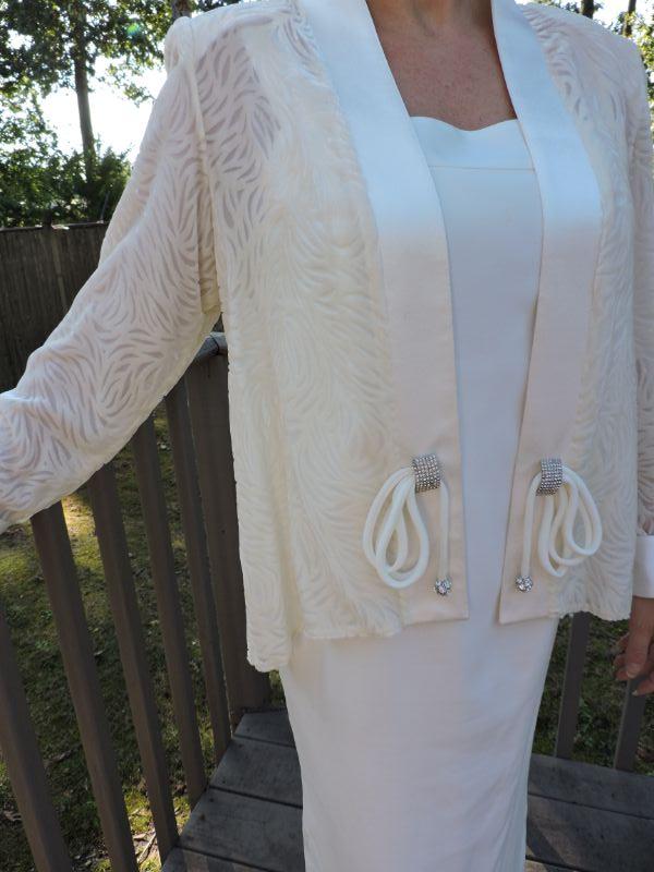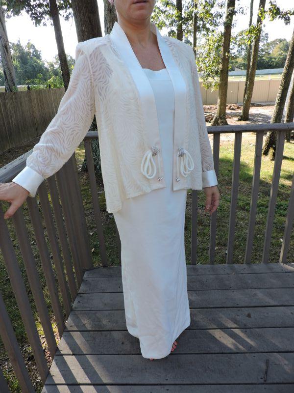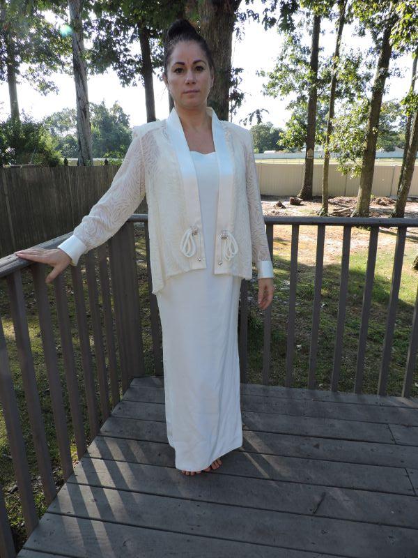 Lovely off pearl white dress with straps and a removable jacket. Size 10-12. Model is size 4. **Please read Terms and Conditions before placing a bid. Pick up is Sunday, September 15, 2019 from 11am to 4pm and Tuesday, September 17 from 4pm-7pm in Sicklerville. All sales are final. All sales are as is, where is. Please review all photos. Any props included in photos are not included in listing. All measurements are approximate.