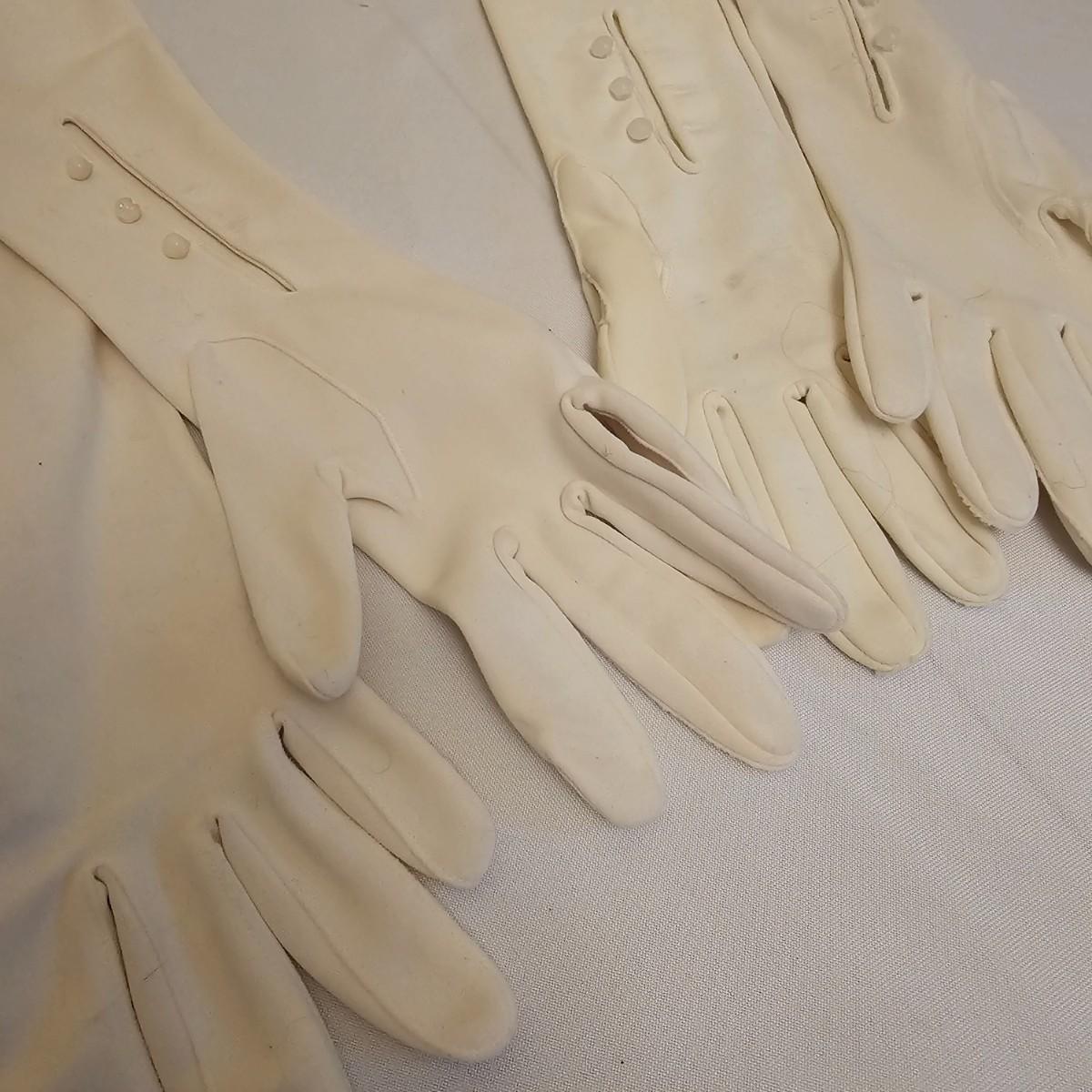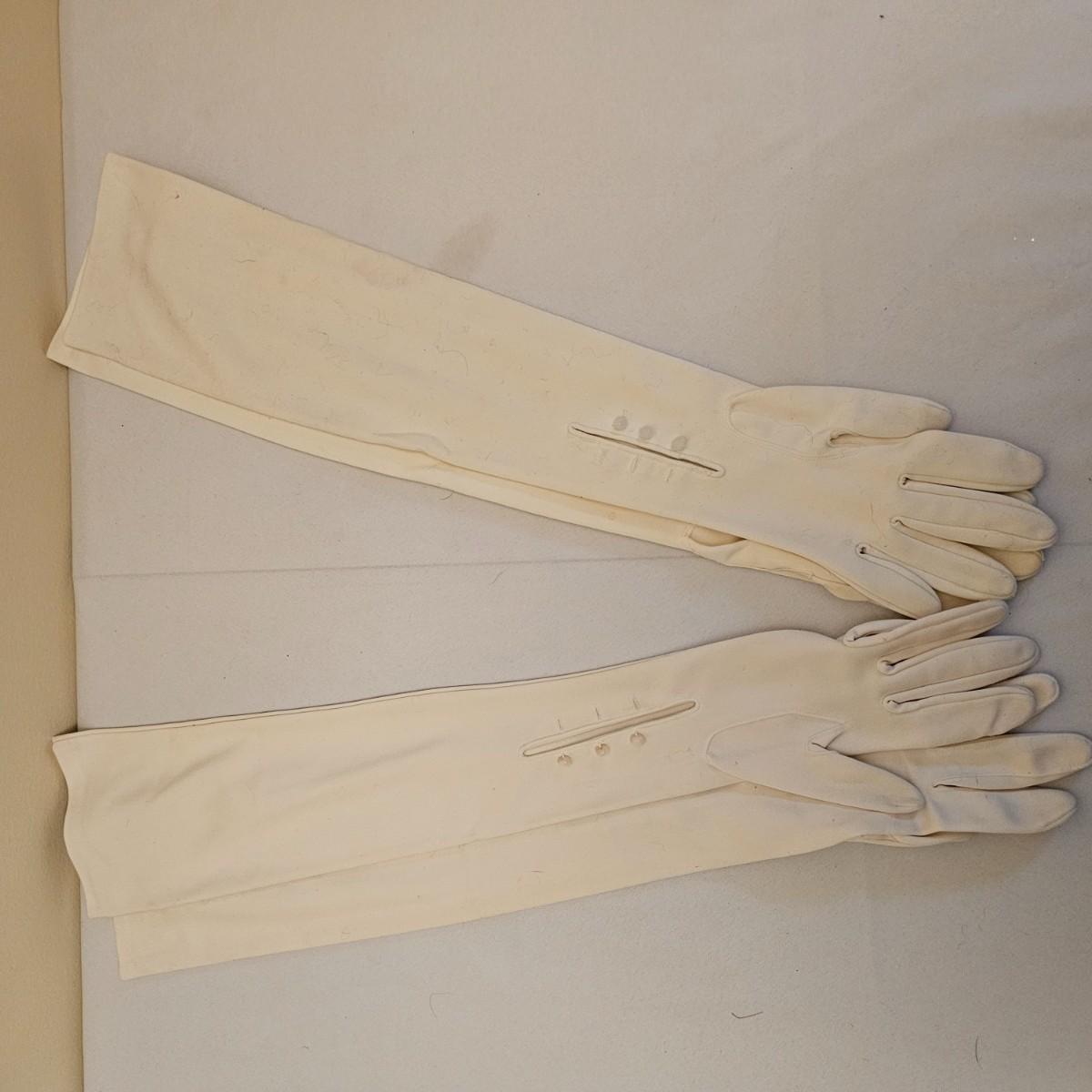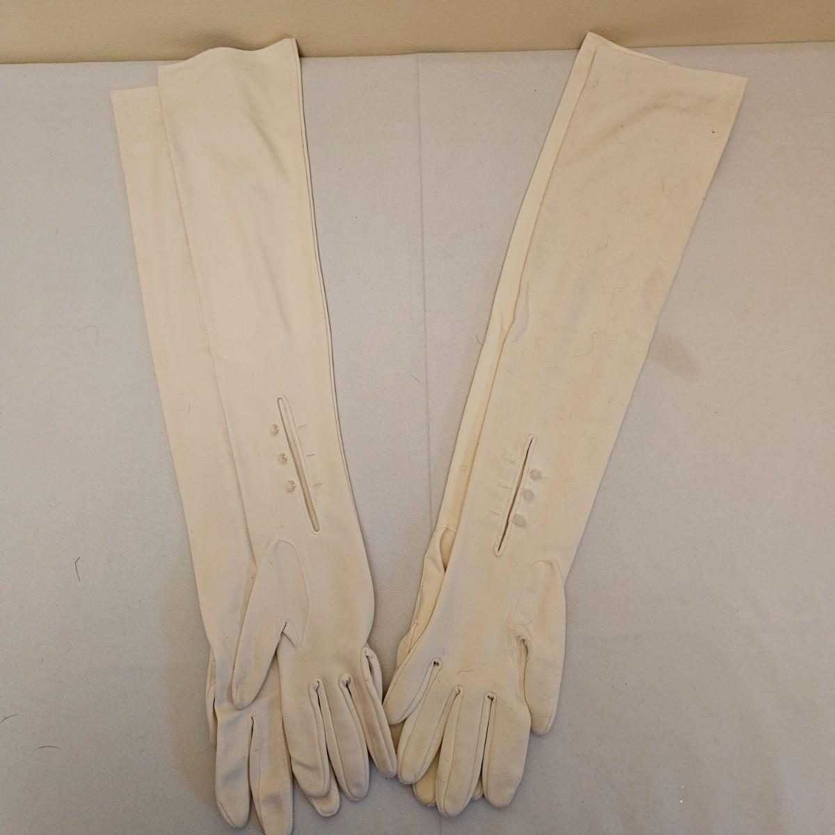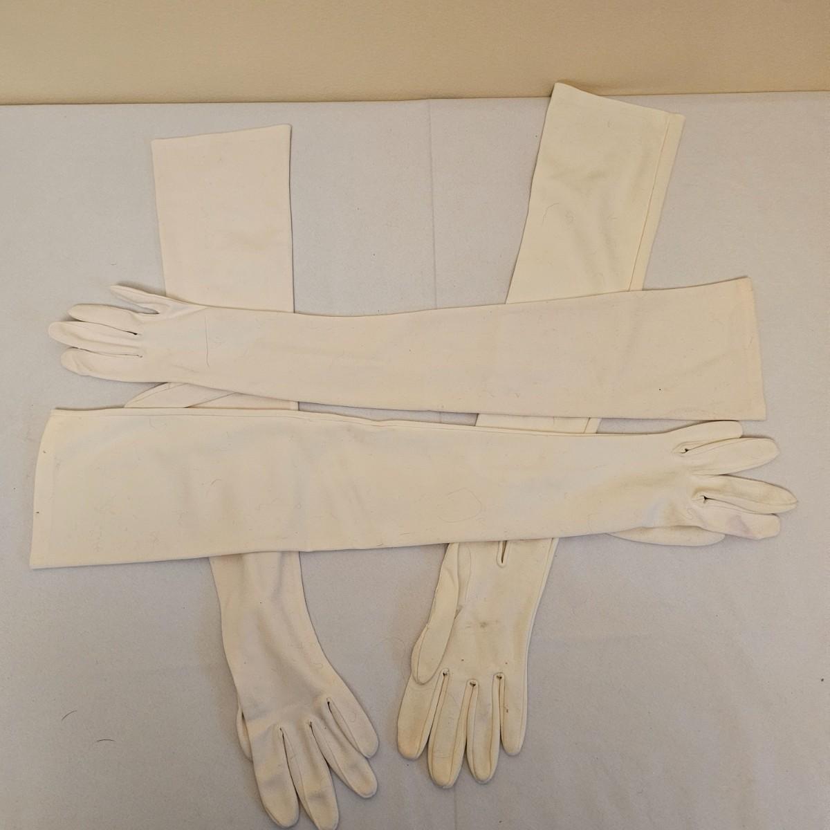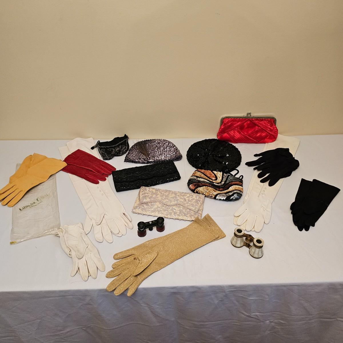 Evening gloves in a variety of colors and lengths and sparkly clutches and hats to complement the look. Two pair of full length opera gloves, both in off white, approximately 24". Black gloves, a pair of red suede, and a pair of women's doeskin gloves. Gold sparkle gloves are 15" length. Beaded and sequined adorned purses in several colors. Most about 10" in length, several lined in silk or satin. Two sequined hats, one a beret and one cap style. Two pair of opera glasses. White and gold Le Fils Paris pair appear to be mother of pearl and brass, measure 4" x 2" x 2.5"H. The other pair is Elyco brand. Some discoloring on both sets. See photos for details. Shipping available.