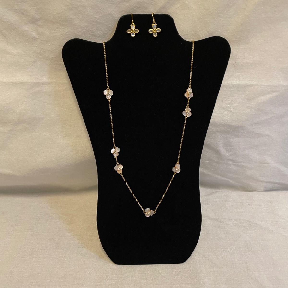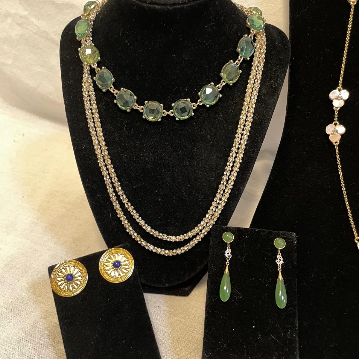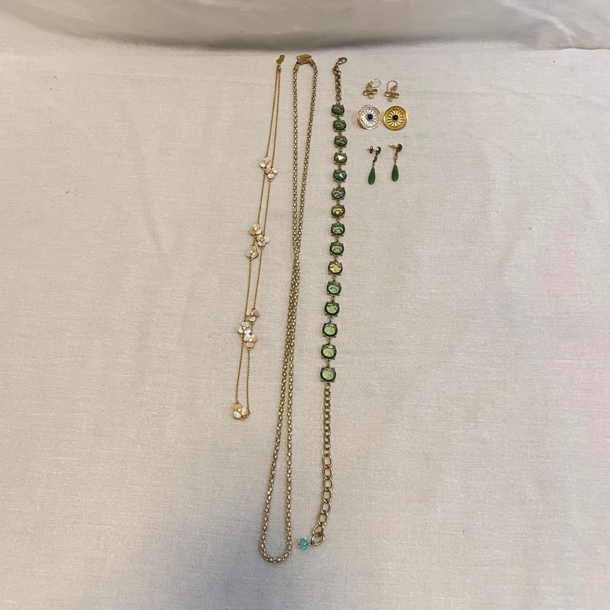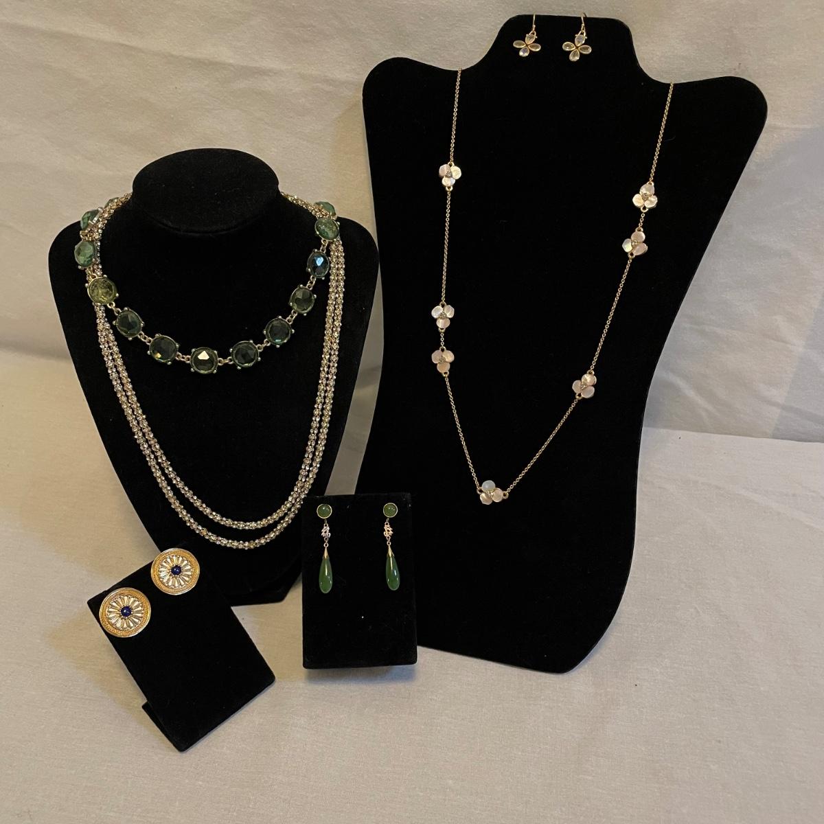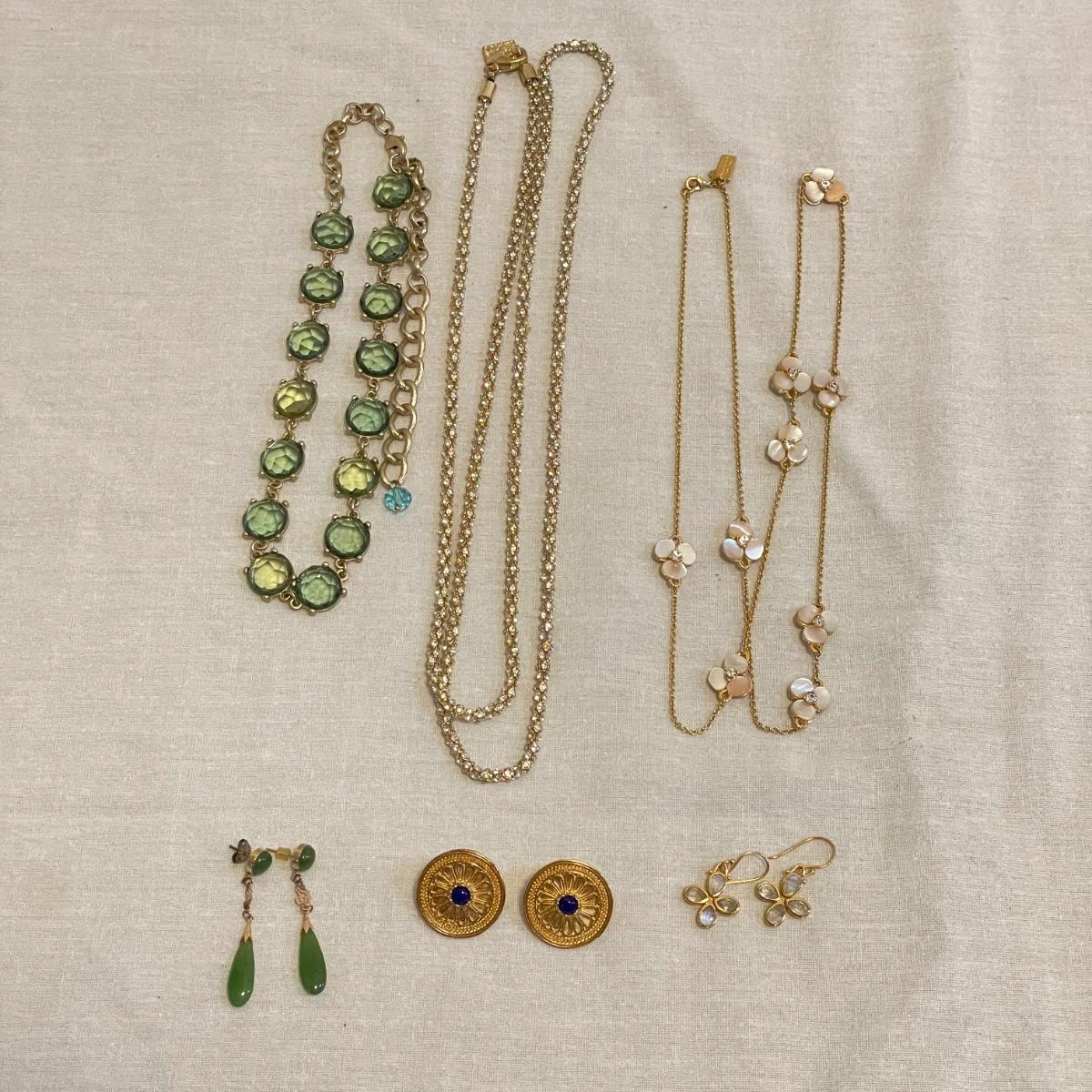 Combinations of necklaces and earrings perfect for evening events or even spruce up the daytime. The long rhinestone rope necklace has an Anne Klein hallmark, the pearlescent floral necklace is marked with the classic Kate Spade emblem. The round earrings appear to be WAG and the others do not have known markings, the green earrings look like jade. The Anne Klein necklace is the longest, just over 40”. Shipping available. All sales are final. No returns or refunds. Please bid accordingly.