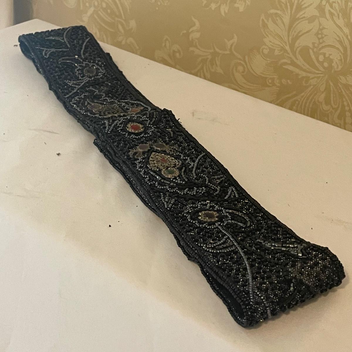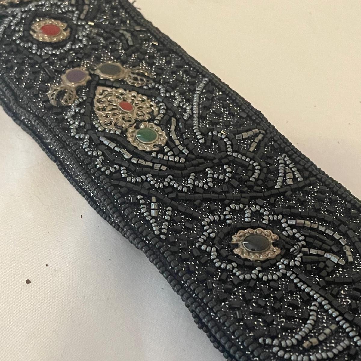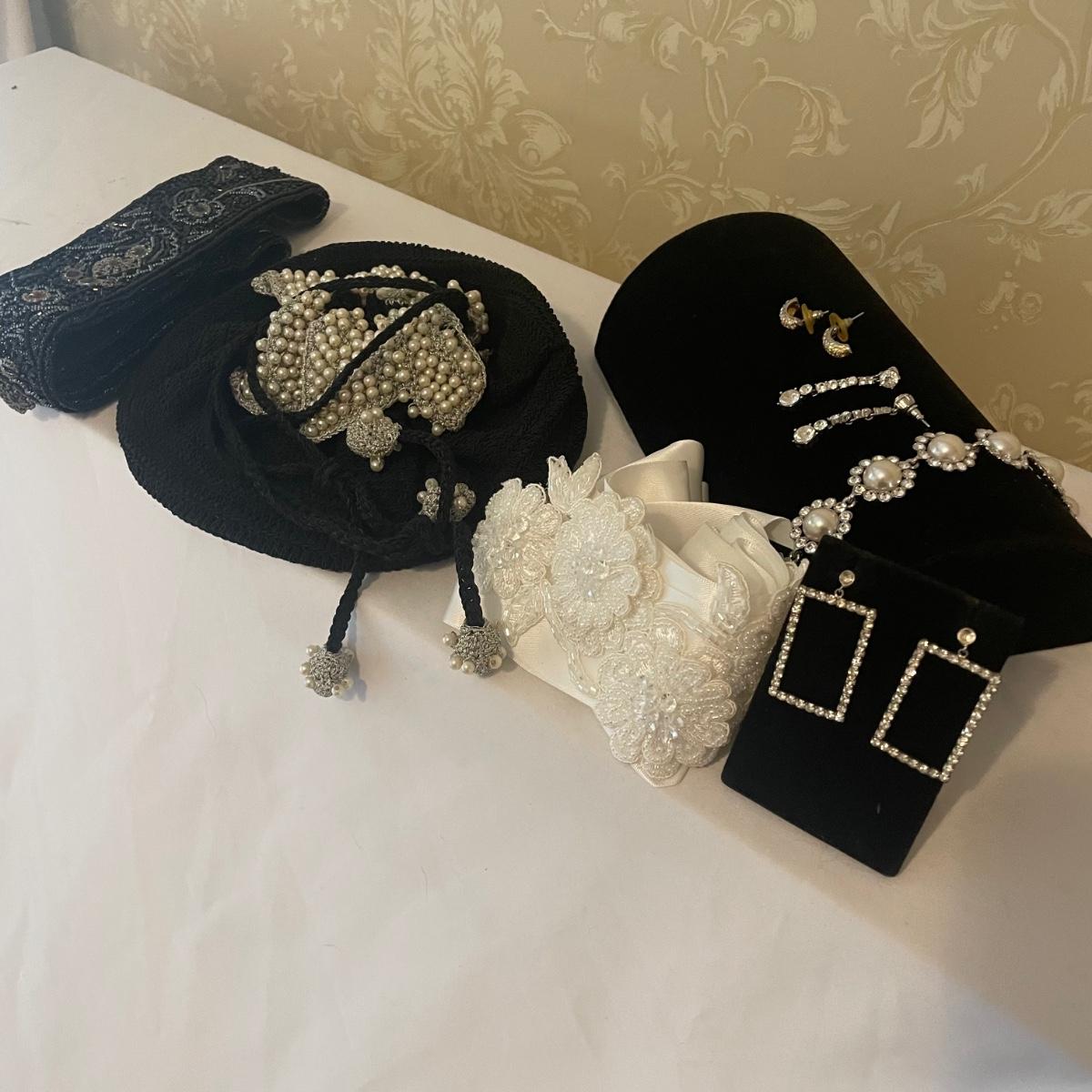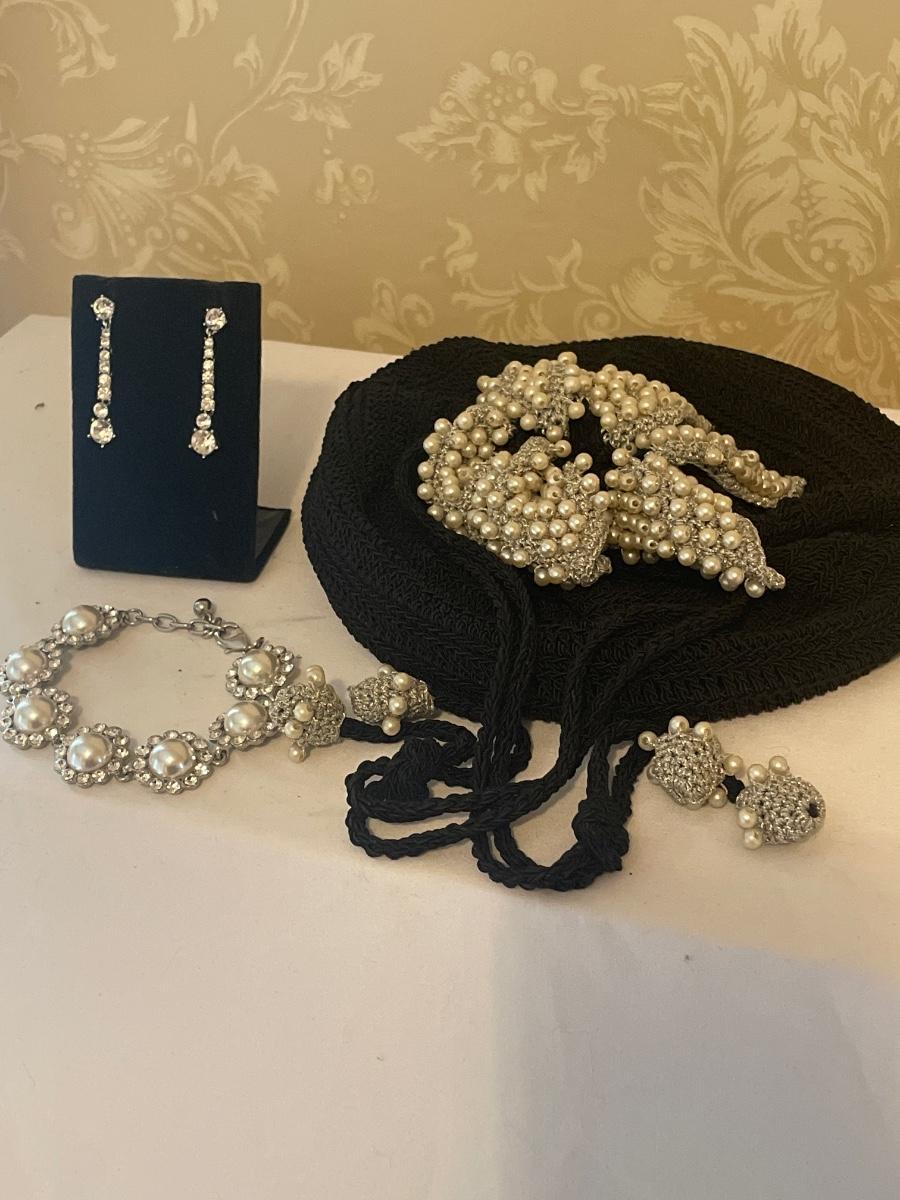 This sparkly assortment of evening wear accessories includes three pairs of diamonte style earrings for pierced ears and a similar style bracelet, along with, a black crocheted purse with bead accents, a black beaded belt (has one loose thread) and a long white sash/belt that’s silk with white beaded embellishments.