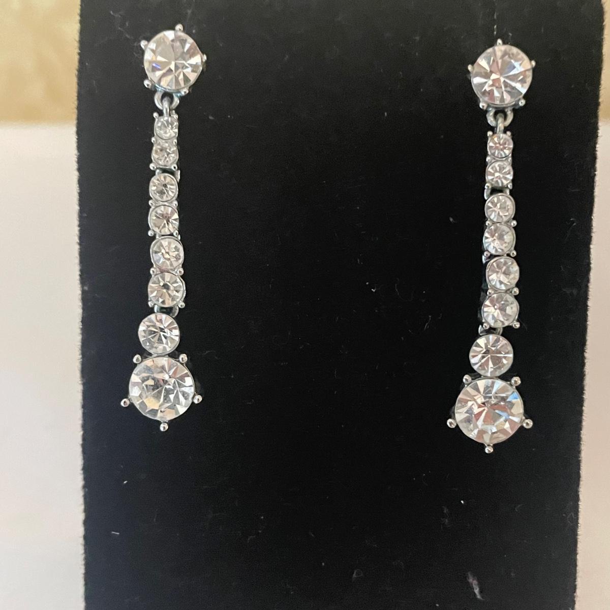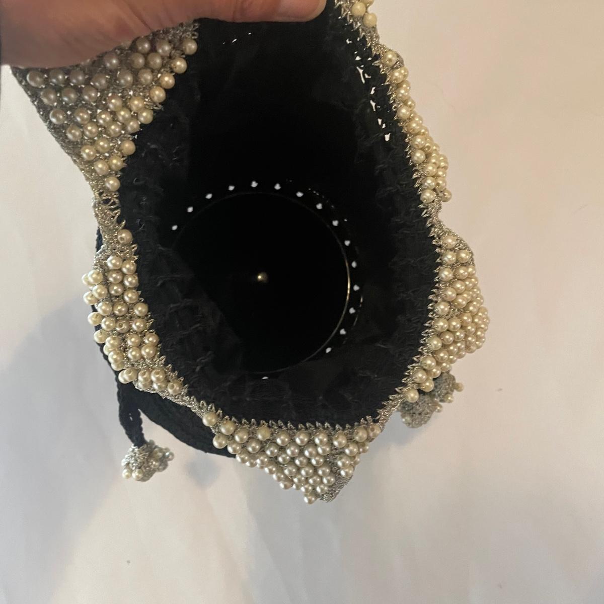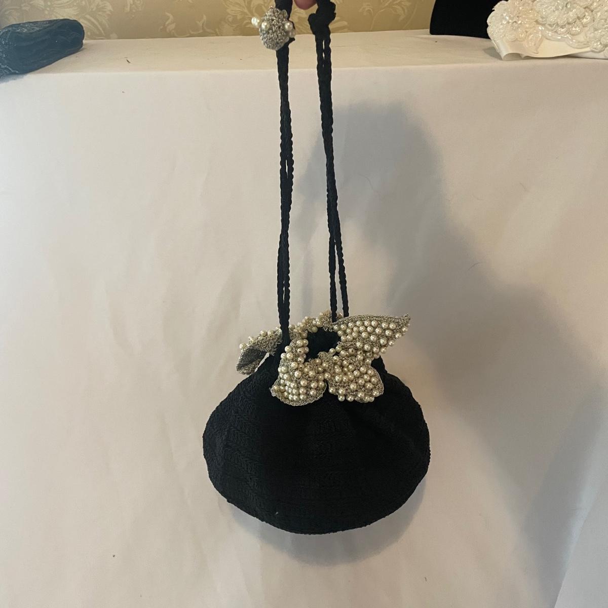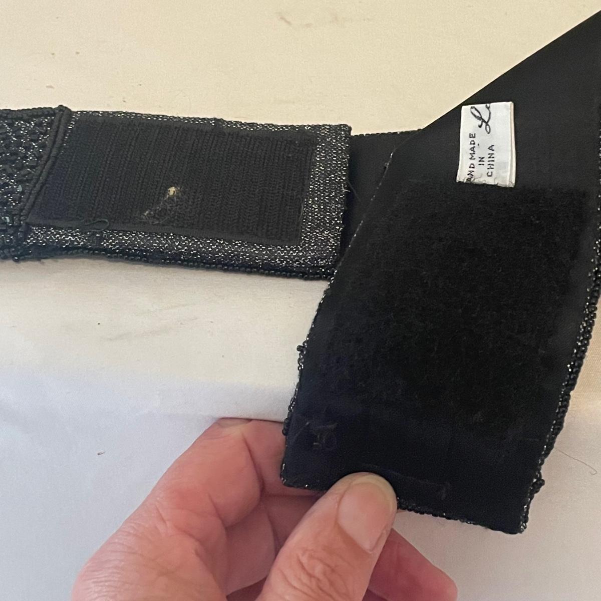 This sparkly assortment of evening wear accessories includes three pairs of diamonte style earrings for pierced ears and a similar style bracelet, along with, a black crocheted purse with bead accents, a black beaded belt (has one loose thread) and a long white sash/belt that’s silk with white beaded embellishments.