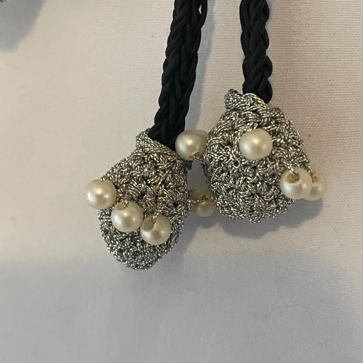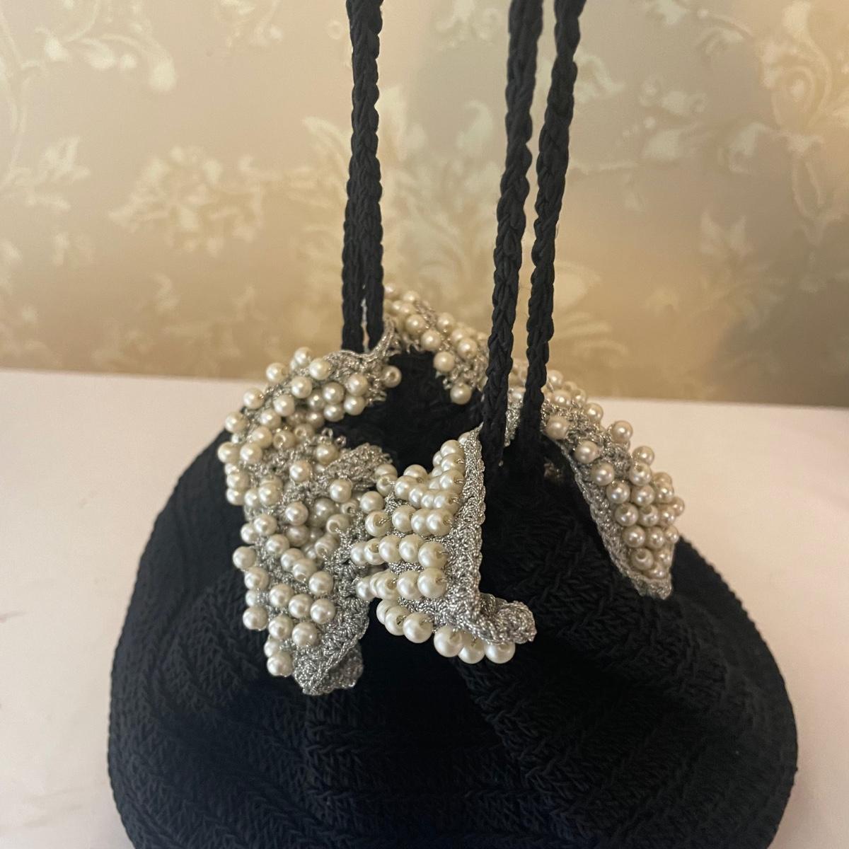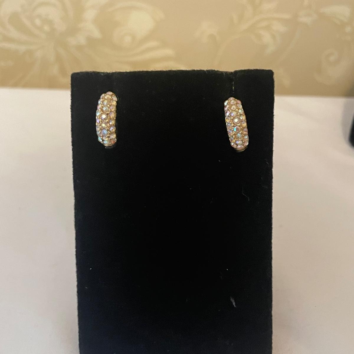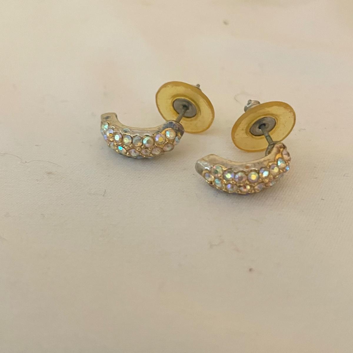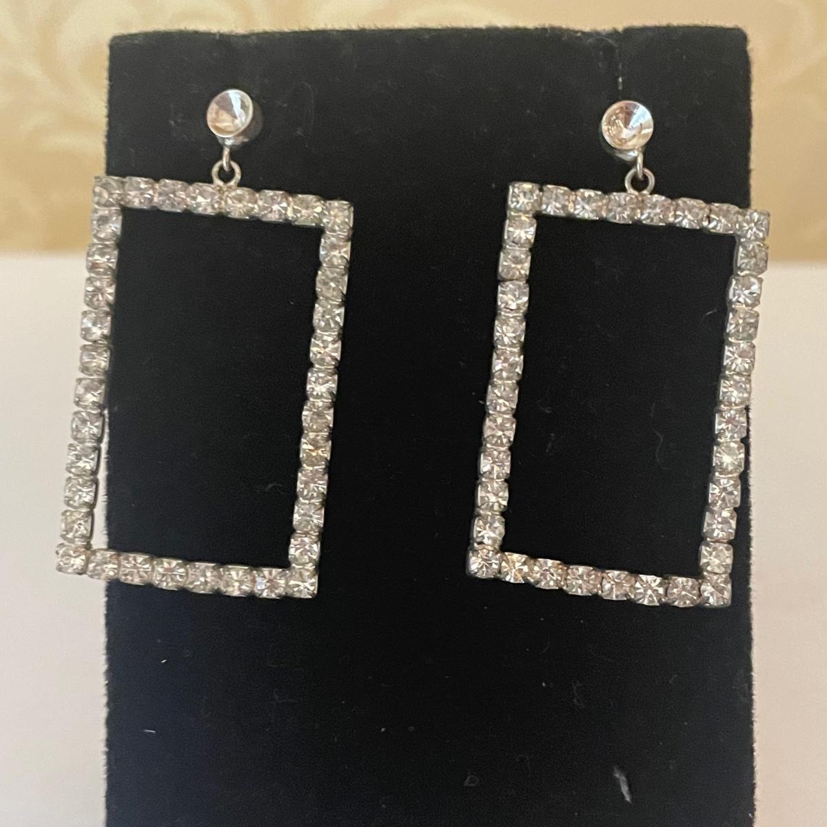 This sparkly assortment of evening wear accessories includes three pairs of diamonte style earrings for pierced ears and a similar style bracelet, along with, a black crocheted purse with bead accents, a black beaded belt (has one loose thread) and a long white sash/belt that’s silk with white beaded embellishments.