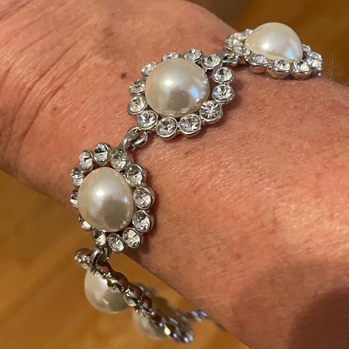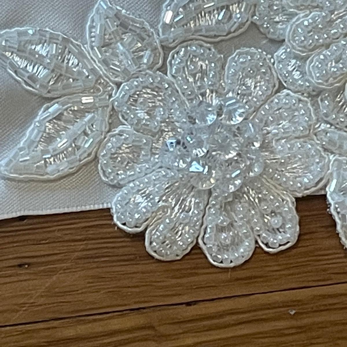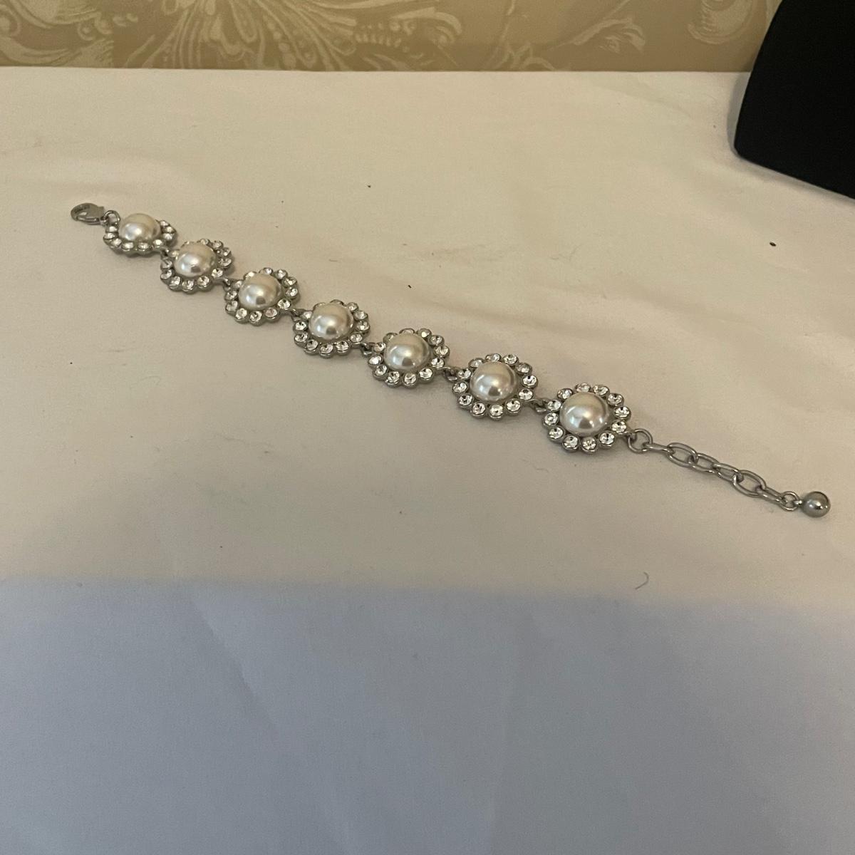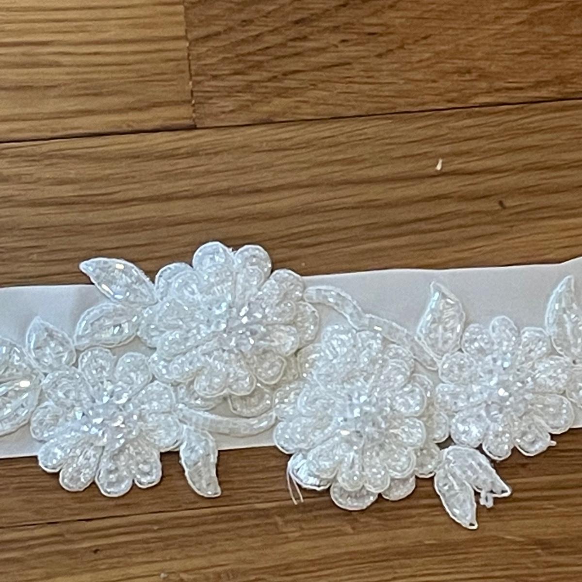 This sparkly assortment of evening wear accessories includes three pairs of diamonte style earrings for pierced ears and a similar style bracelet, along with, a black crocheted purse with bead accents, a black beaded belt (has one loose thread) and a long white sash/belt that’s silk with white beaded embellishments.