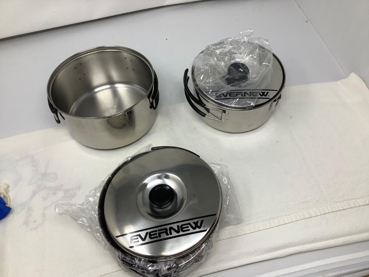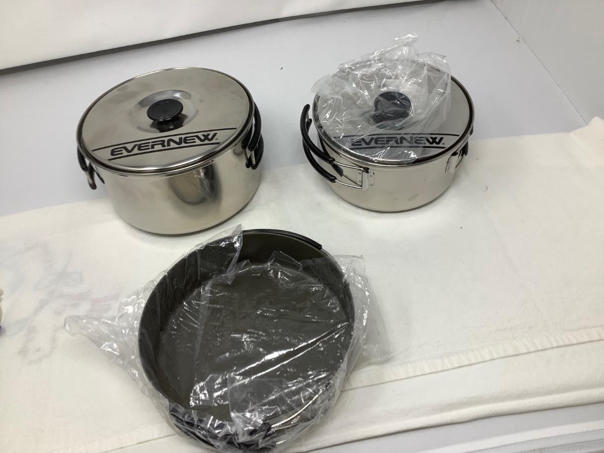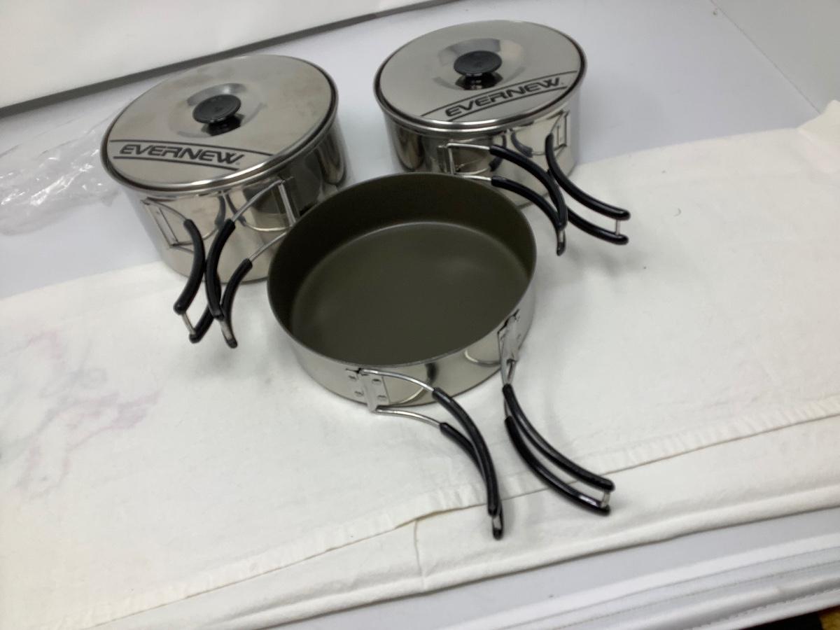 You get this great camping cookware set two pots and a pan with covers and handles. Evernew stainless cook set. Brand new never used.