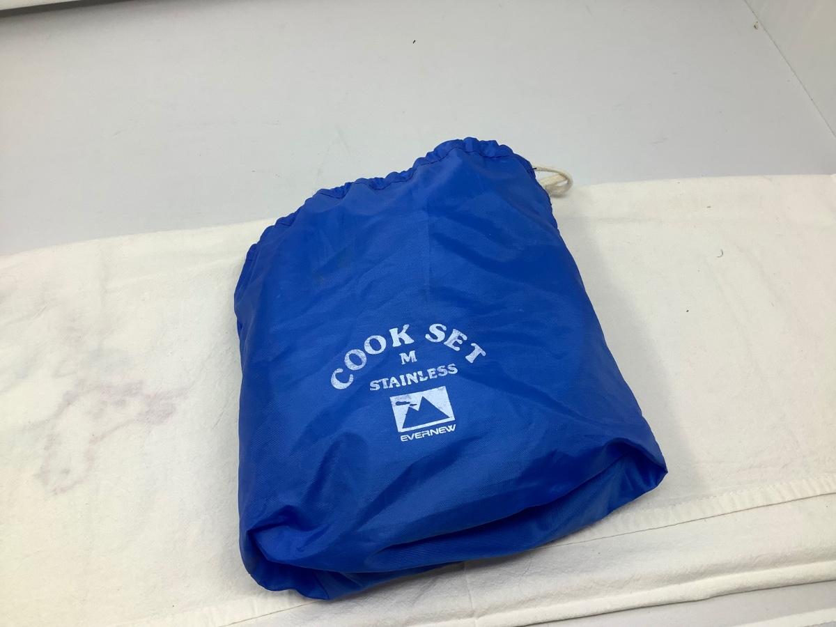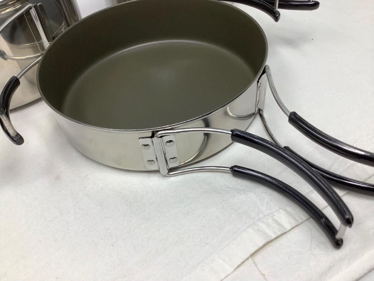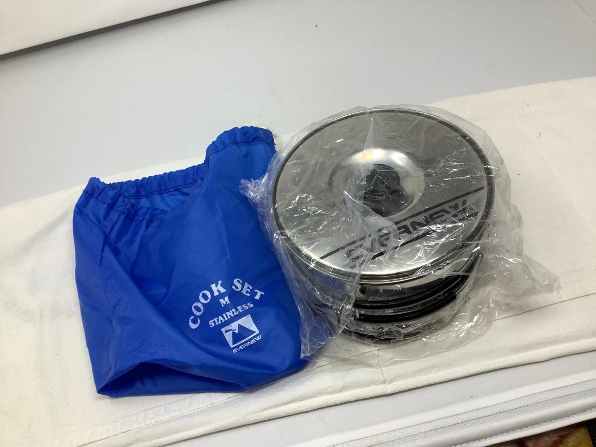 You get this great camping cookware set two pots and a pan with covers and handles. Evernew stainless cook set. Brand new never used.