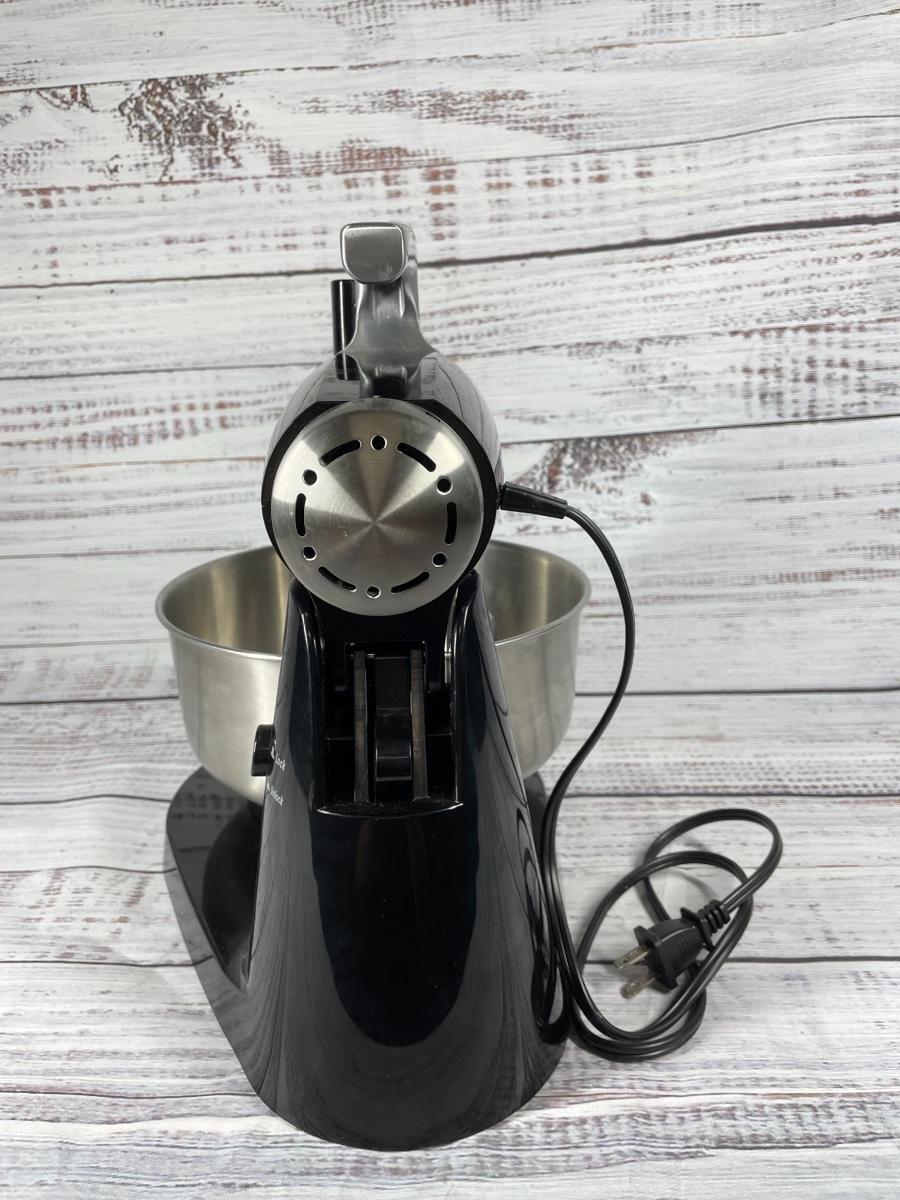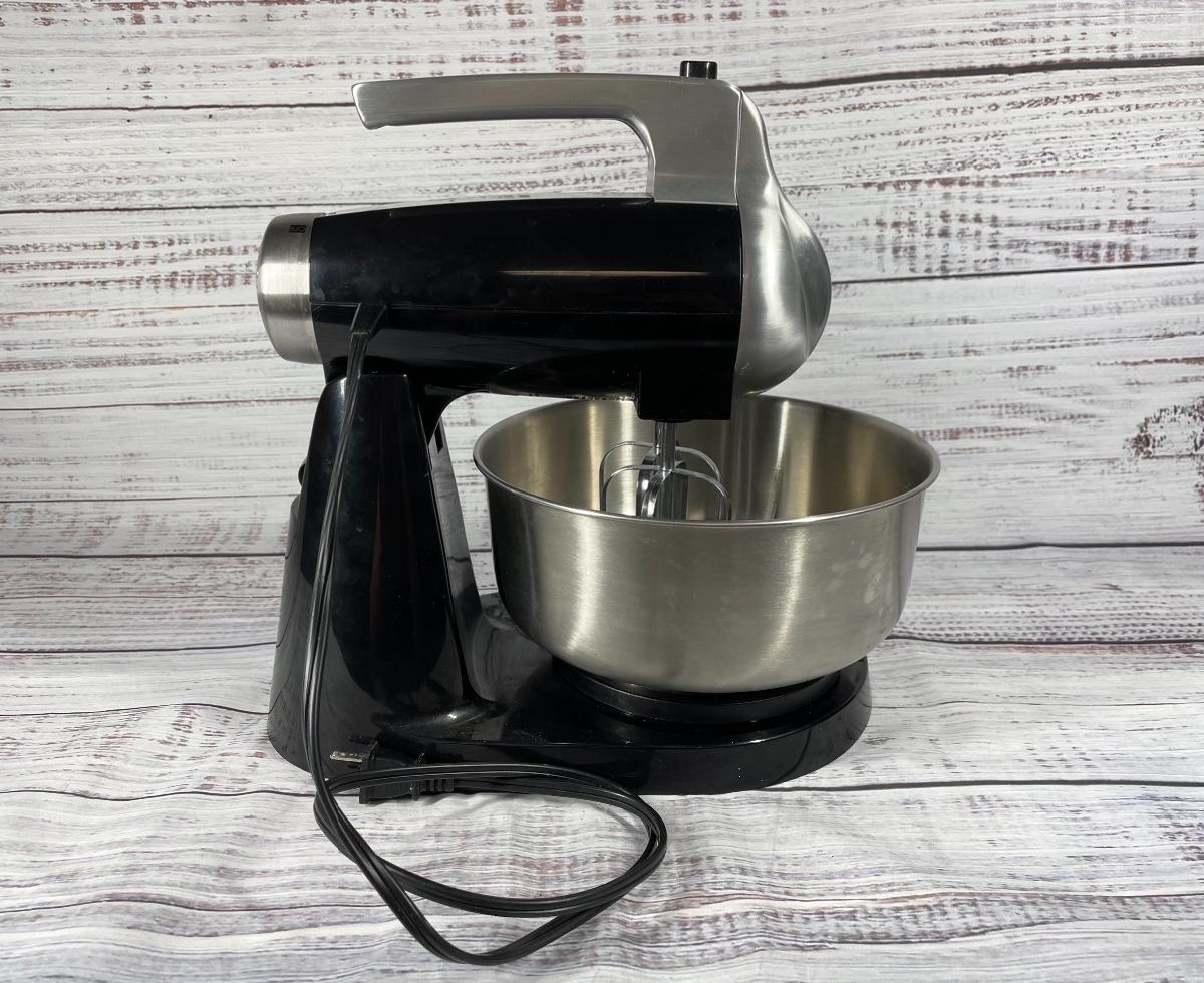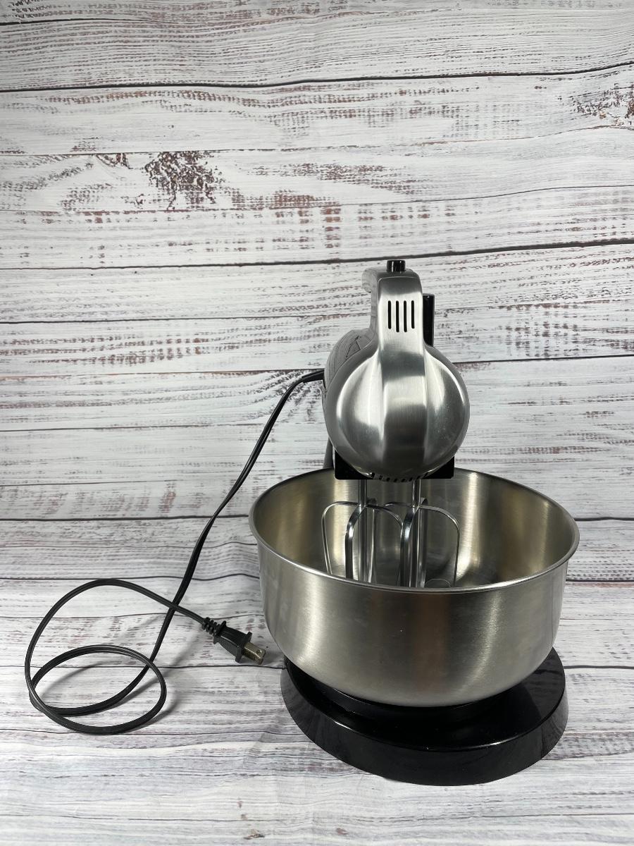 Mixer is In great condition. Item’s highest mixing level is a 12. It comes with a steel bowl to mix things in. Item plugs into a wall, the plug is not that long.
