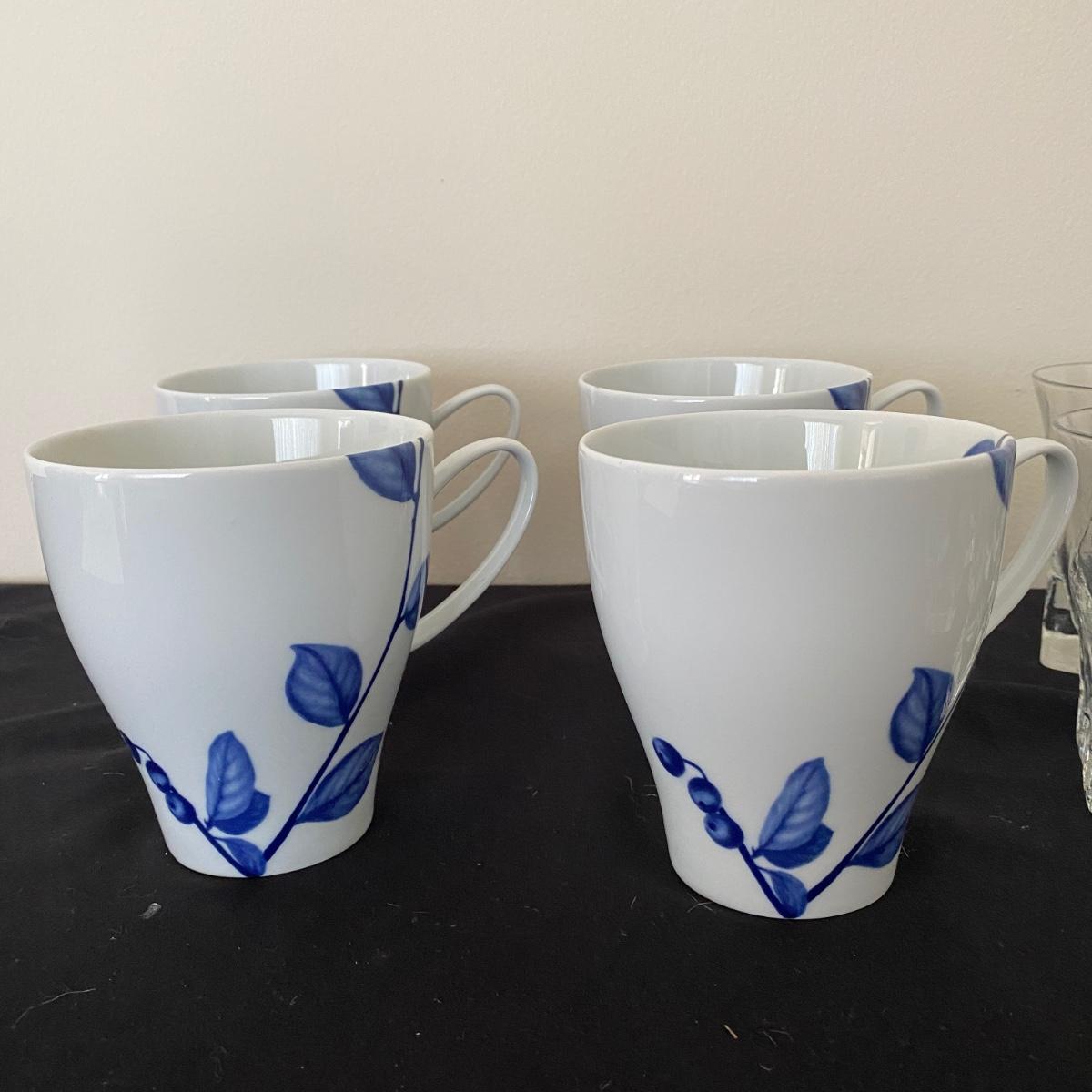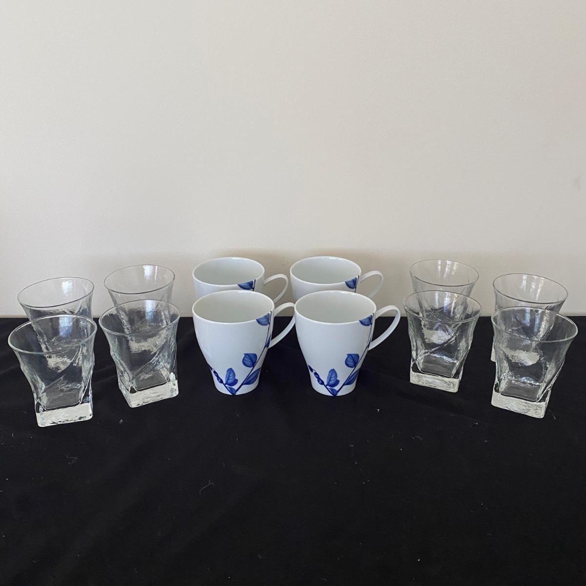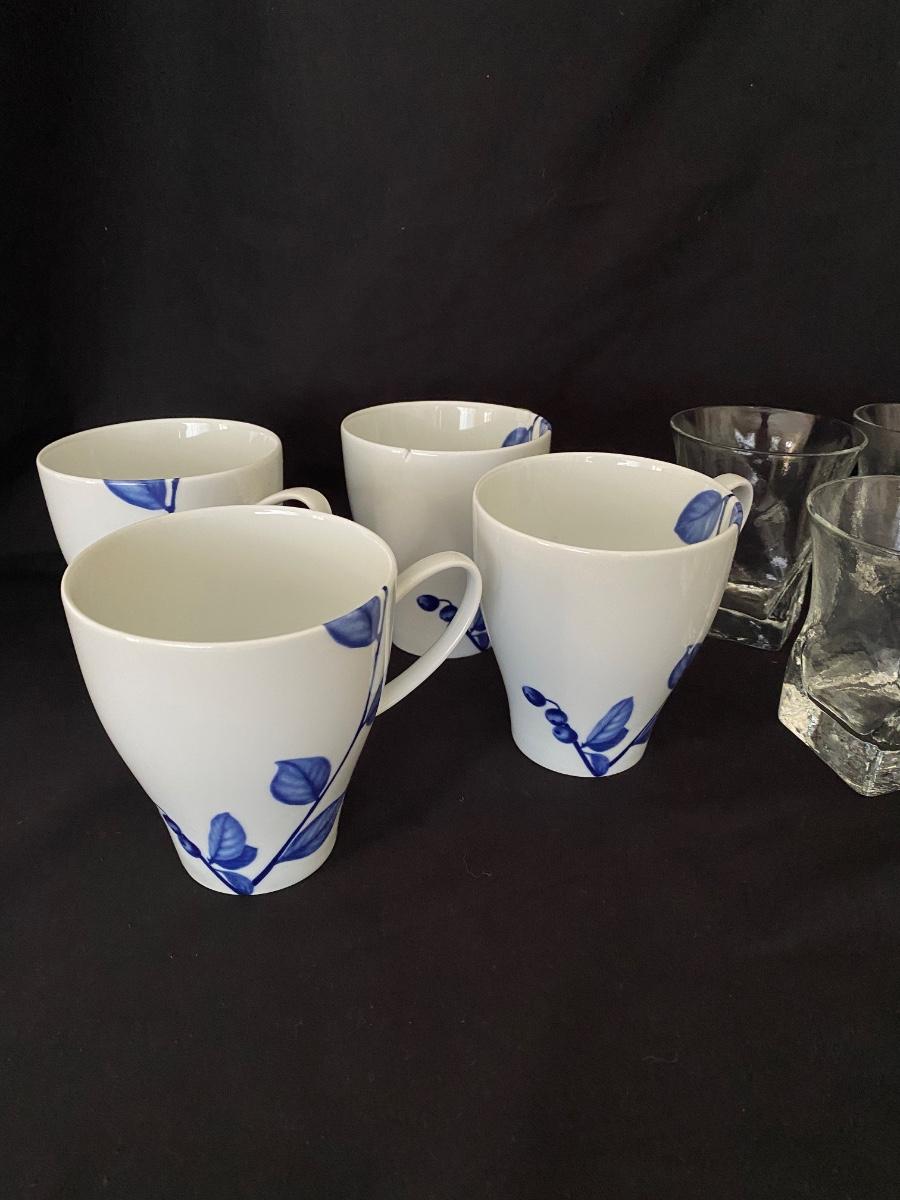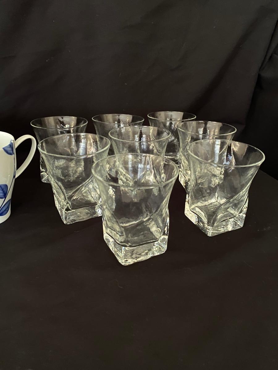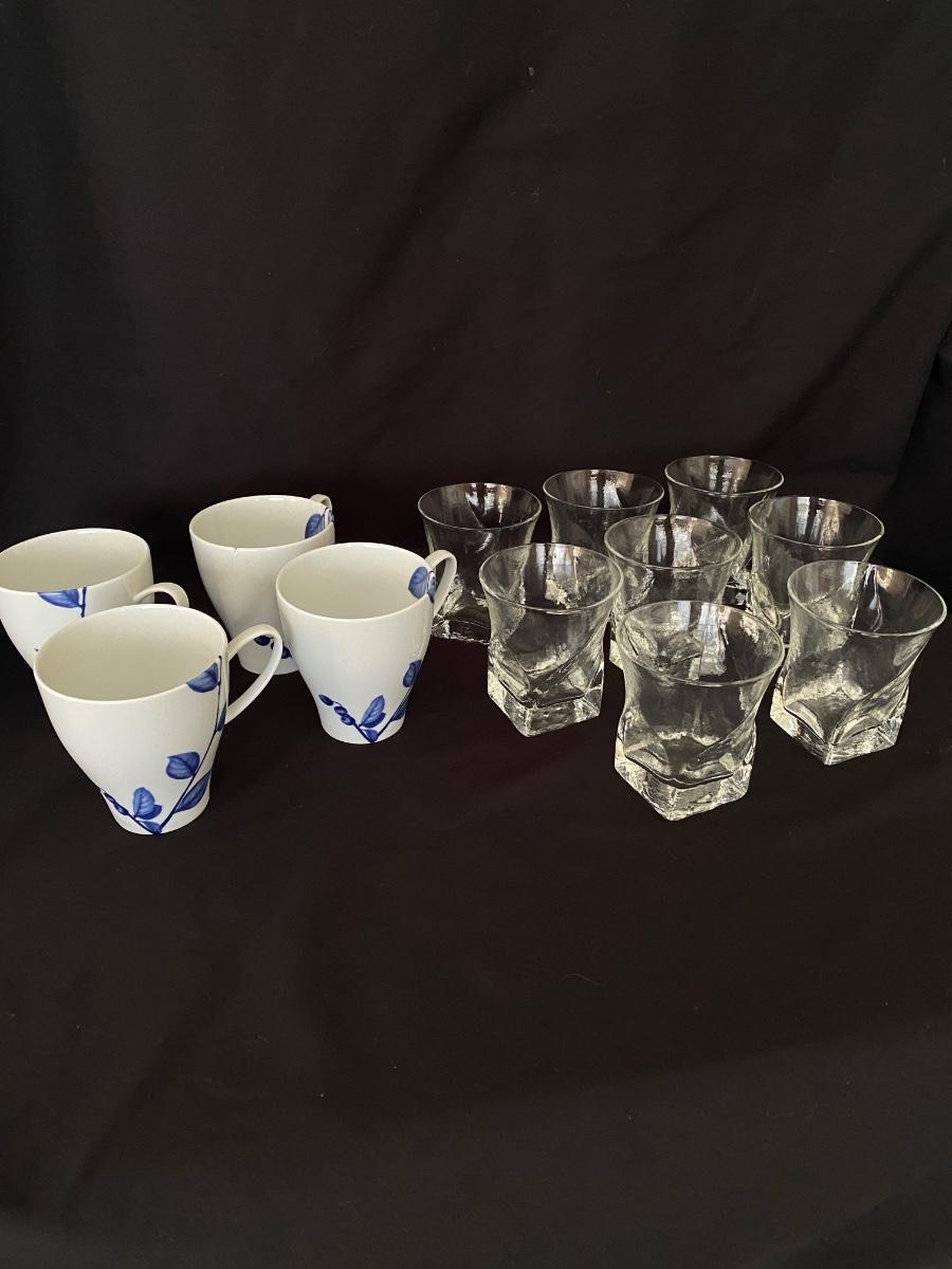 8 heavy drinking glasses. One has small chip. 4 Mikasa coffee mugs. Glasses measure 4” tall.Shipping available