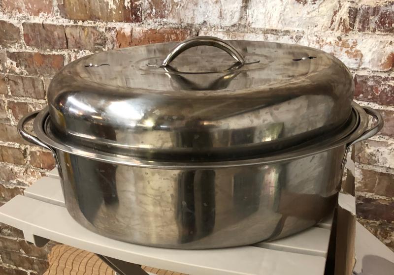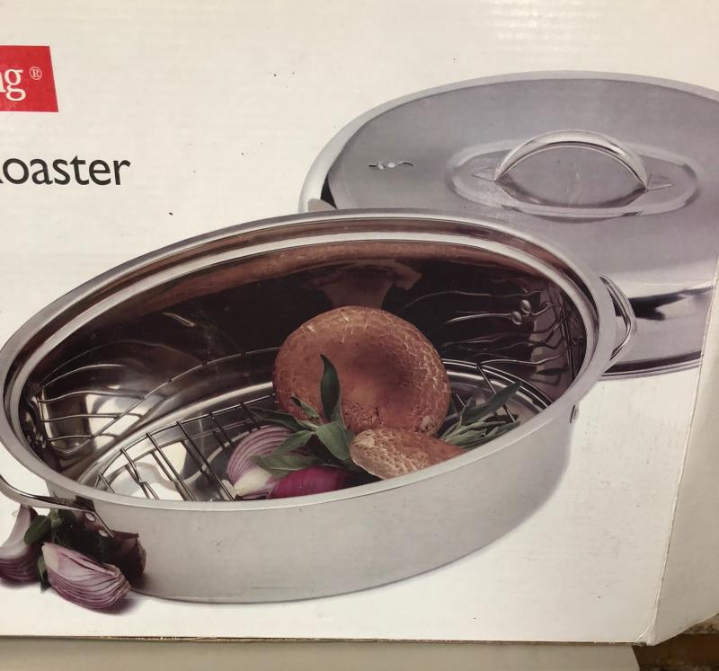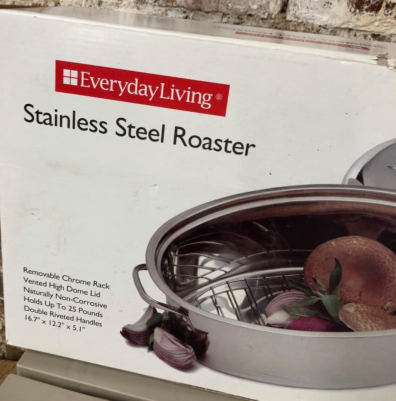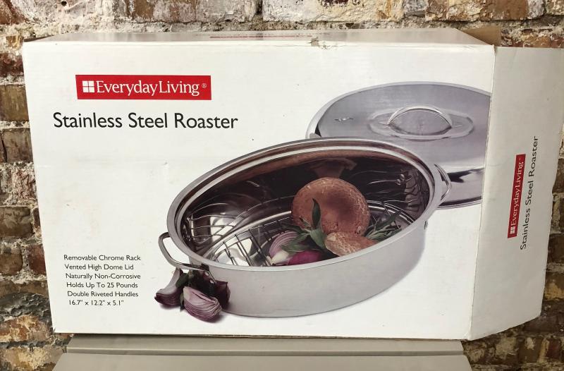 New in the box here is an Everyday Living STAINLESS STEEL ROASTER...Removable Chrome Rack..Vented High Dome Lid..Non-Corrosive..Holds up to 25 lbs..16.7 x 12.2 x 5.1"...