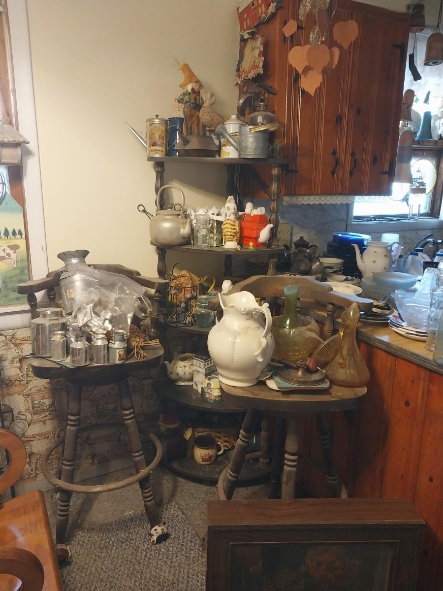 WOODEN TEA CART, BAR STOOLS, SEVERAL TIERED CARTS, CORNER SHELF, ROCKING CHAIR, 3 SETS OF SILVERWARE (1 IS A HUGE SIAM SET) CHICKENS, ROOSTERS, COWS, HALL CASSEROLE DISSH W/LID, TEAPOTS, HORSE COLLAR WALL MIRROR, CHROME METAL MIRROR, WOODEN BASKETS AND MUCH MORE