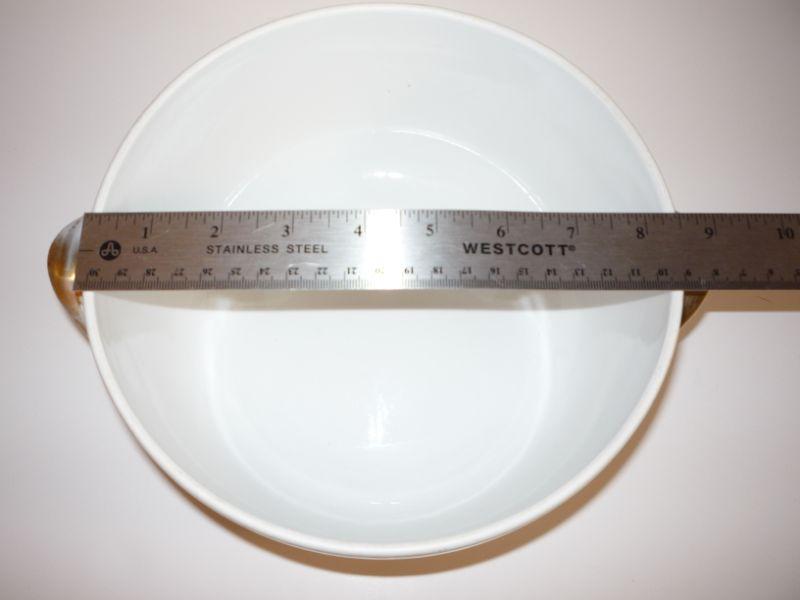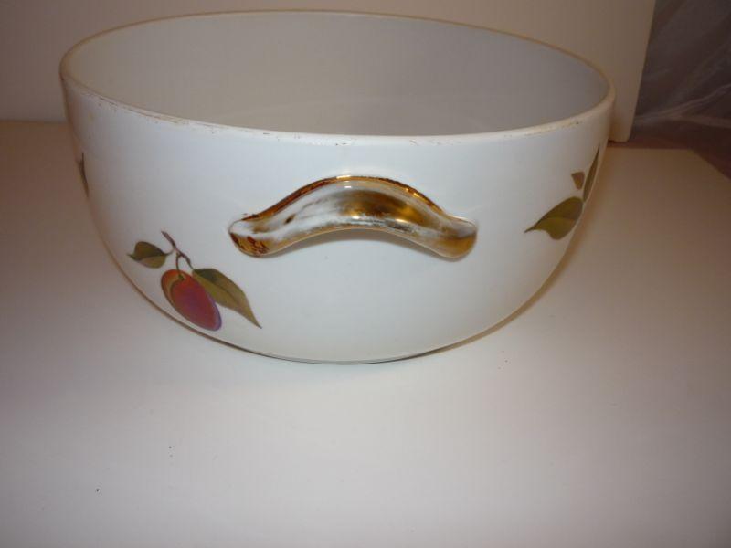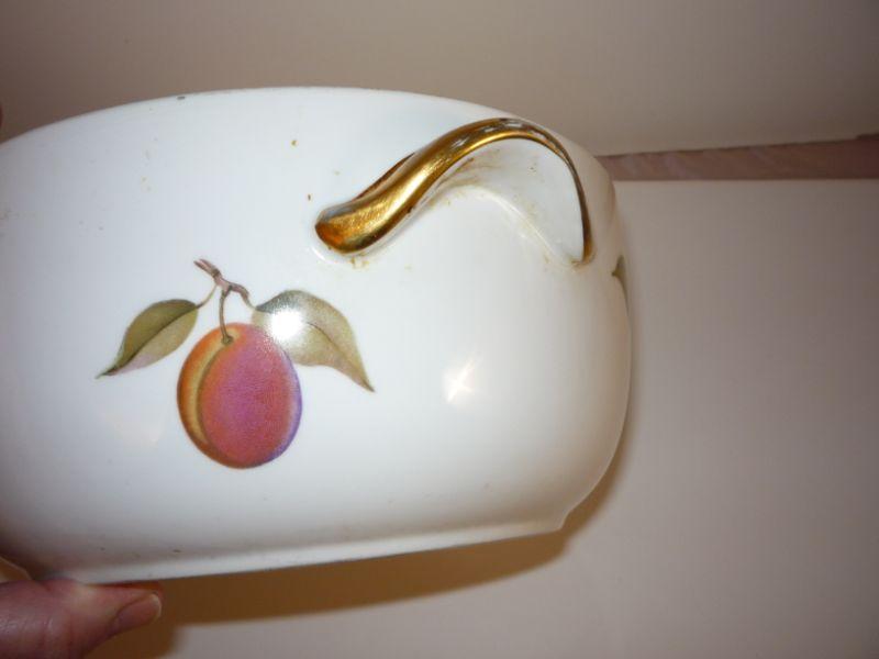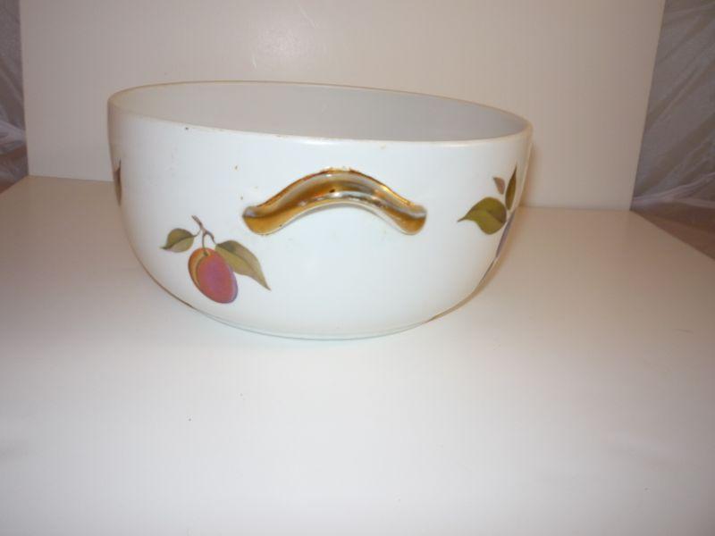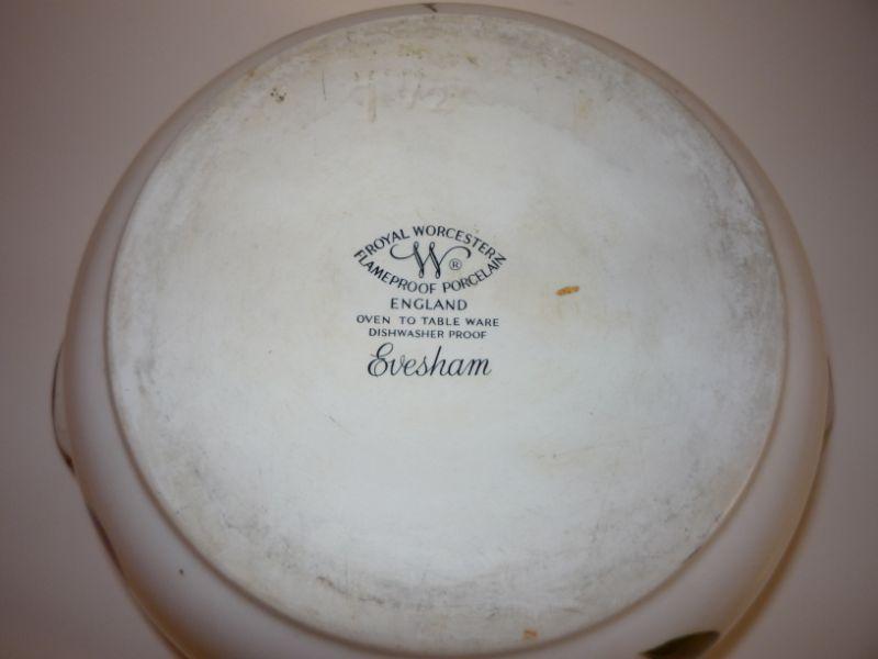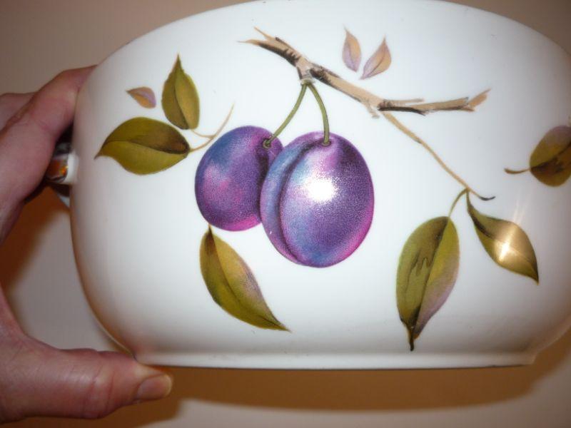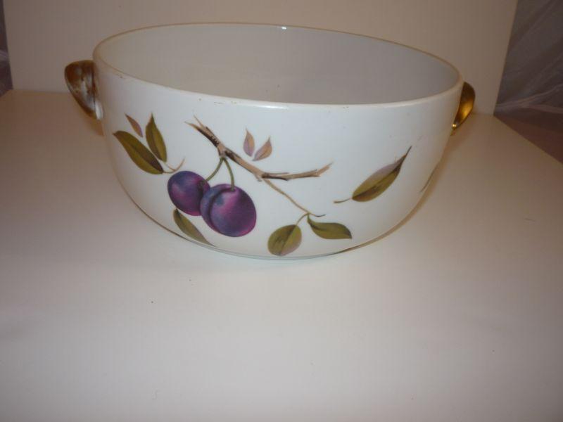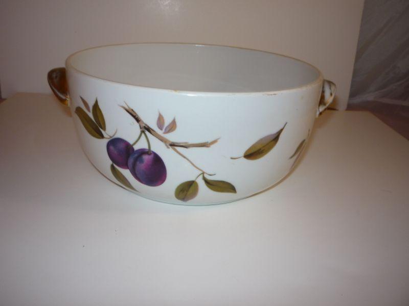 8.5 inches - double handle - oven to table - Evesham Royal Worcester - Fruit pattern plums and nectarines - dishwasher proof. Perfect condition - no chips or crazing.