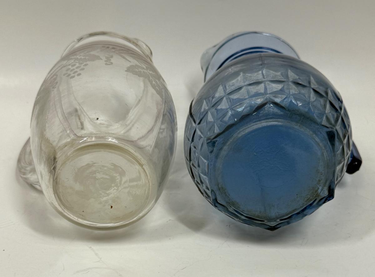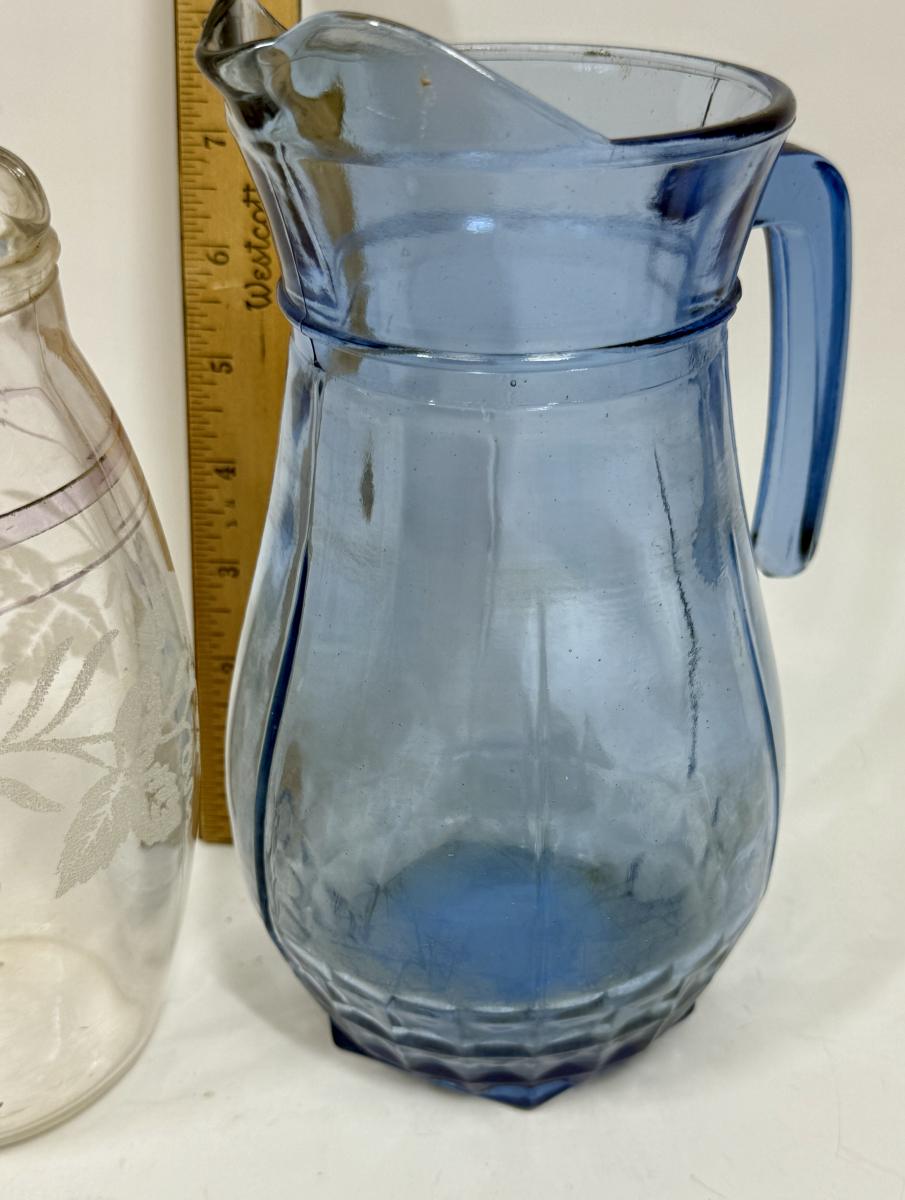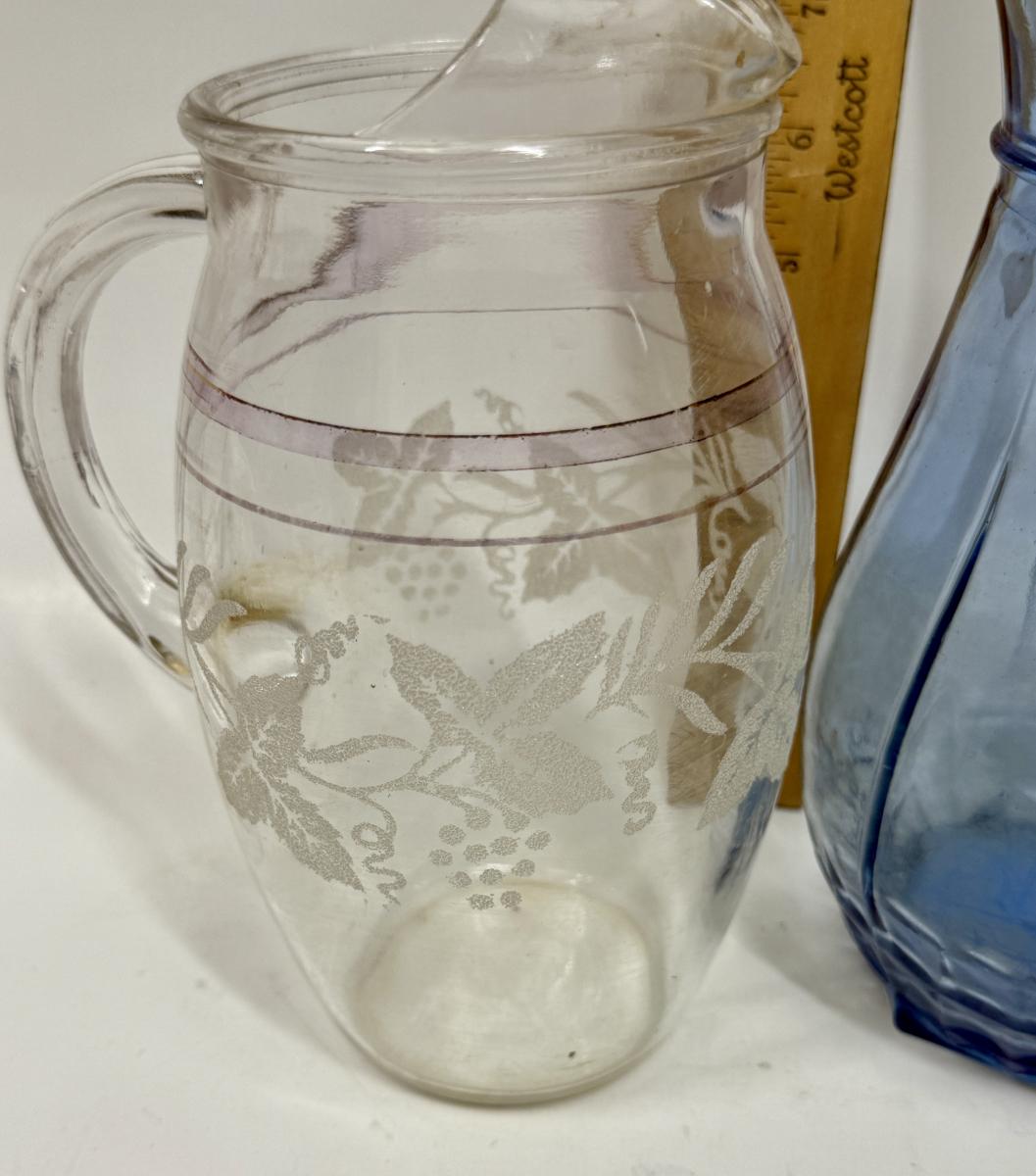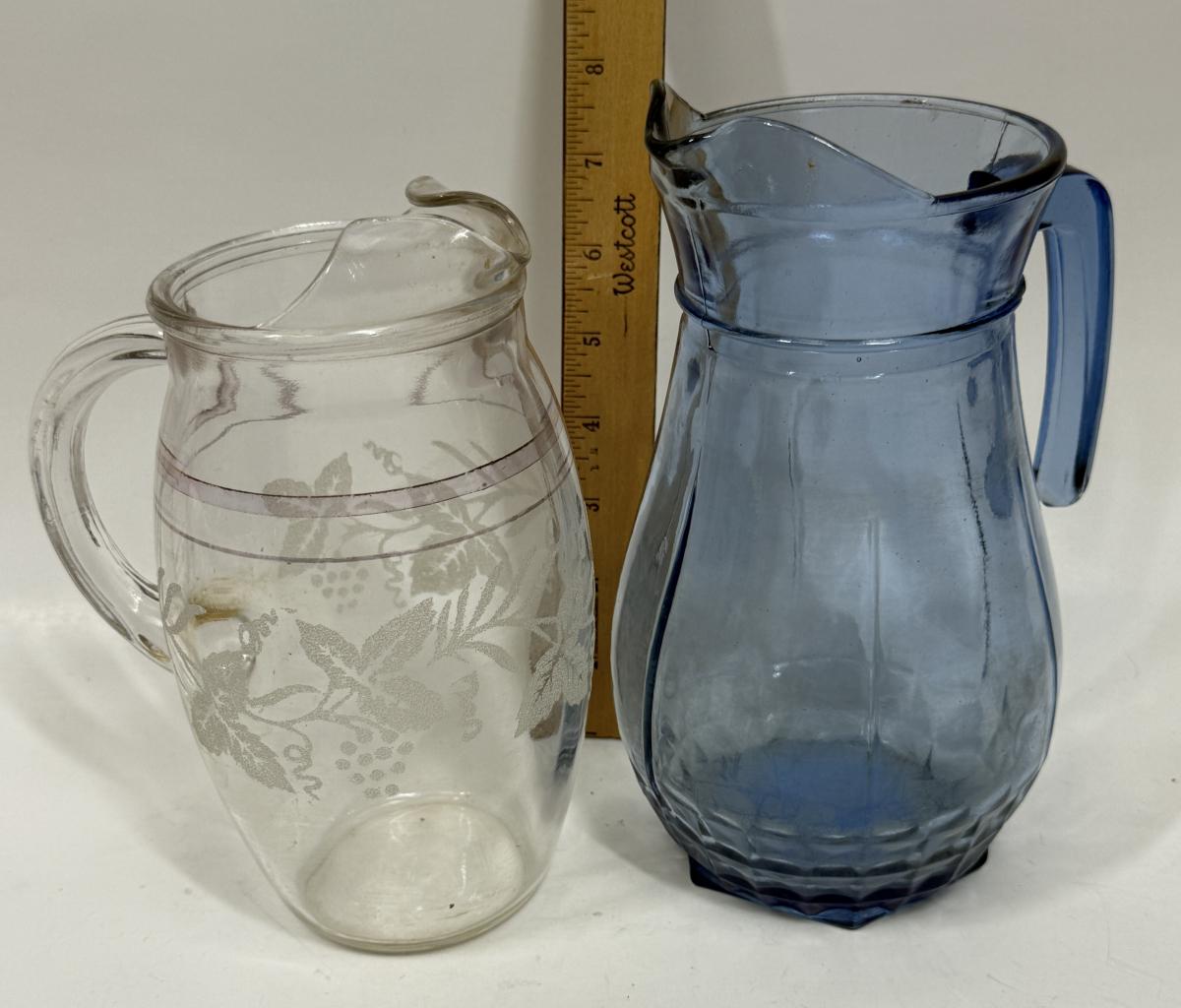 Vintage Pair of Glass Pitchers: Bartlet Collins Etched Pitcher and MCM Blue Glass pitcher