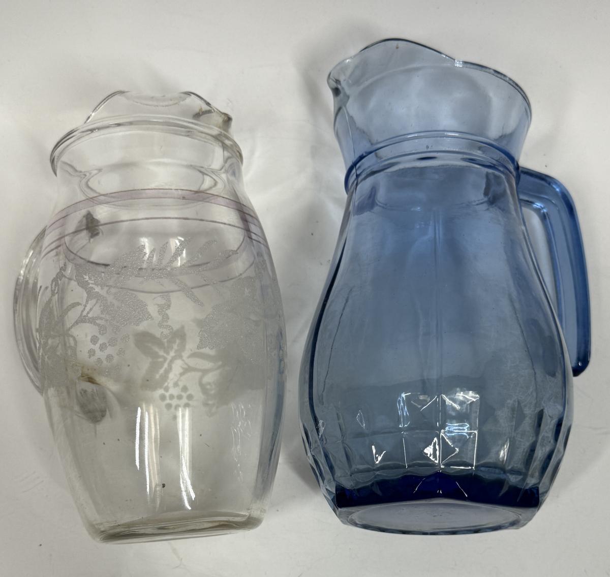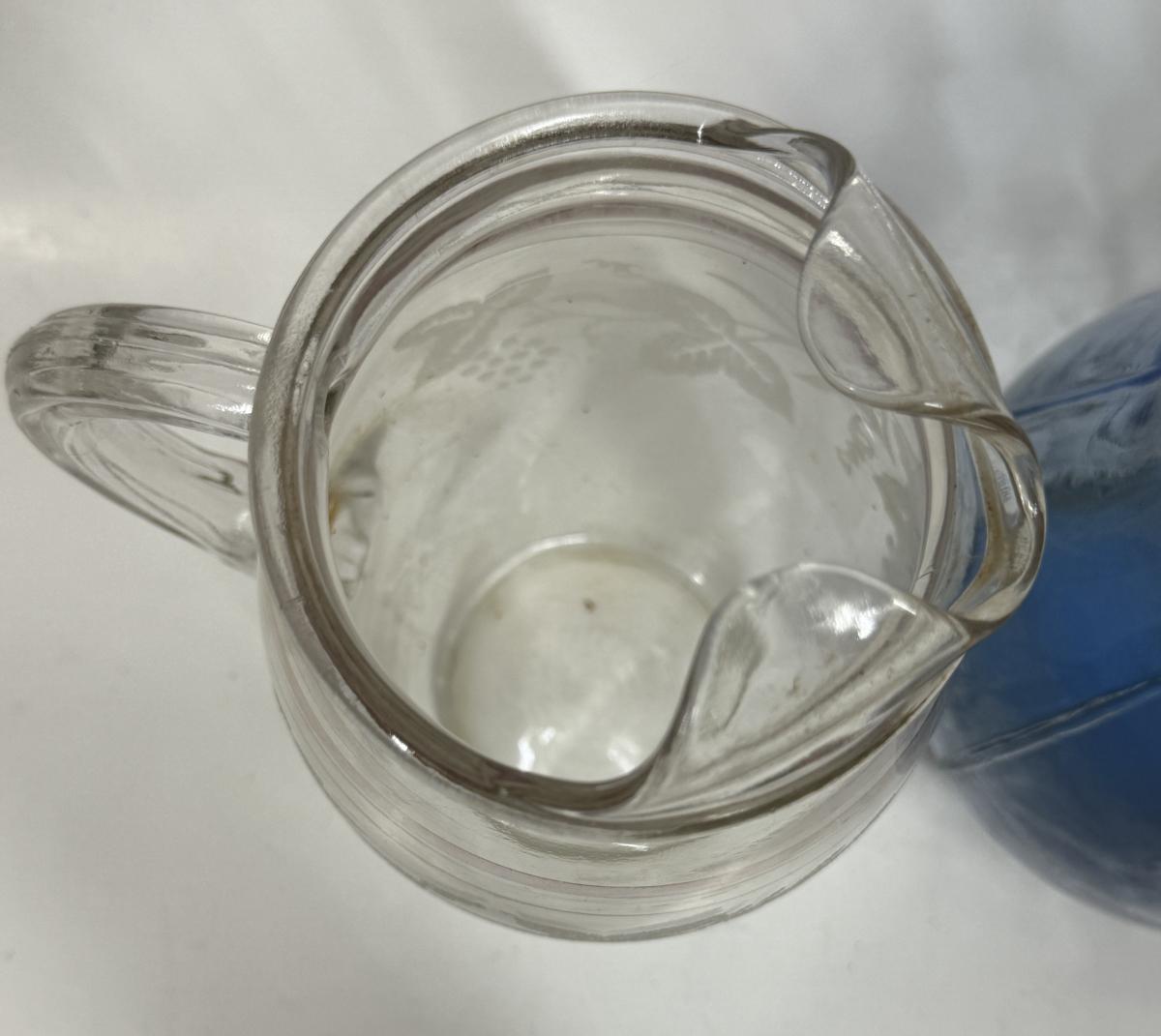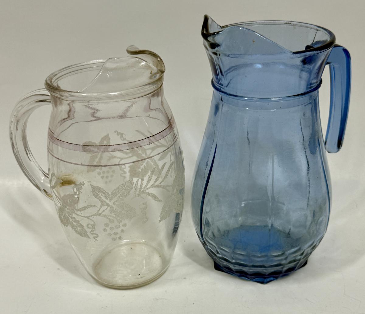 Vintage Pair of Glass Pitchers: Bartlet Collins Etched Pitcher and MCM Blue Glass pitcher