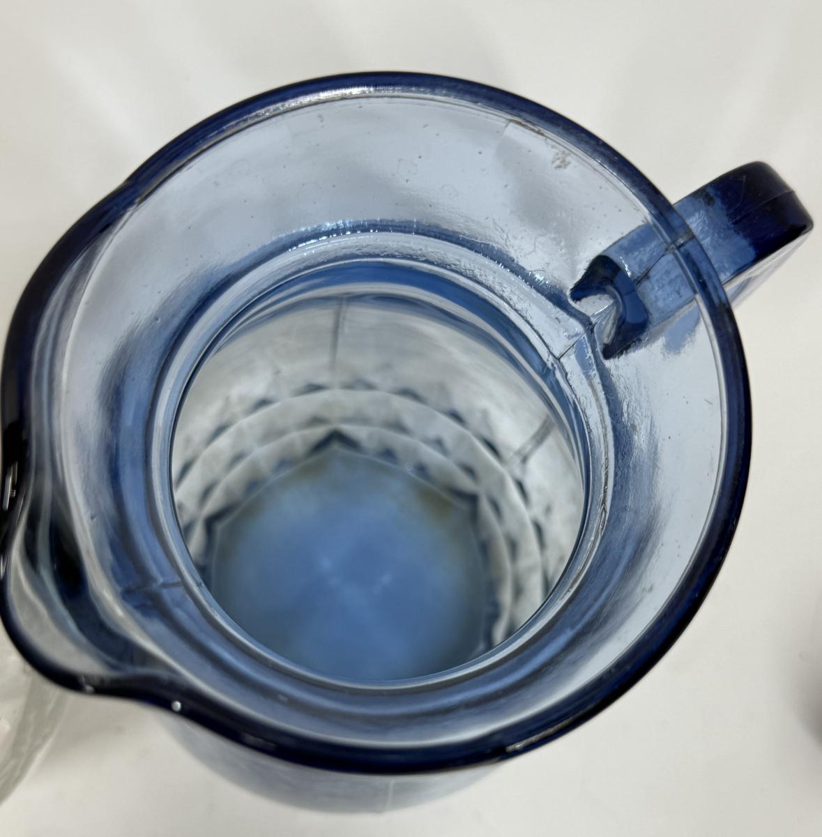 Light Blue Glass Pitcher, approx. 8" tall, Clear Glass Bartlet Collins Pitcher is approx. 7" tall. Both in good condition.