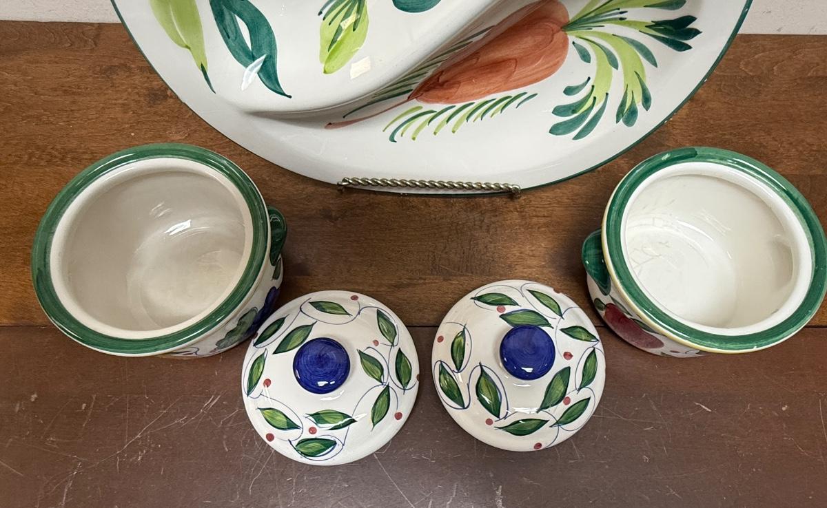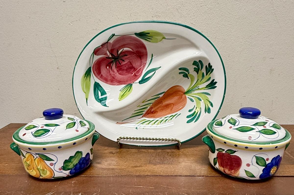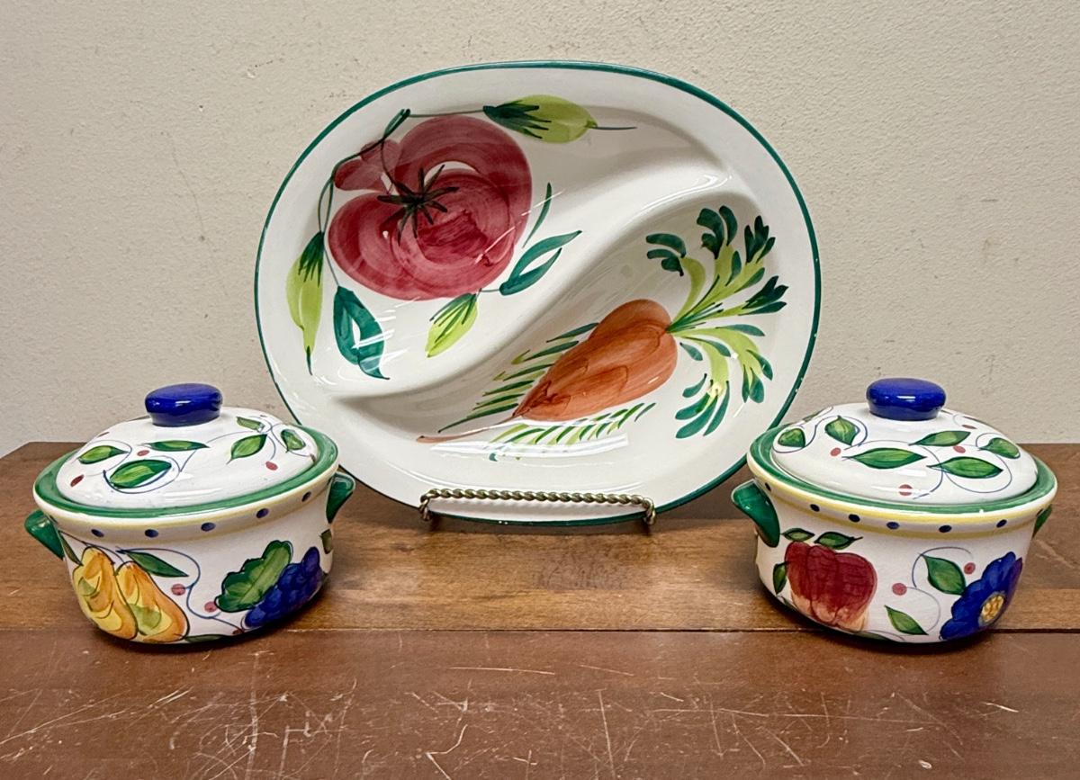 Ceramic Pottery Divided Serving Bowl and two crock bowls with lids