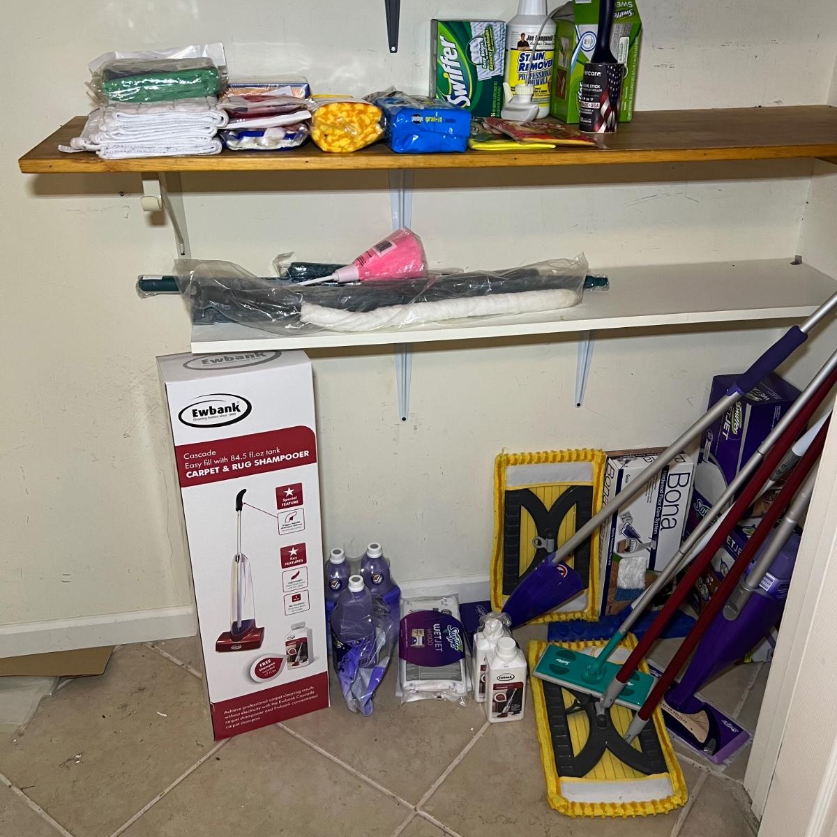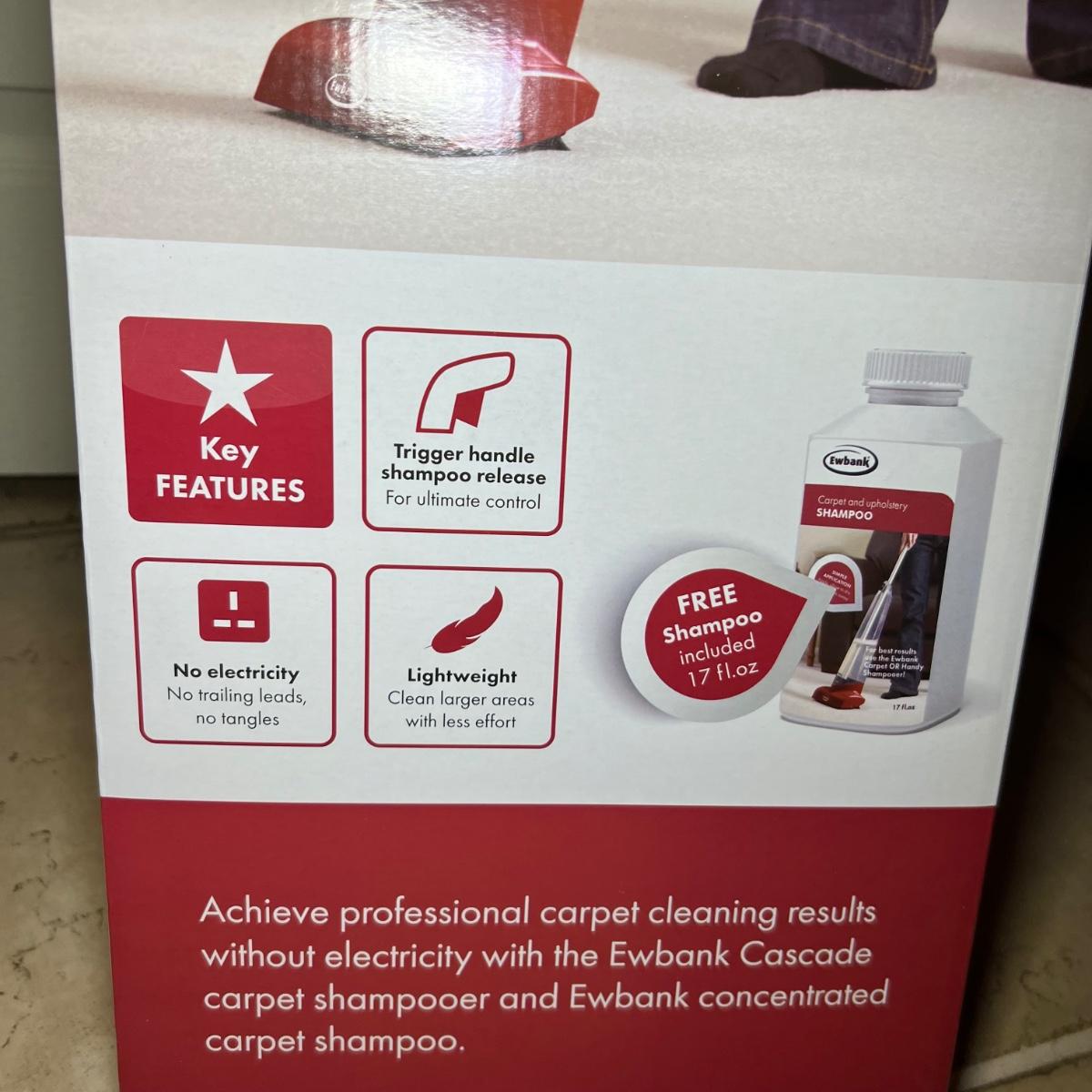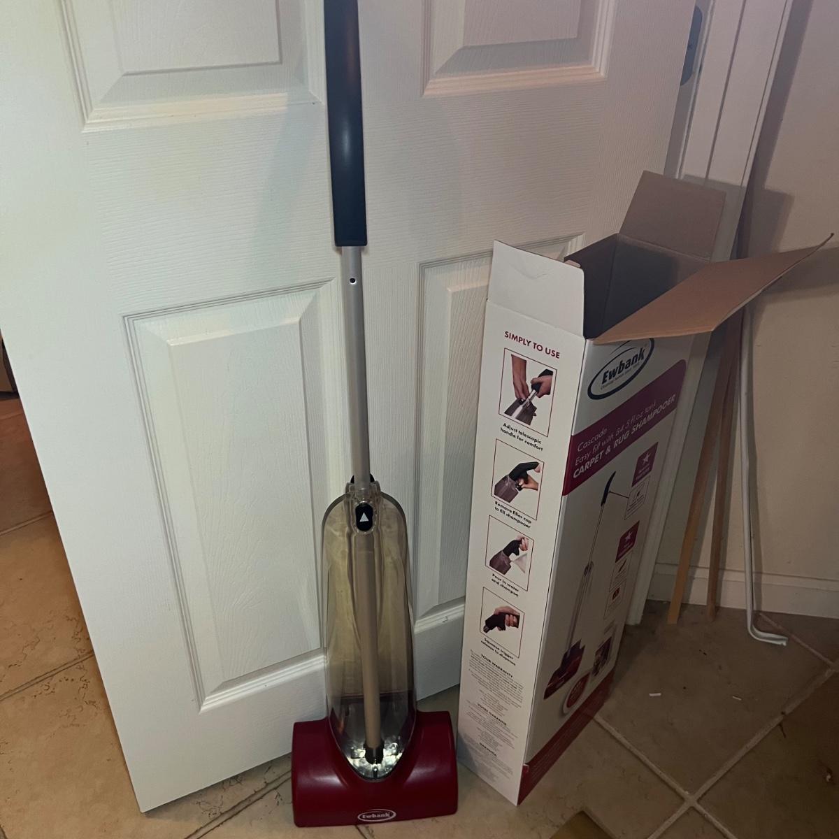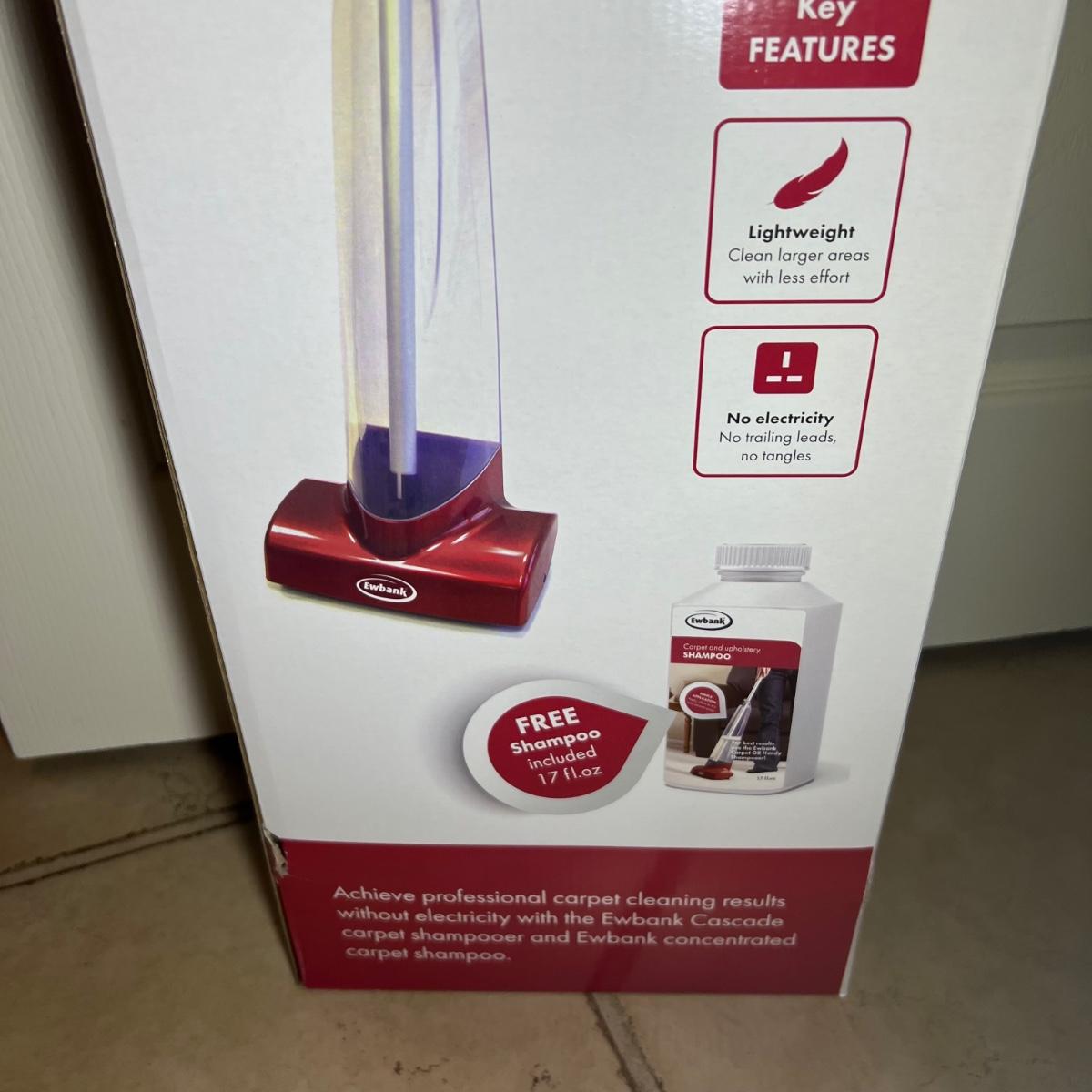 This Ewbank carpet shampooer does not use power and comes with its box and has at most been lightly used if used at all; it measures approximately 9” x 3” x 32”H. Plenty more cleaning supplies and tools includes Swiffer, Bona and more, see images for full inventory.