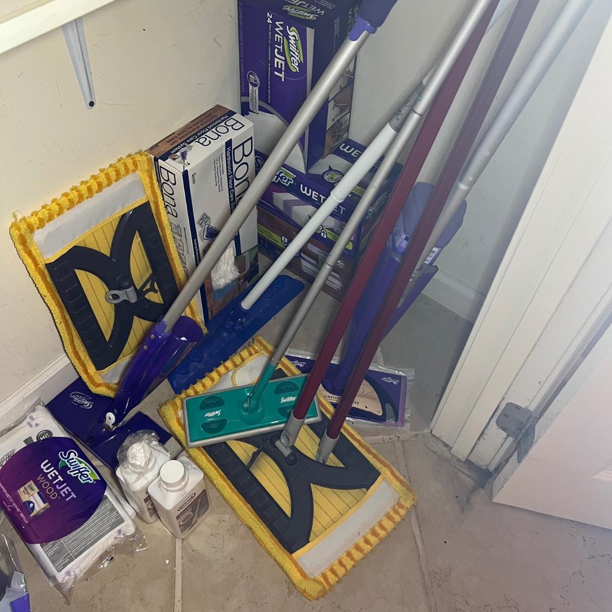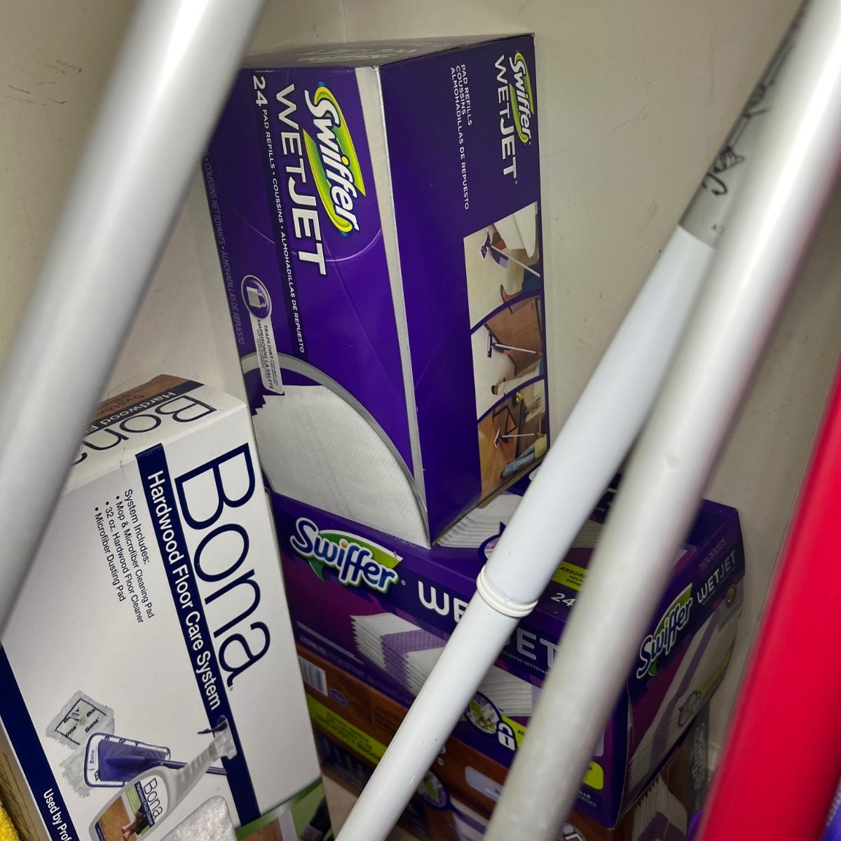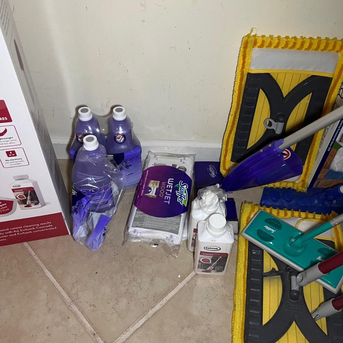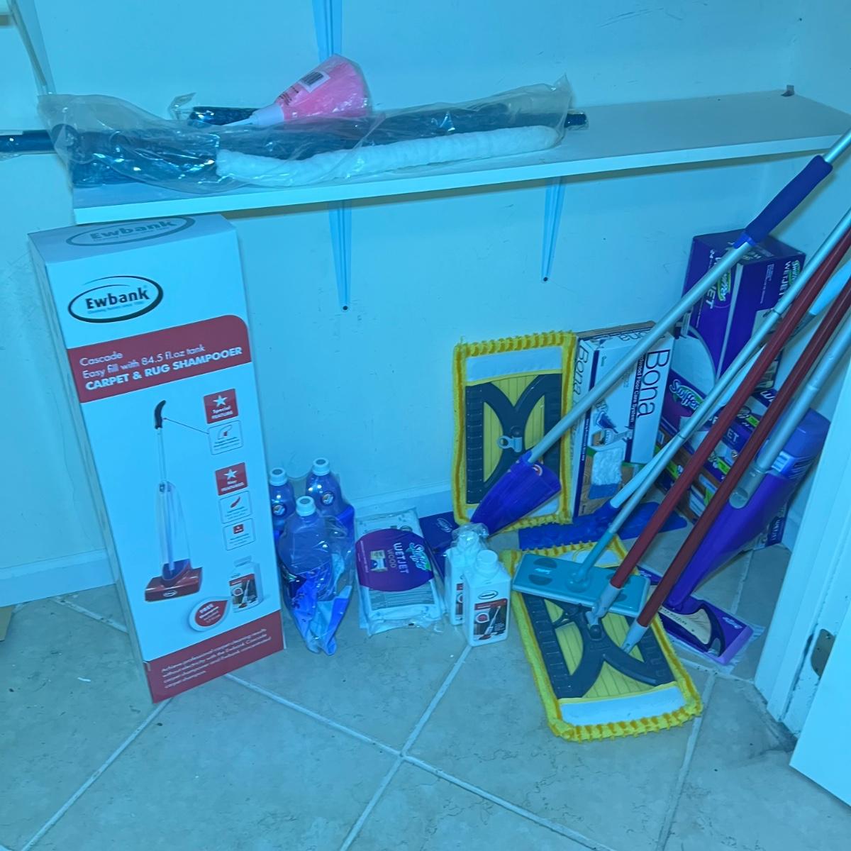 This Ewbank carpet shampooer does not use power and comes with its box and has at most been lightly used if used at all; it measures approximately 9” x 3” x 32”H. Plenty more cleaning supplies and tools includes Swiffer, Bona and more, see images for full inventory.