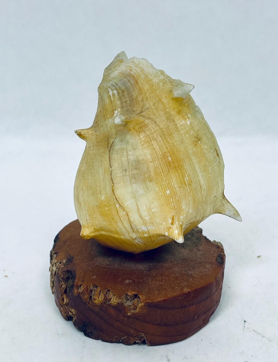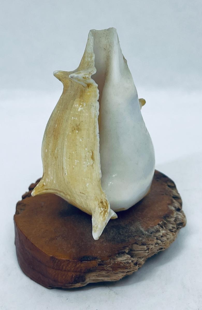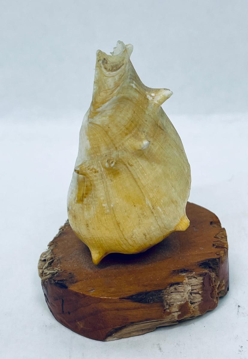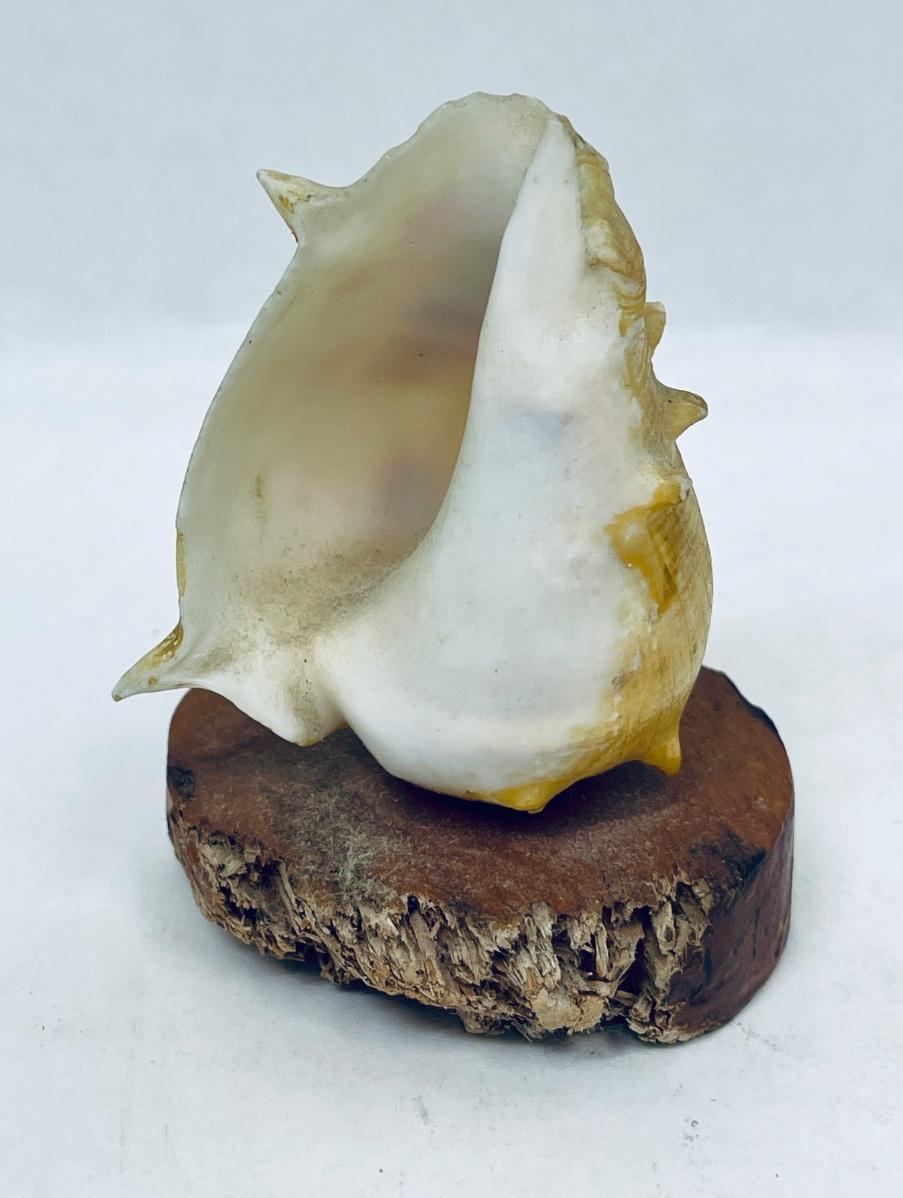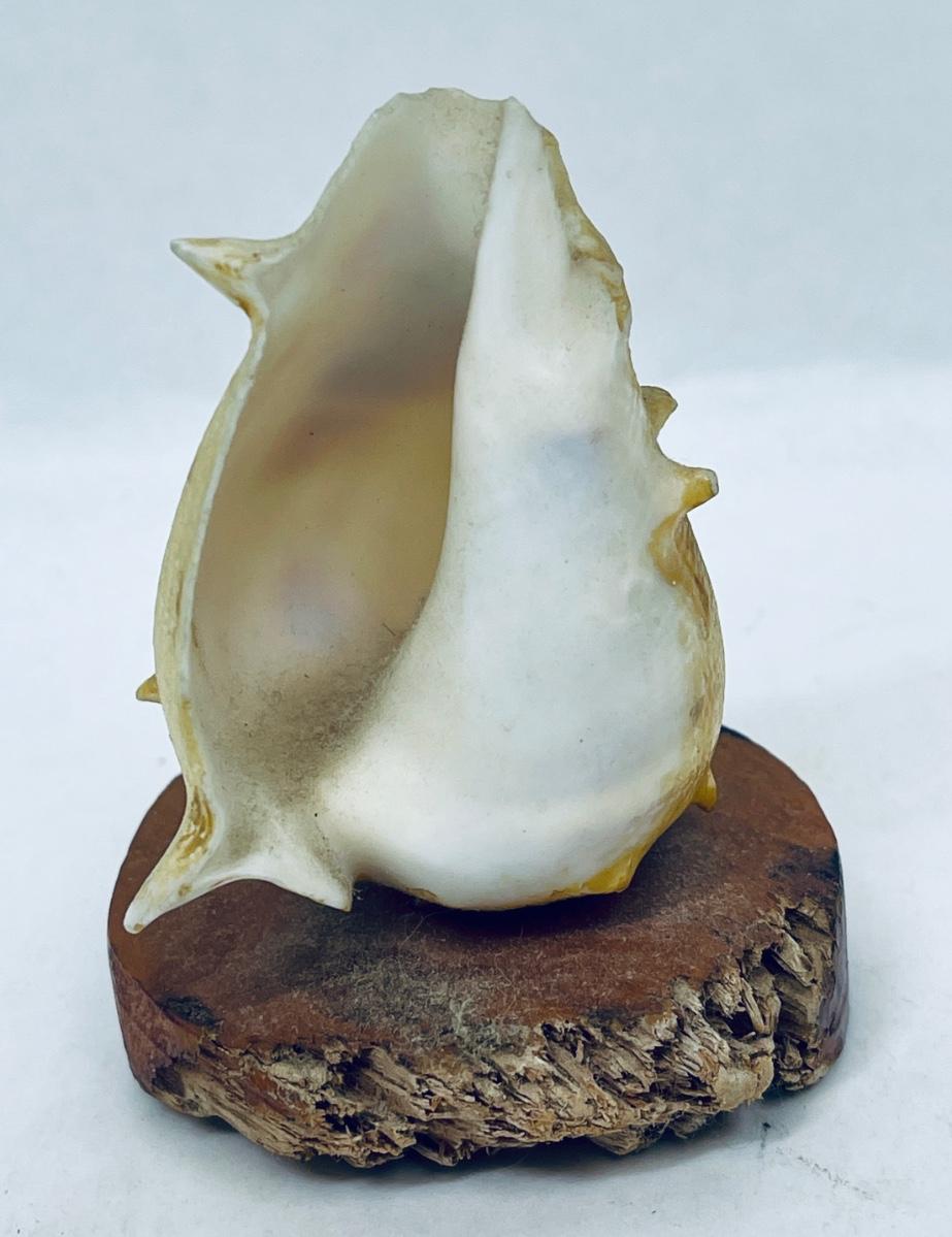 Shell is mounted on a distressed wood disk made from driftwood. Good condition, approx. 3" tall.