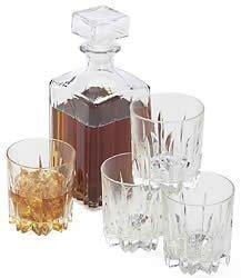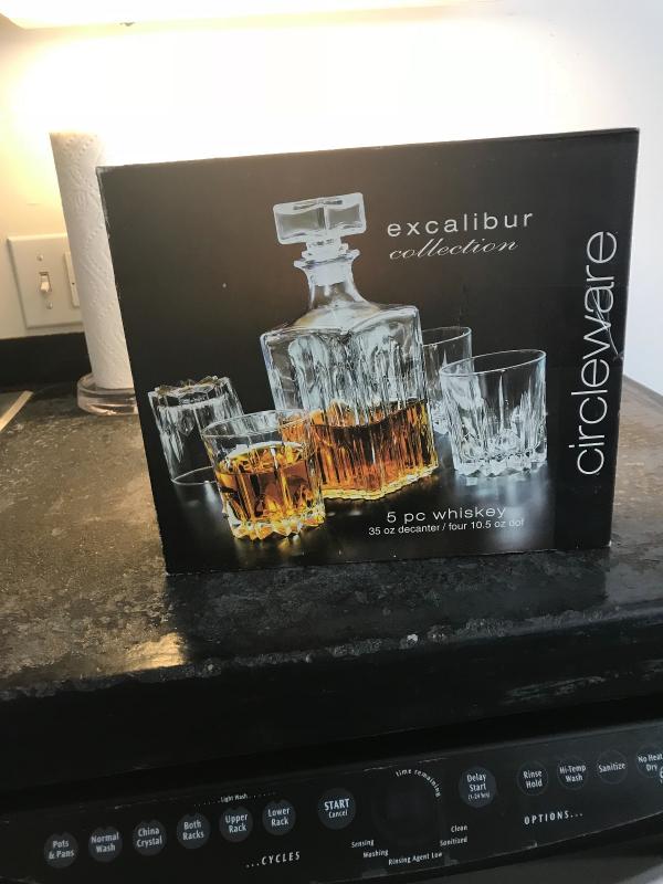 Circle Ware Excalibur 5-piece decanter set comes in beautiful fine clear glass. Four sophisticated short 10.5 oz. glasses and a 35 oz. decanter with a glass cover will ensure that top notch whiskey is kept at a perfect temperature and sealed properly. Add this to any bar set in your home or business for an elegant touch.