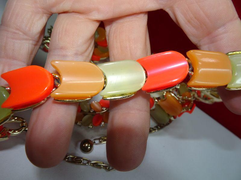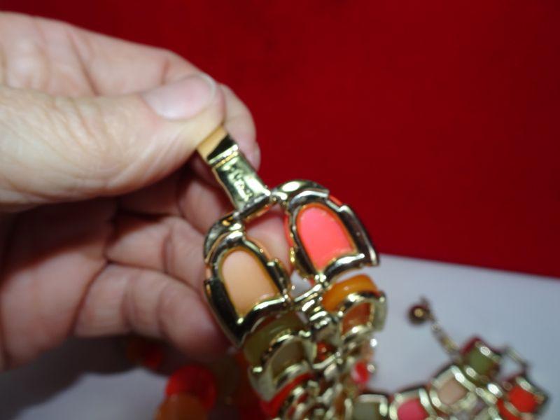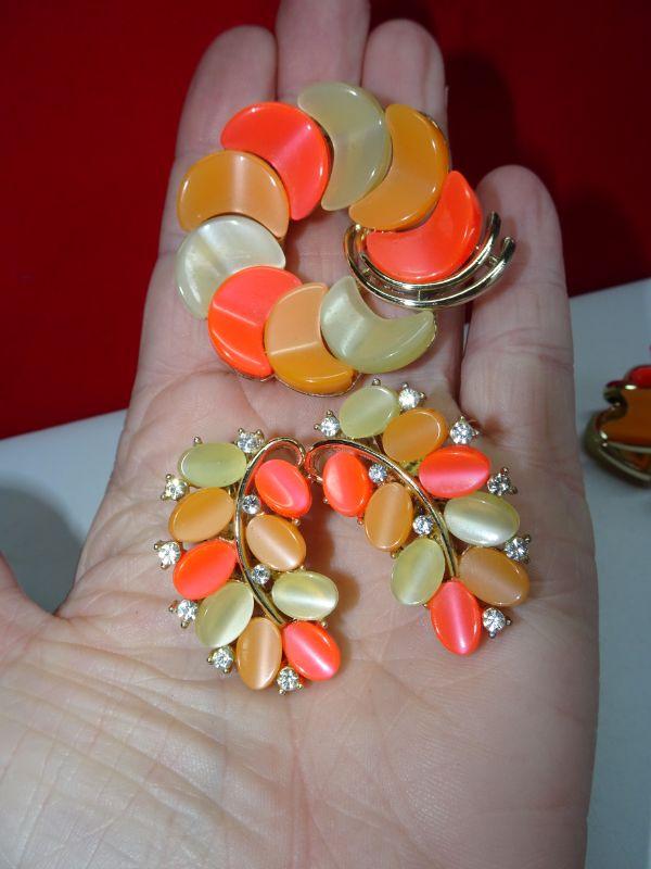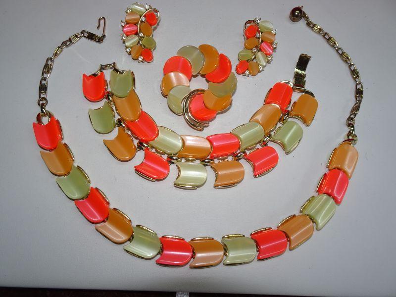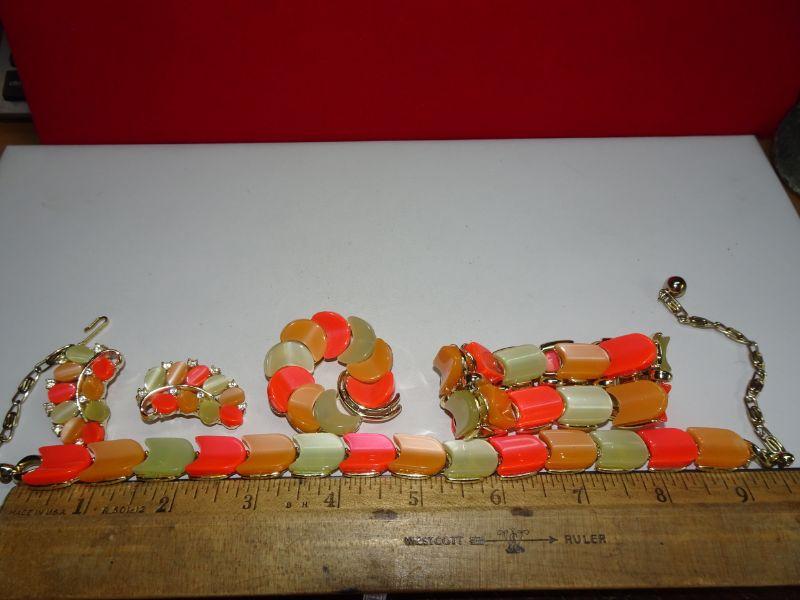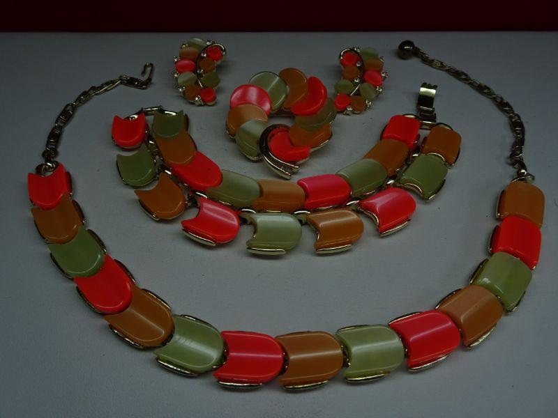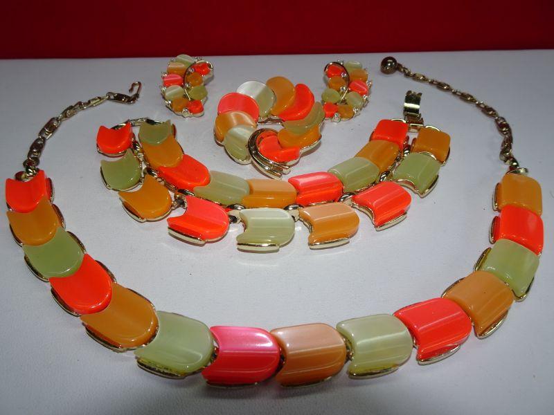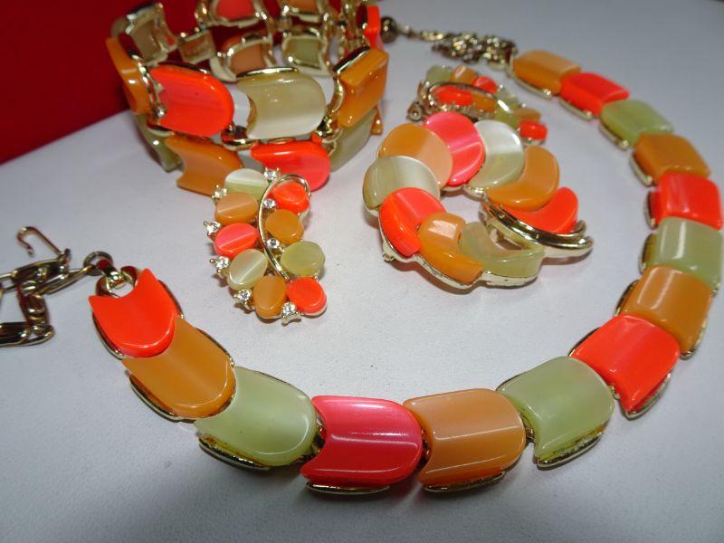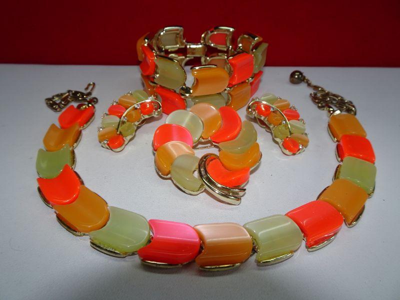 Excellent Condition, 4 Piece Signed Lisner Thermoset Necklace Earrings Bracelet & Brooch, Neon Orange Melon Vintage Summer