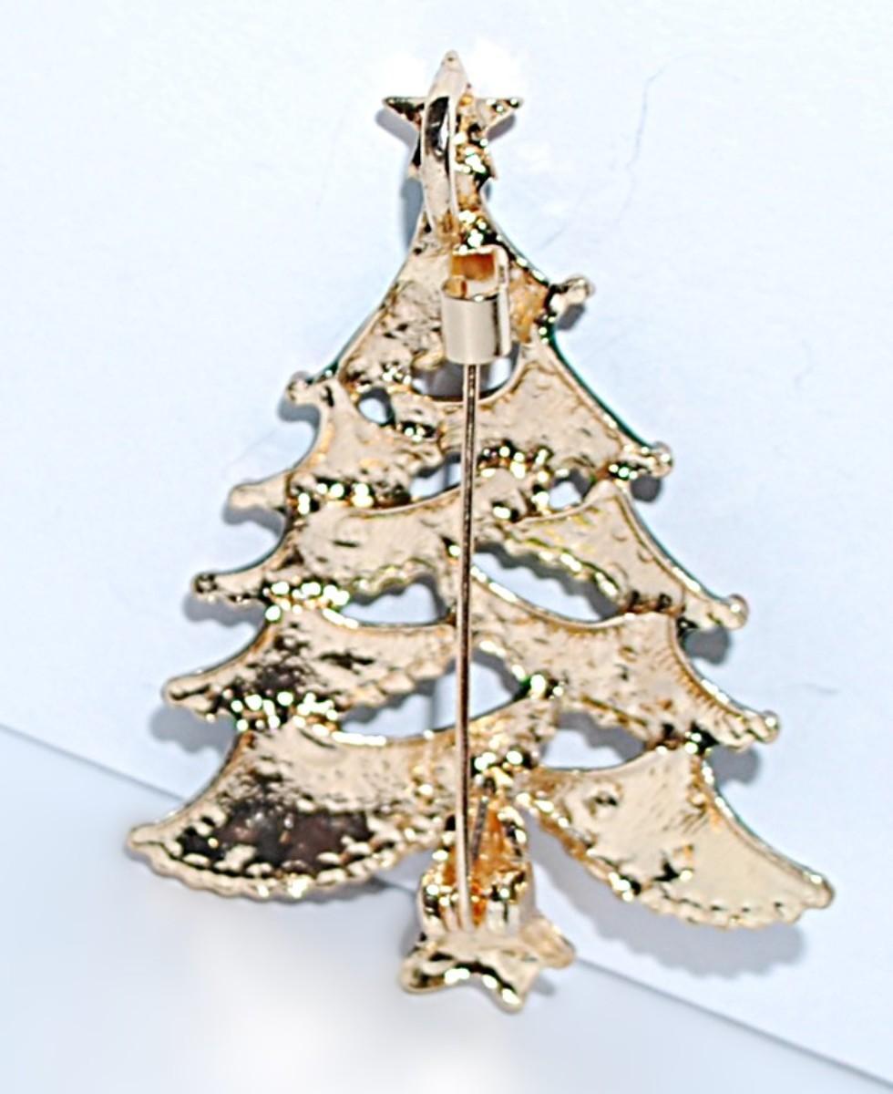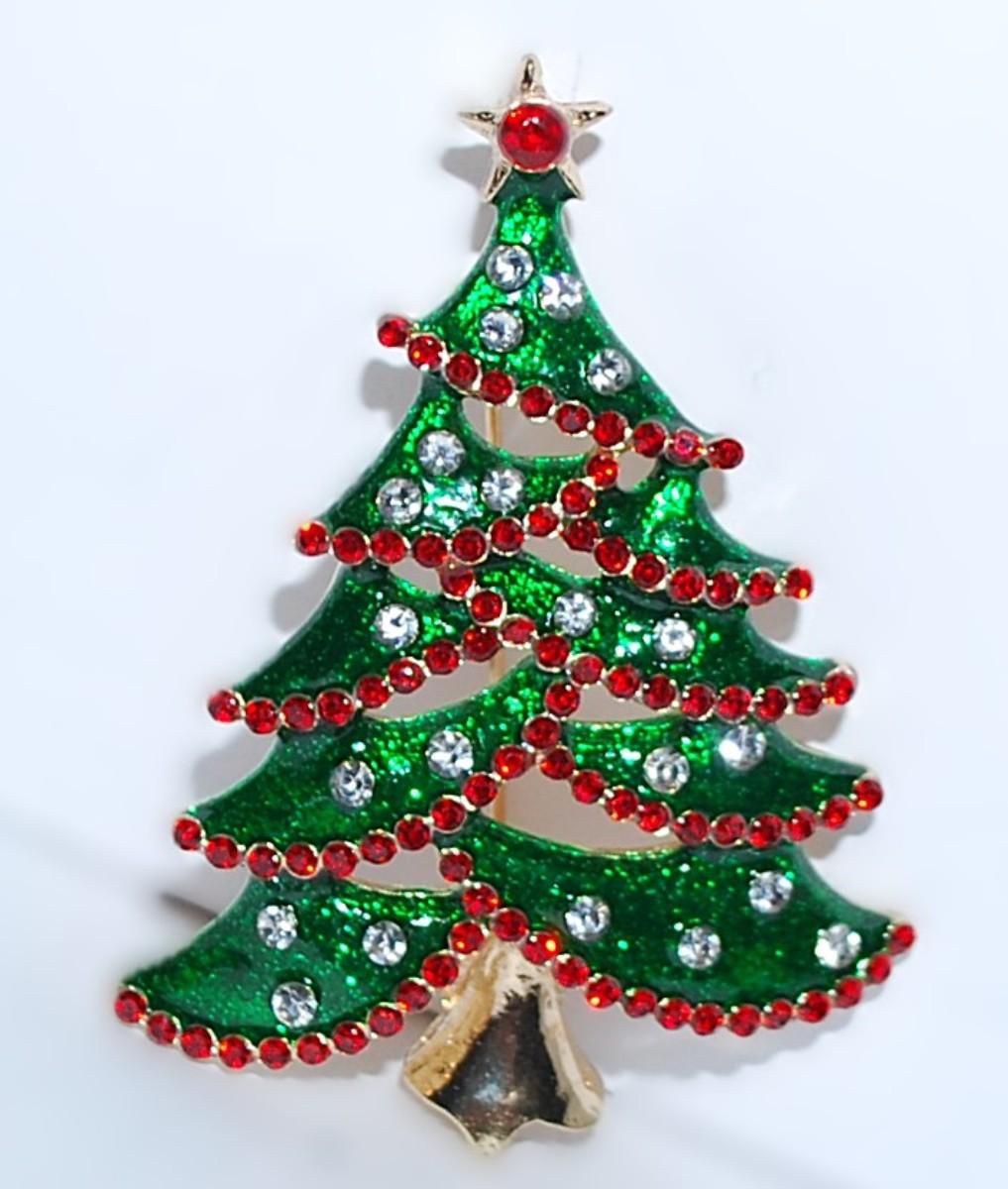 Excellent HOLIDAY TREE BROOCH (2" x 1¼") with RED & CLEAR "Jewels" & Green Enameled Branches on a Gold Tone Setting