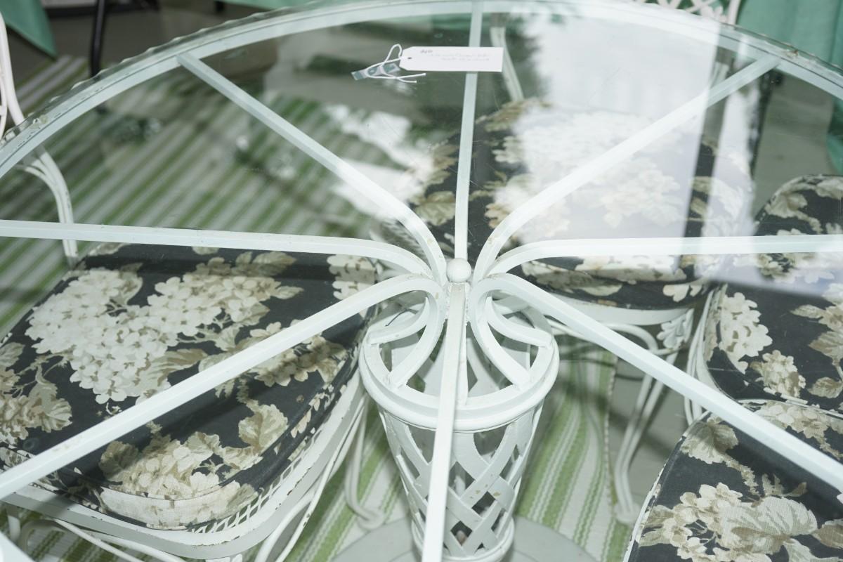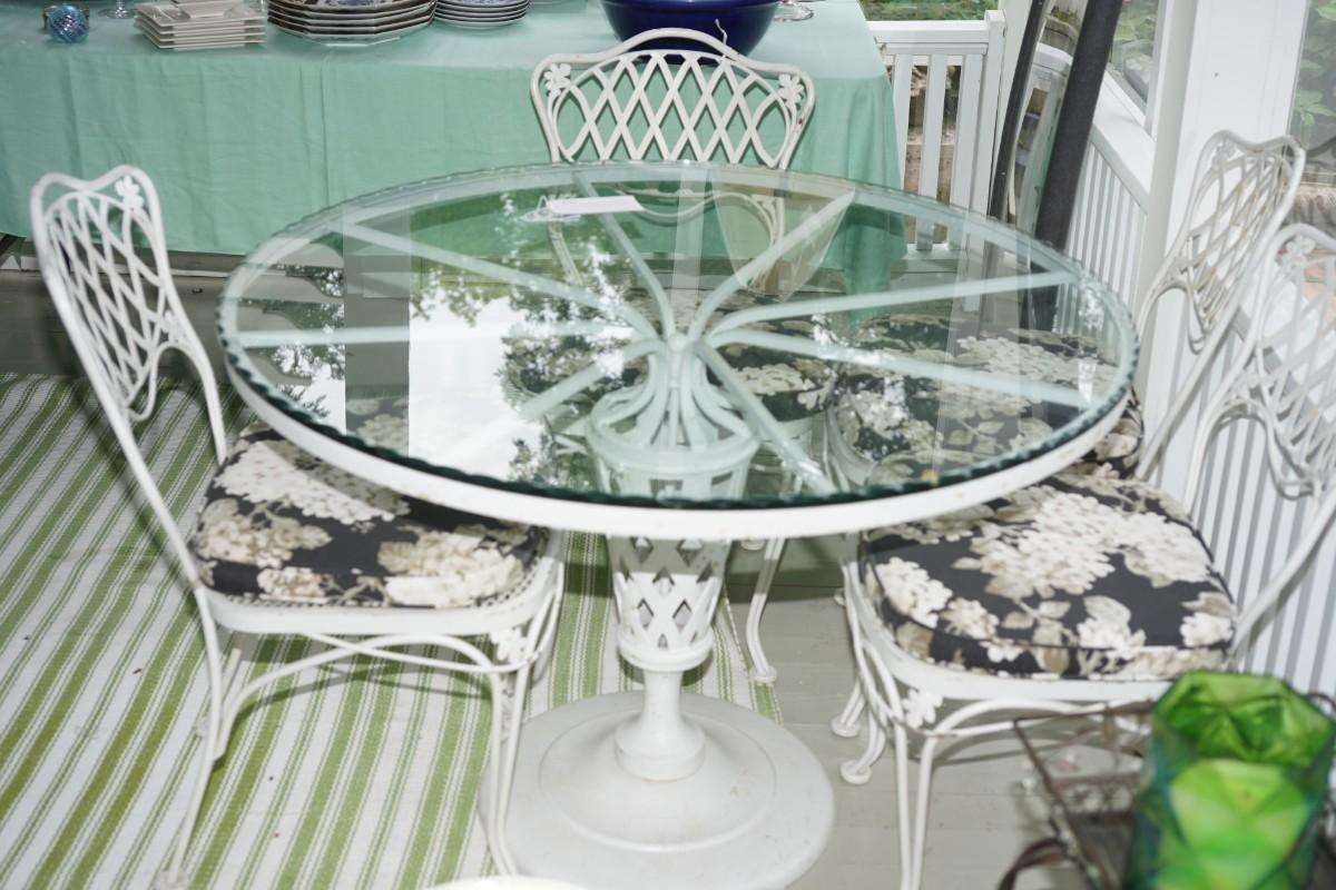 EXCELLENT WHITE METAL W/ ROUND "SCALLOP BEVELLED" GLASS TOP AND SIX CHAIRS(TWO NOT SHOWN IN THIS PHOTO)