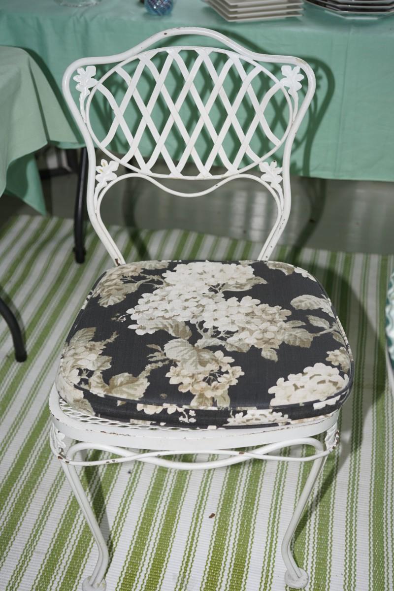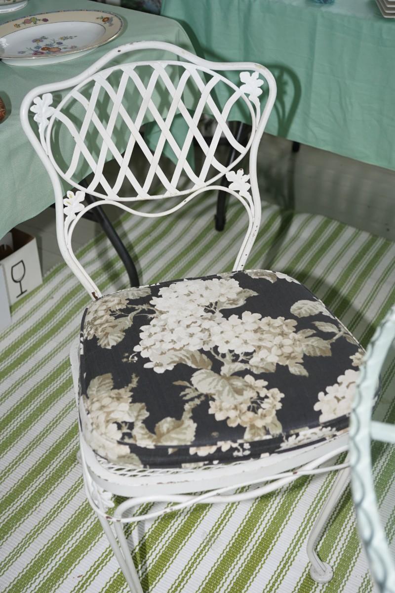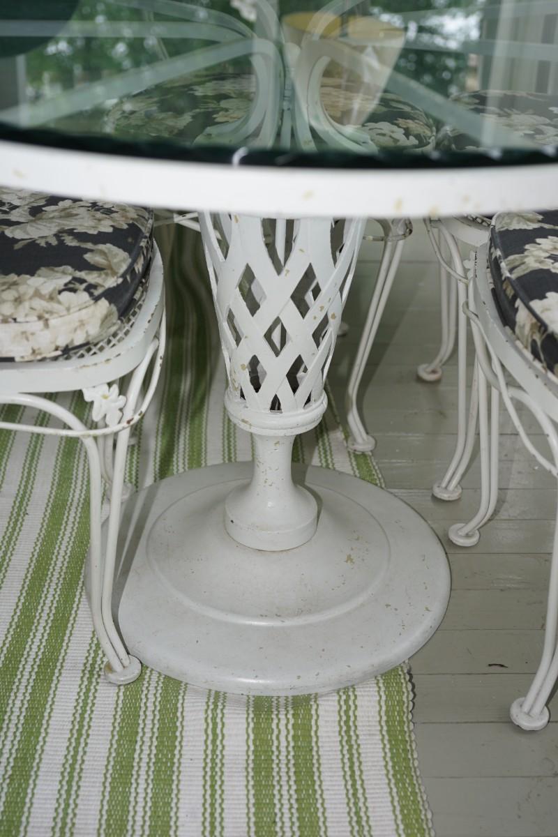 this classic table with a white painted metal base of good quality. the pedestal has a basket weave of classic design and a sunburst of support that accents the top. The chairs are quality with a weave of good metal support on the backs and seats. The floral cushions are of good quality also