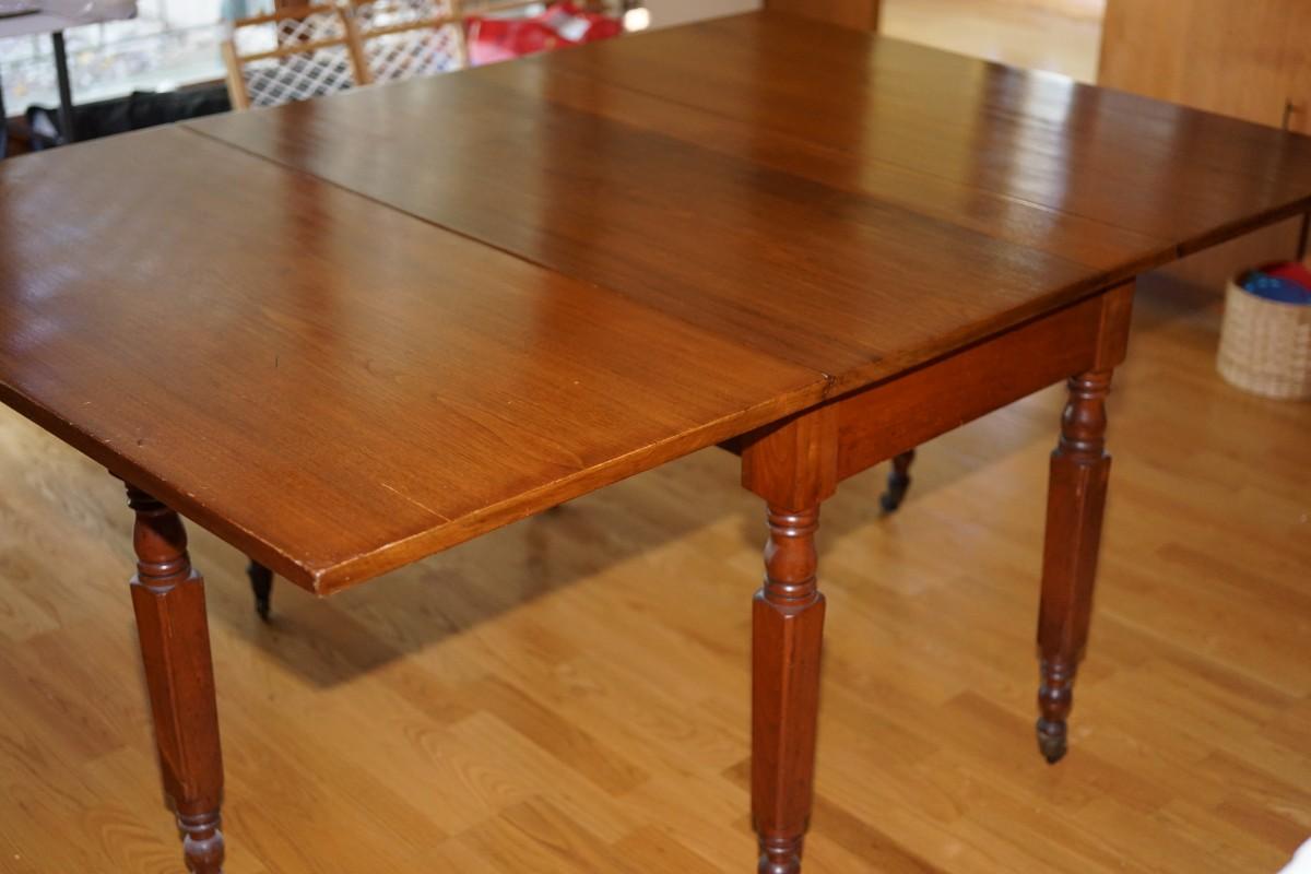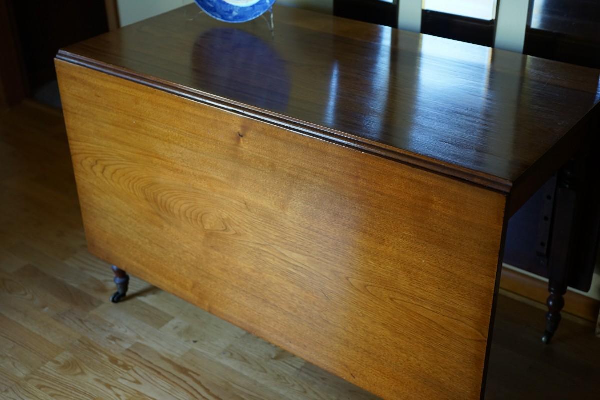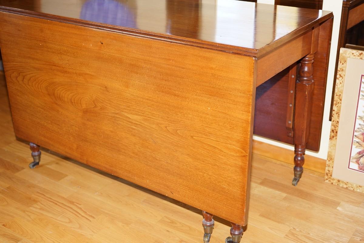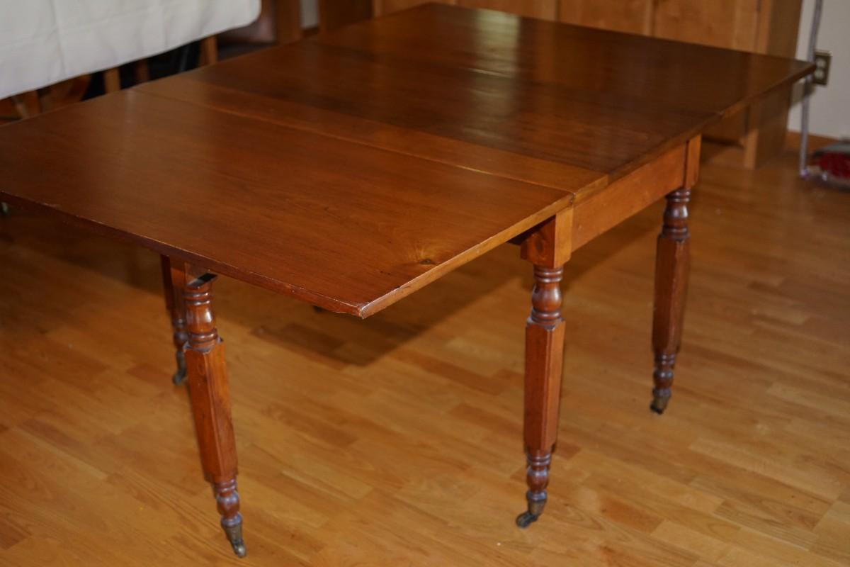 This is a drop leaf dining table circa 1880-1890 three board of walnut woods. The grain pattern is very pretty. Square turned legs. It is a gateleg so the leg swings out to support the leaves.