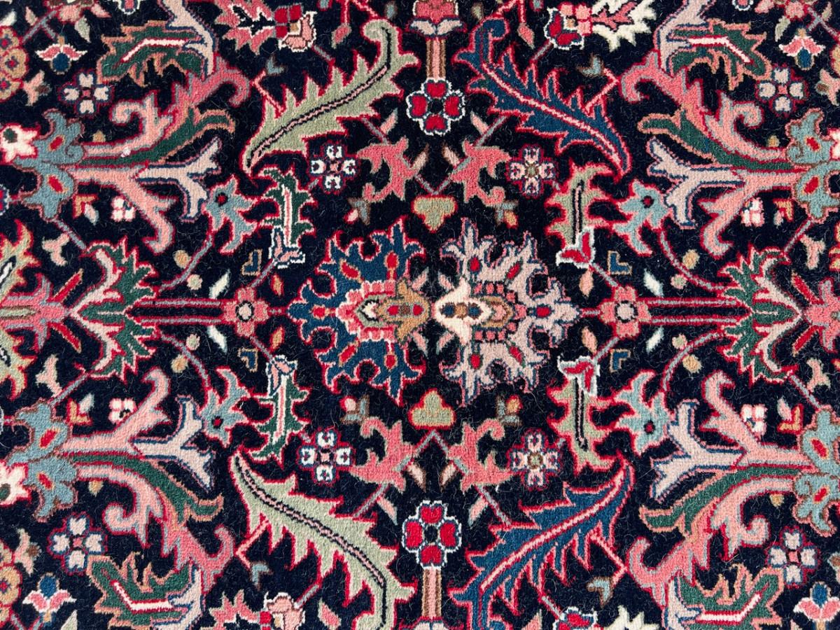DESCRIPTION: This exquisite area rug has been tightly woven with intricate patterns of jewel and foliate patterns that stands out on a black field, with shaded reds and details in white. The fine framing borders repeat a dynamic floral design that sets this rug apart.