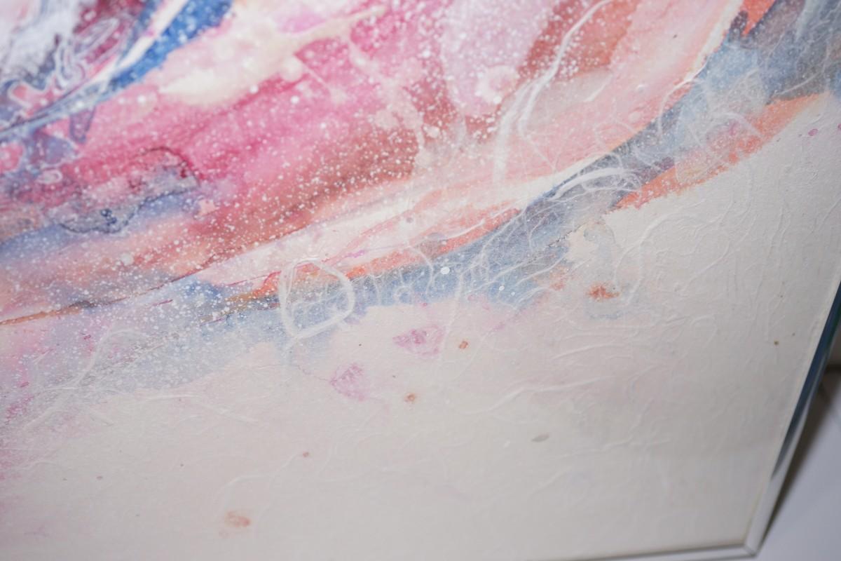 mixed media on paper. Framed under glass and metal brushed silver frame.