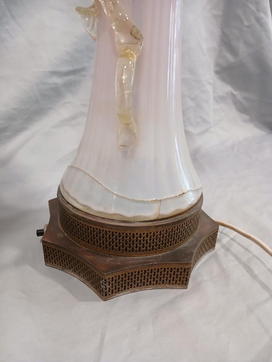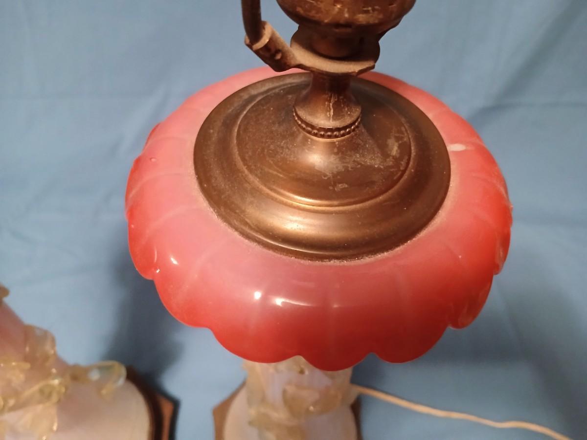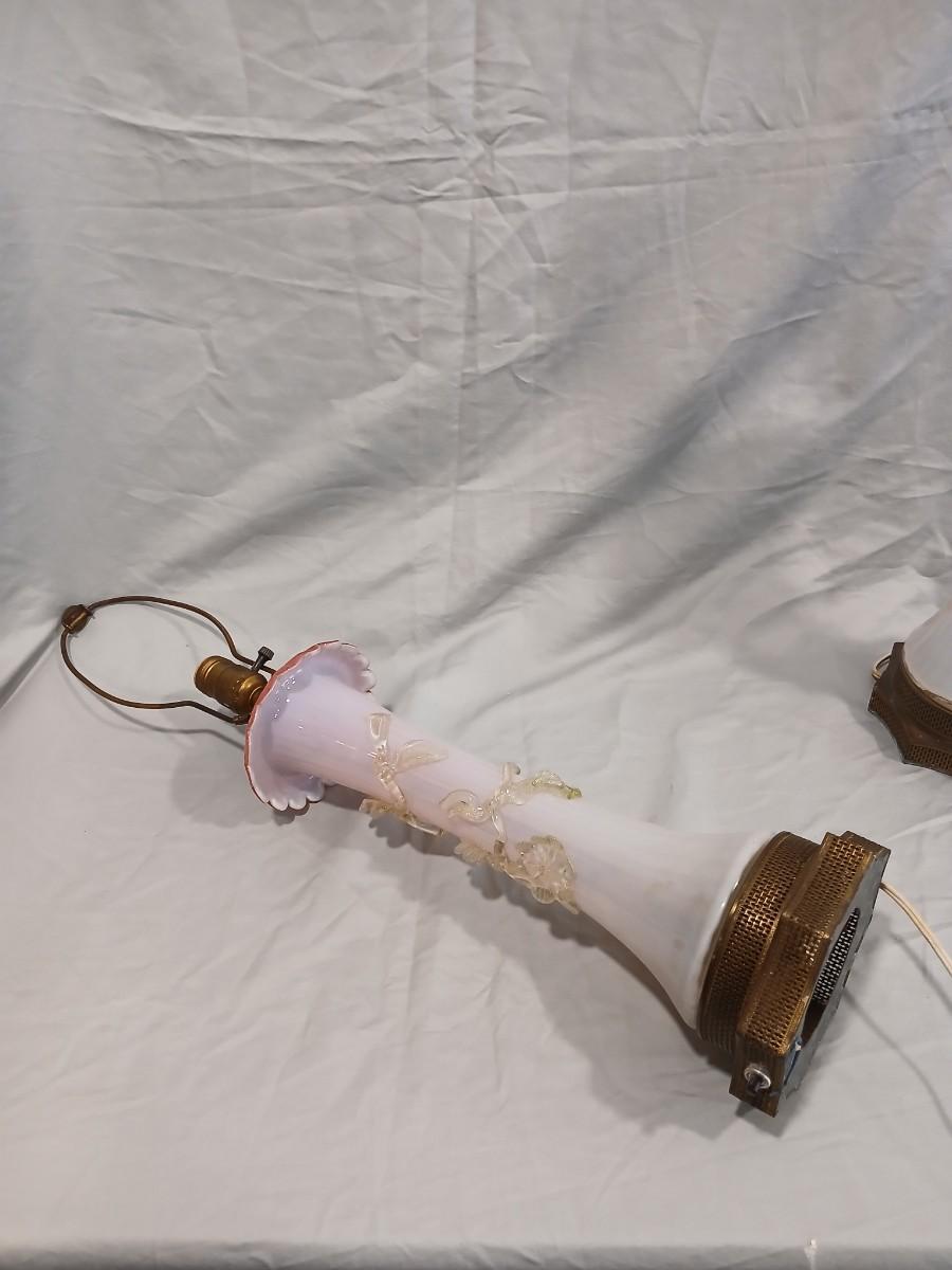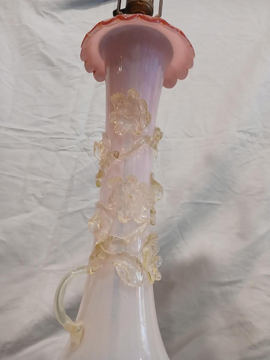 Body of Pink & white opalescent striated ombre effect w/clear pale chartreuse floral vine applied. Bronze metal mounts. Base 6", 13 3/4" high, 27" high incl. shades. One in great condition, the other with crack at base, needing better repair. Shades included.