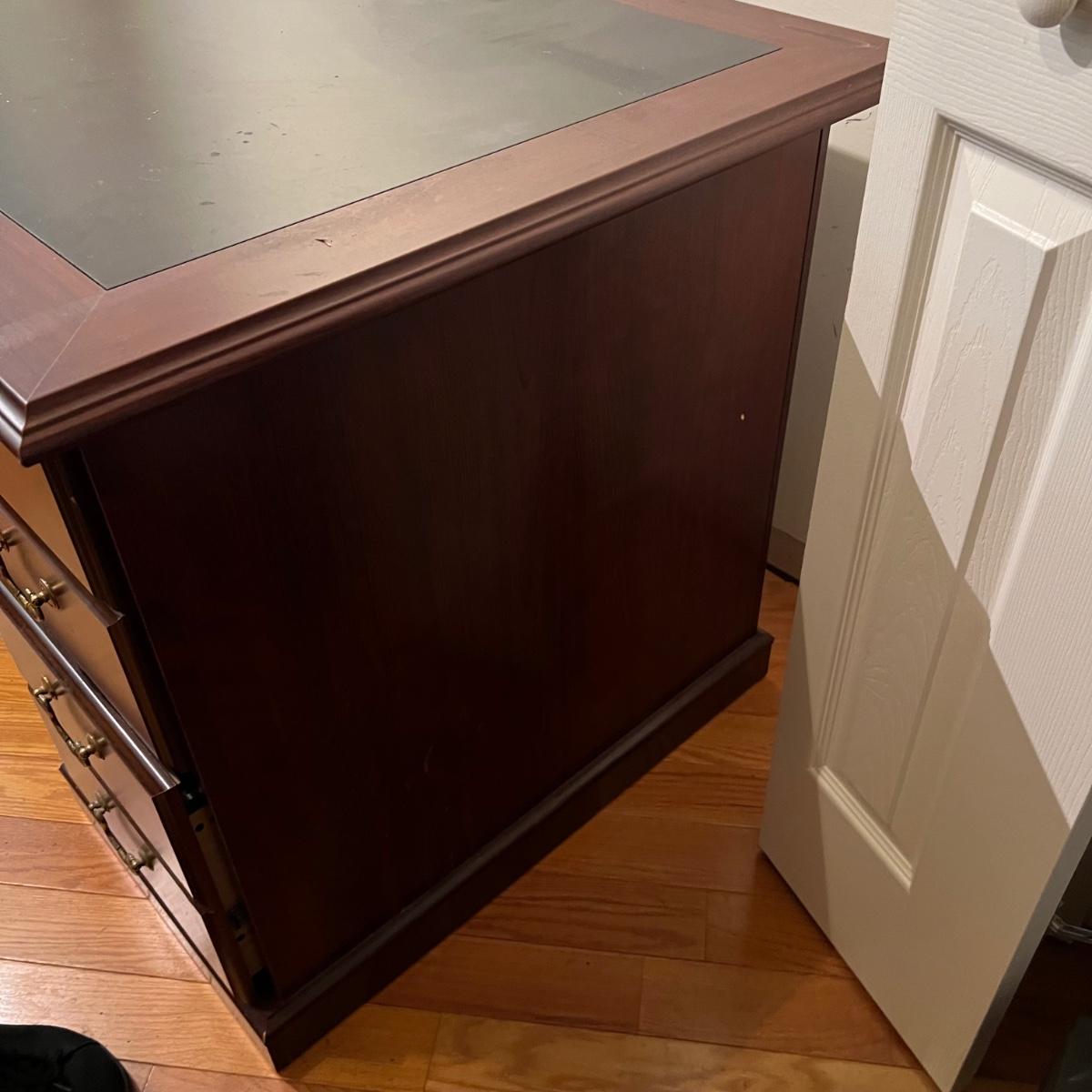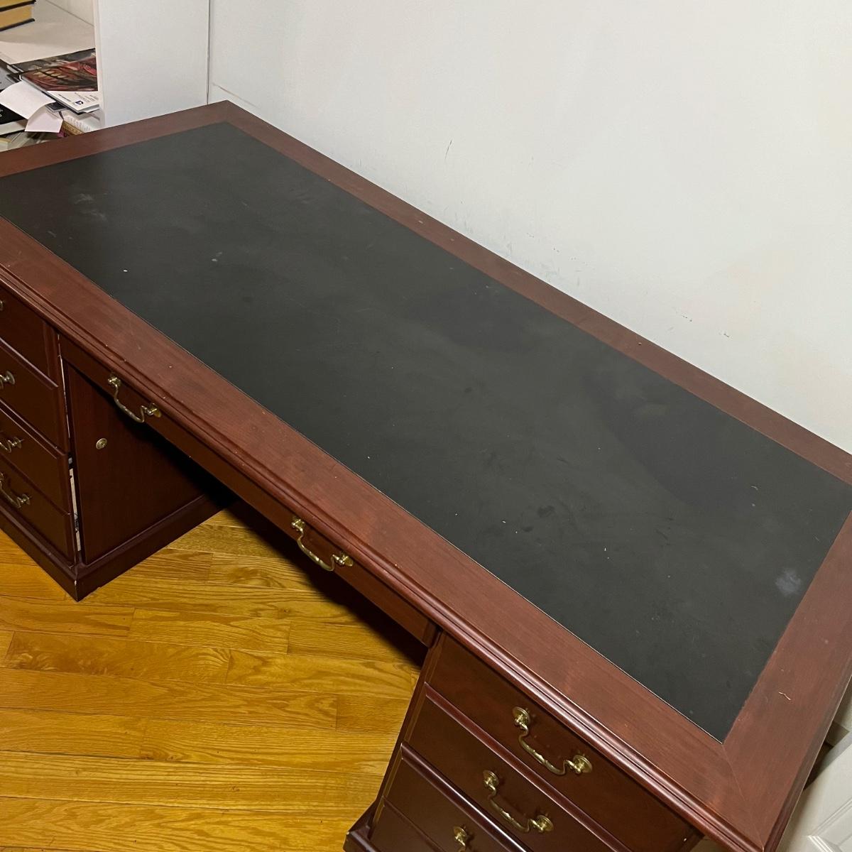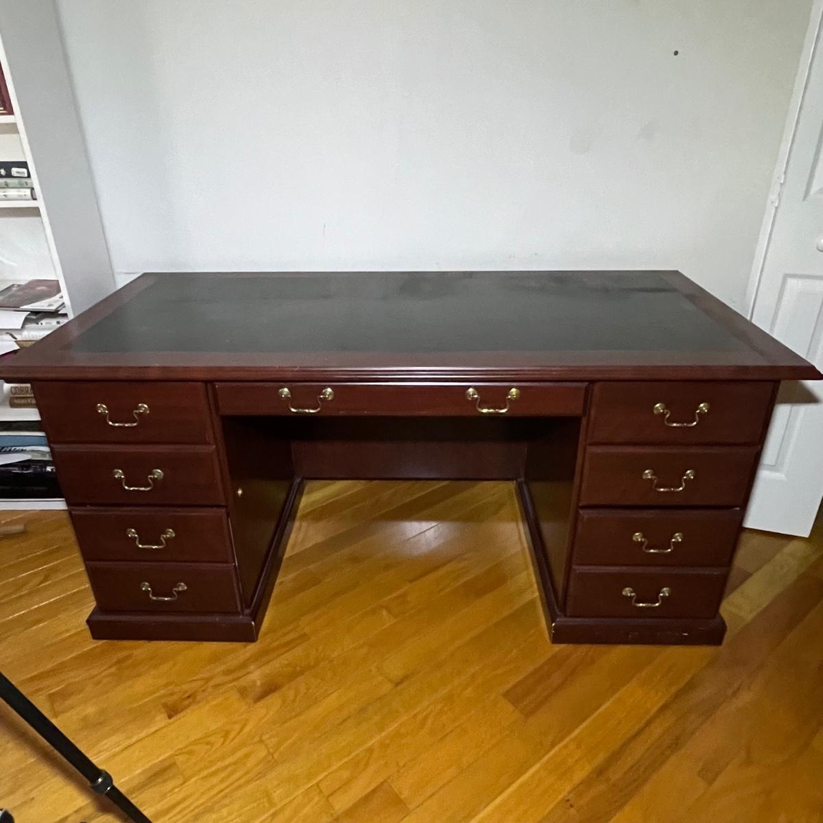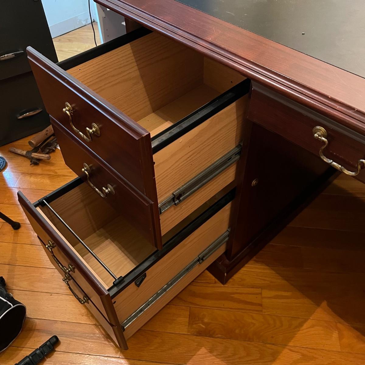 This wooden executive desk by Sauder Woodworking has a faux leather top and features a total of three file cabinets, two on the left that are lockable but no key included and one on the right that has two drawers above it. A central drawer in the middle. Has brass colored hardware.