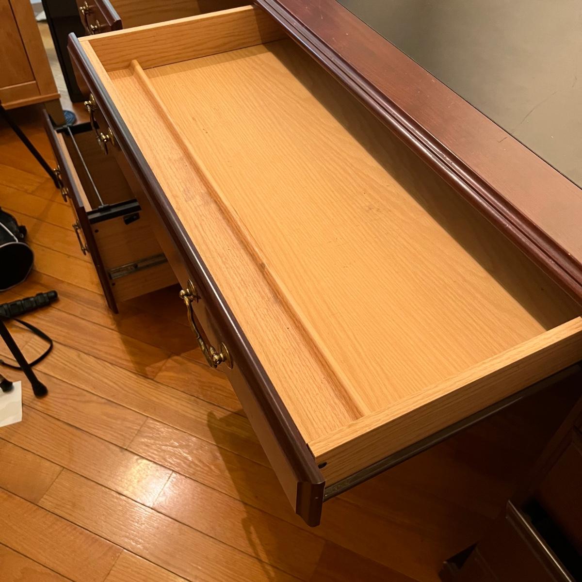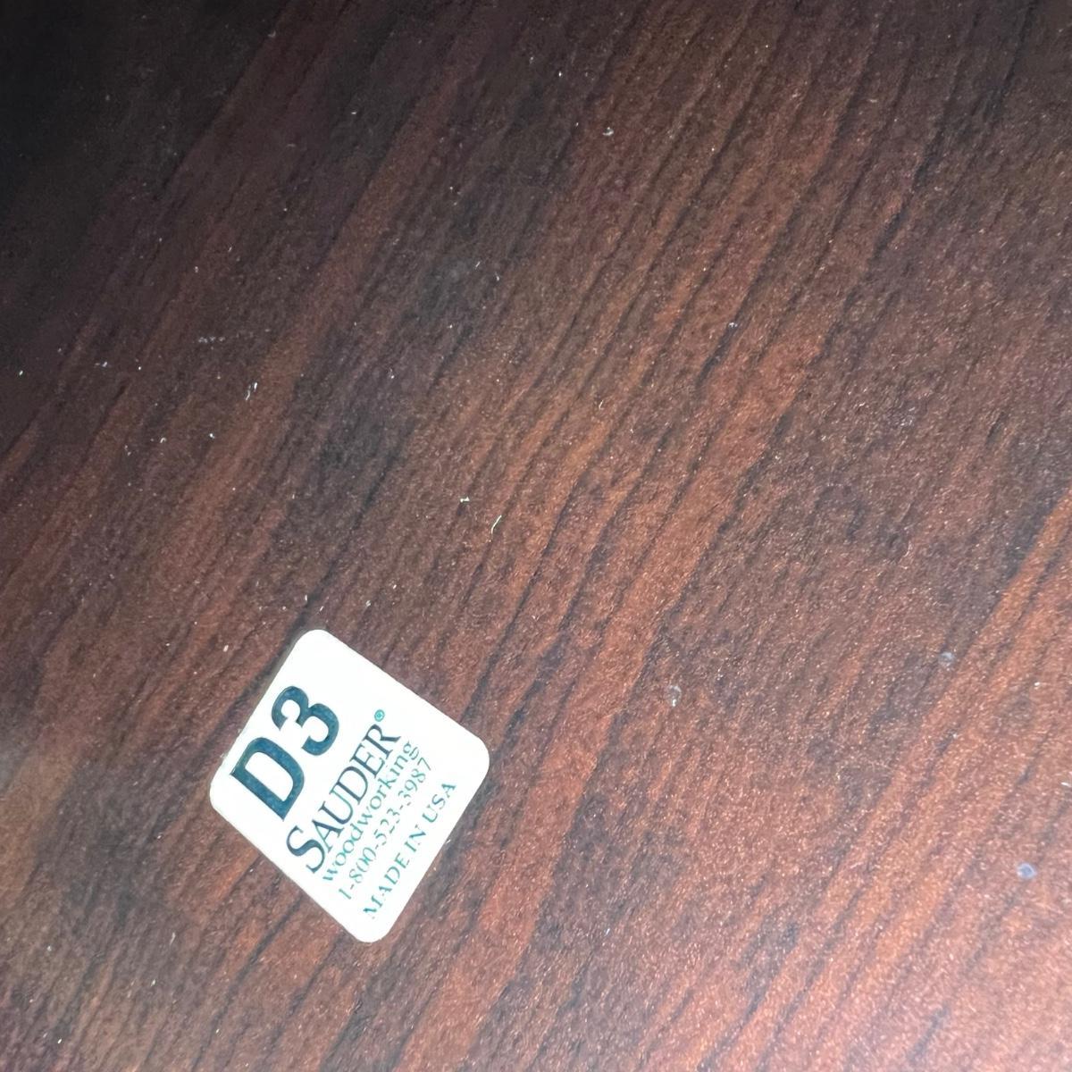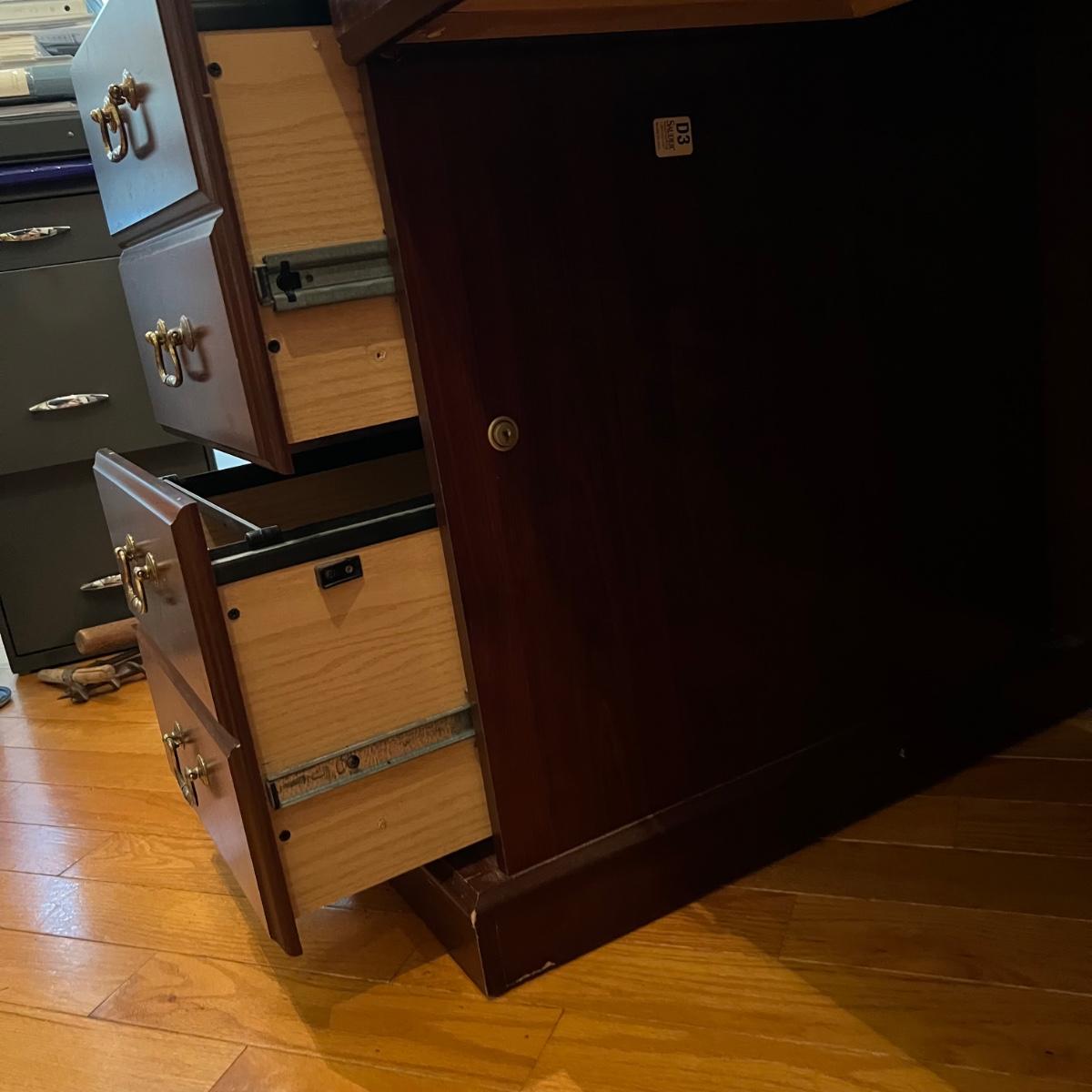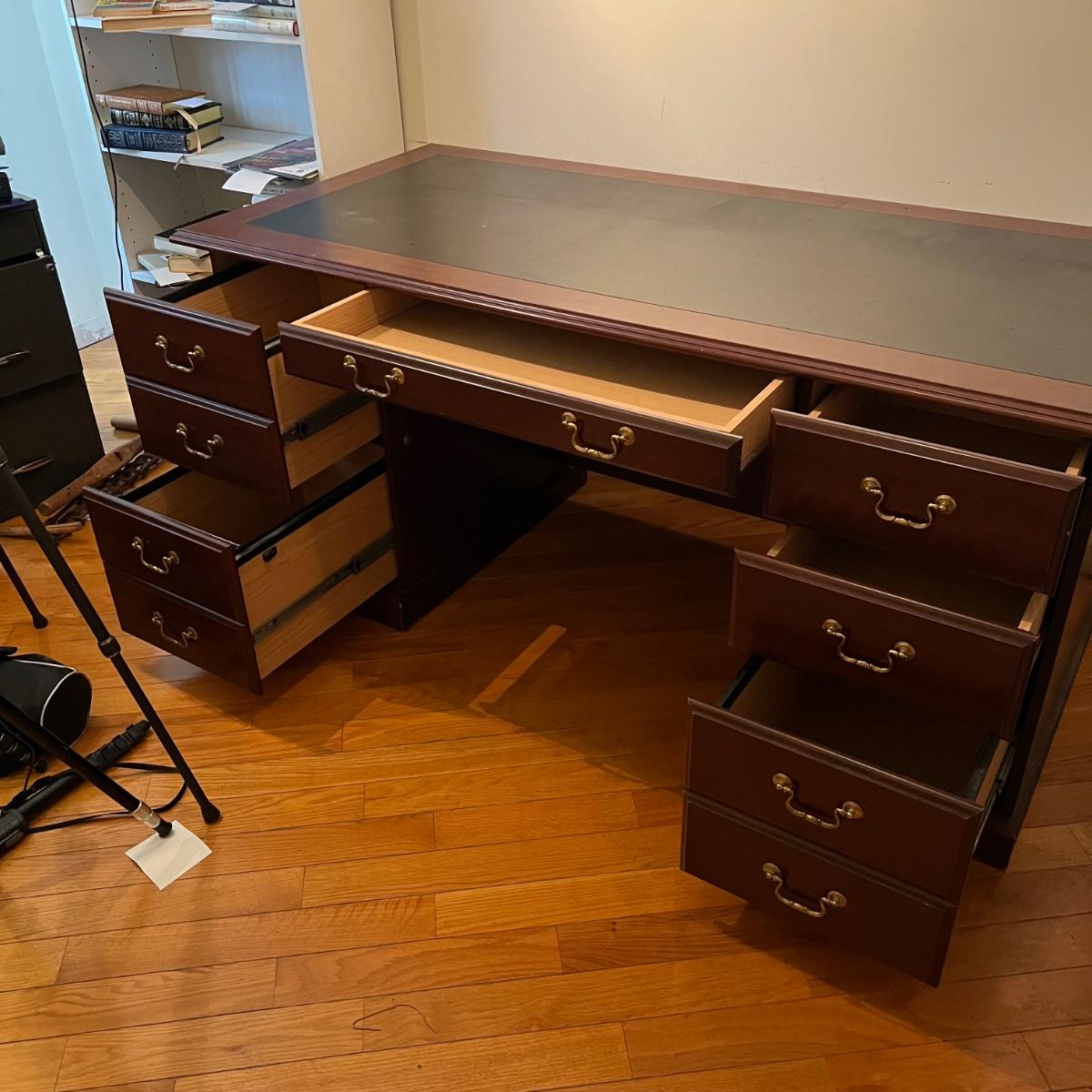 This wooden executive desk by Sauder Woodworking has a faux leather top and features a total of three file cabinets, two on the left that are lockable but no key included and one on the right that has two drawers above it. A central drawer in the middle. Has brass colored hardware.
