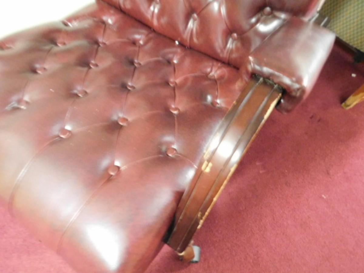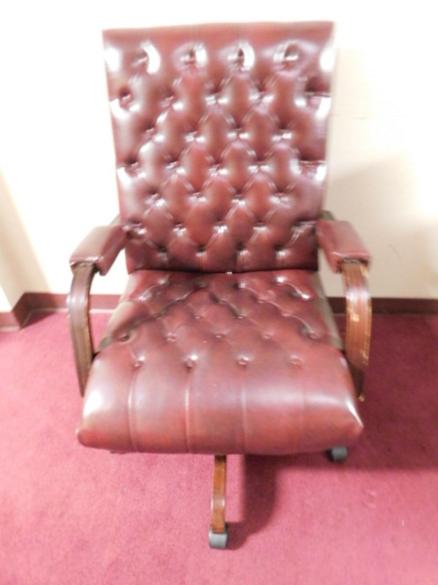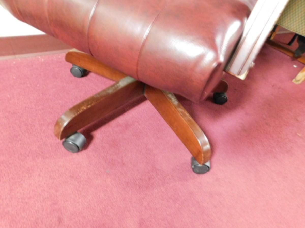 Executive Office Chair Wood Frame with Button Cushion Design. Has scratching and wear on hand rests. Expect some wear or scratches to finish. Shipping option available via freight or local mover at Buyer's expense. Buyer must have all shipping scheduled within the stated dates and times of pickup. Recommended local mover is Beaty Bros. Moving 828-201-2982