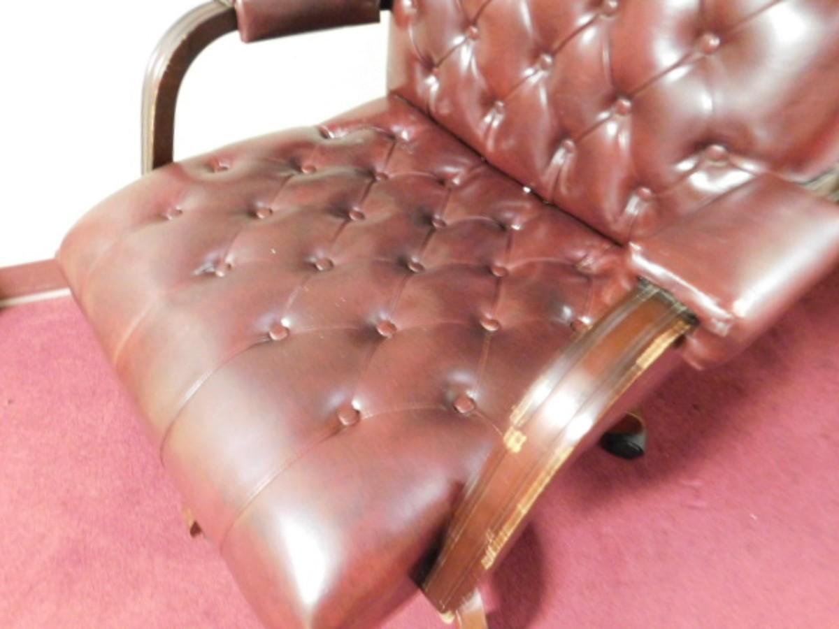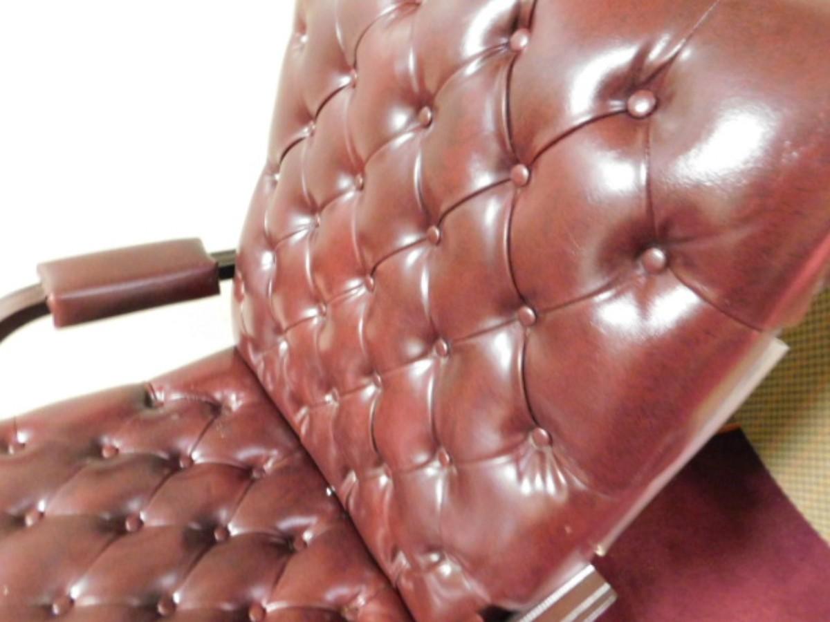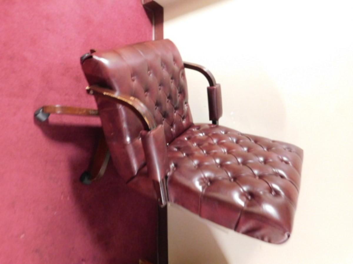 Executive Office Chair Wood Frame with Button Cushion Design. Has scratching and wear on hand rests. Expect some wear or scratches to finish. Shipping option available via freight or local mover at Buyer's expense. Buyer must have all shipping scheduled within the stated dates and times of pickup. Recommended local mover is Beaty Bros. Moving 828-201-2982