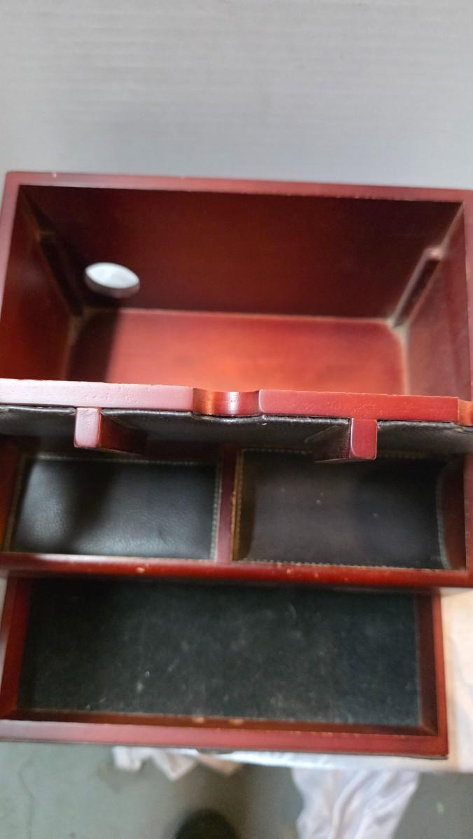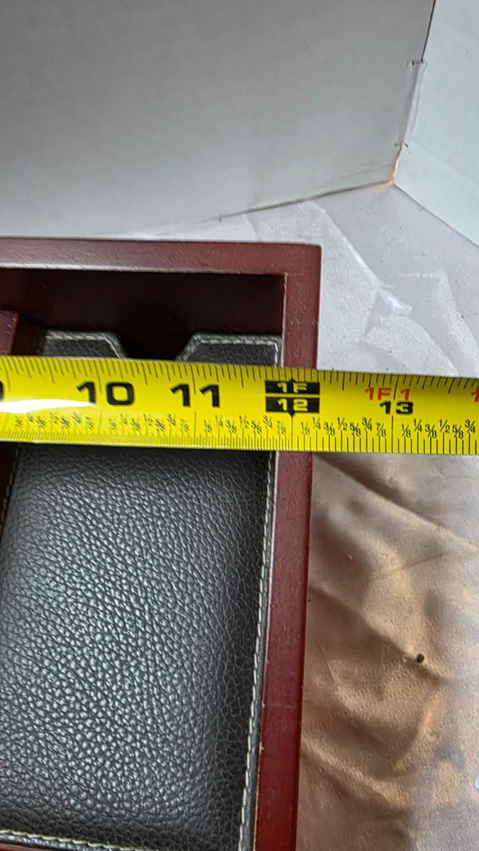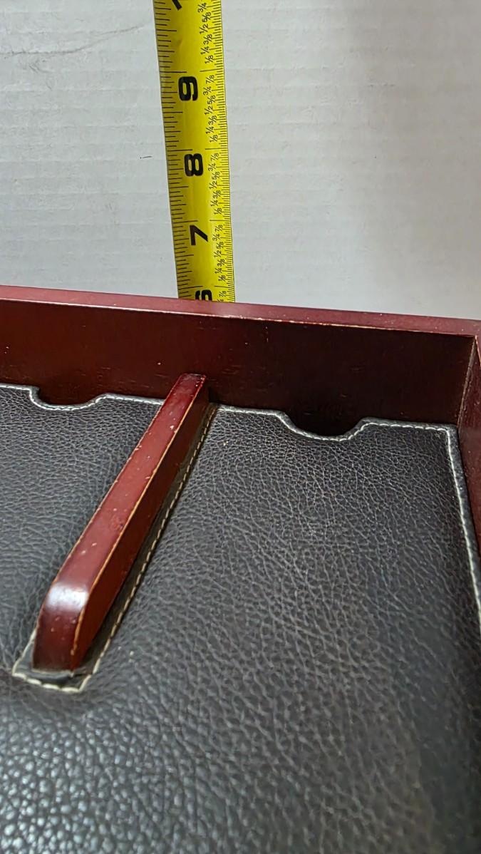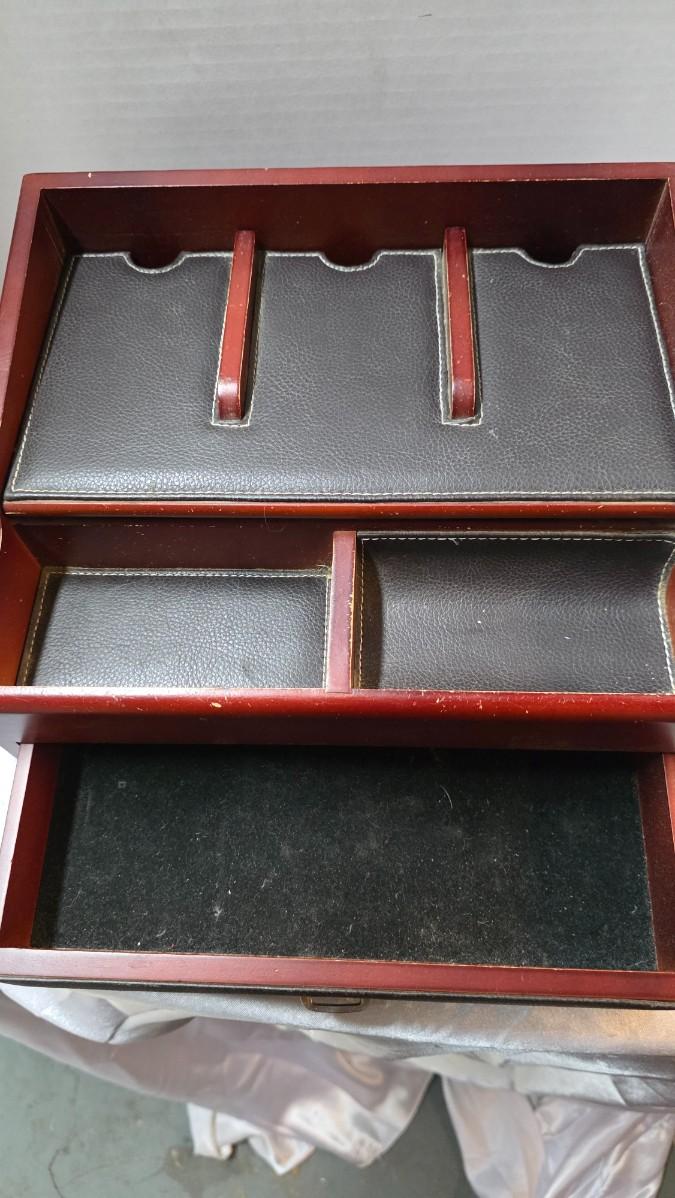 Bring order and refinement to your daily routine with this executive-style wood dresser valet organizer, thoughtfully designed to keep life’s essentials neatly within reach. Finished in a rich reddish wood tone and complemented by black leather-look lining with contrast stitching, the piece presents a classic aesthetic that feels both professional and timeless — ideal for a nightstand, dresser, or office setting.