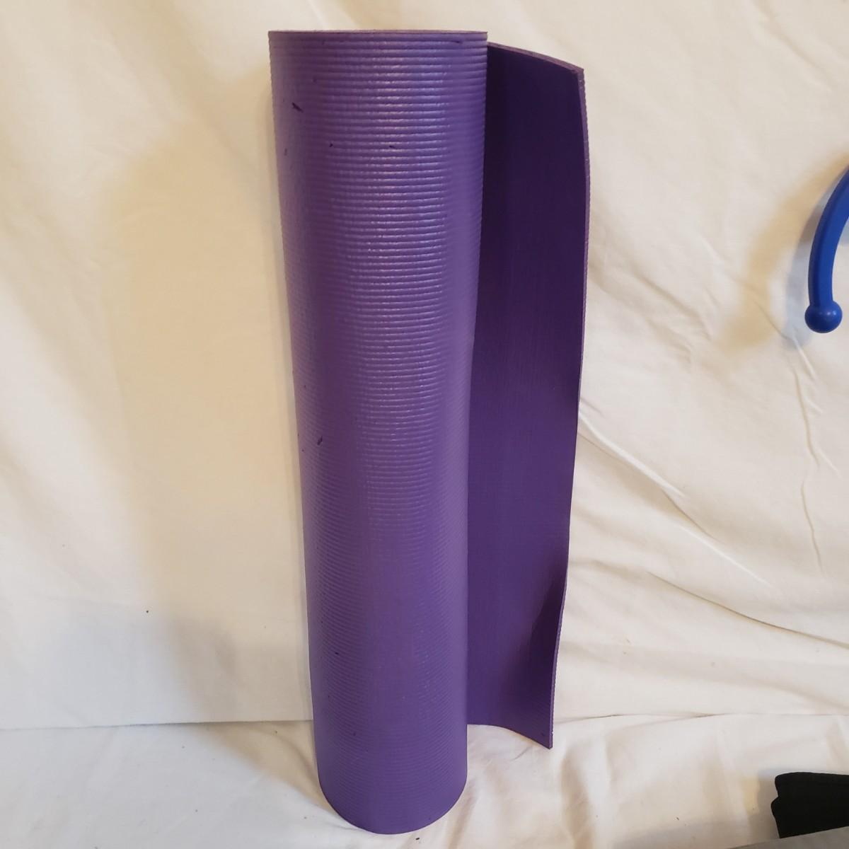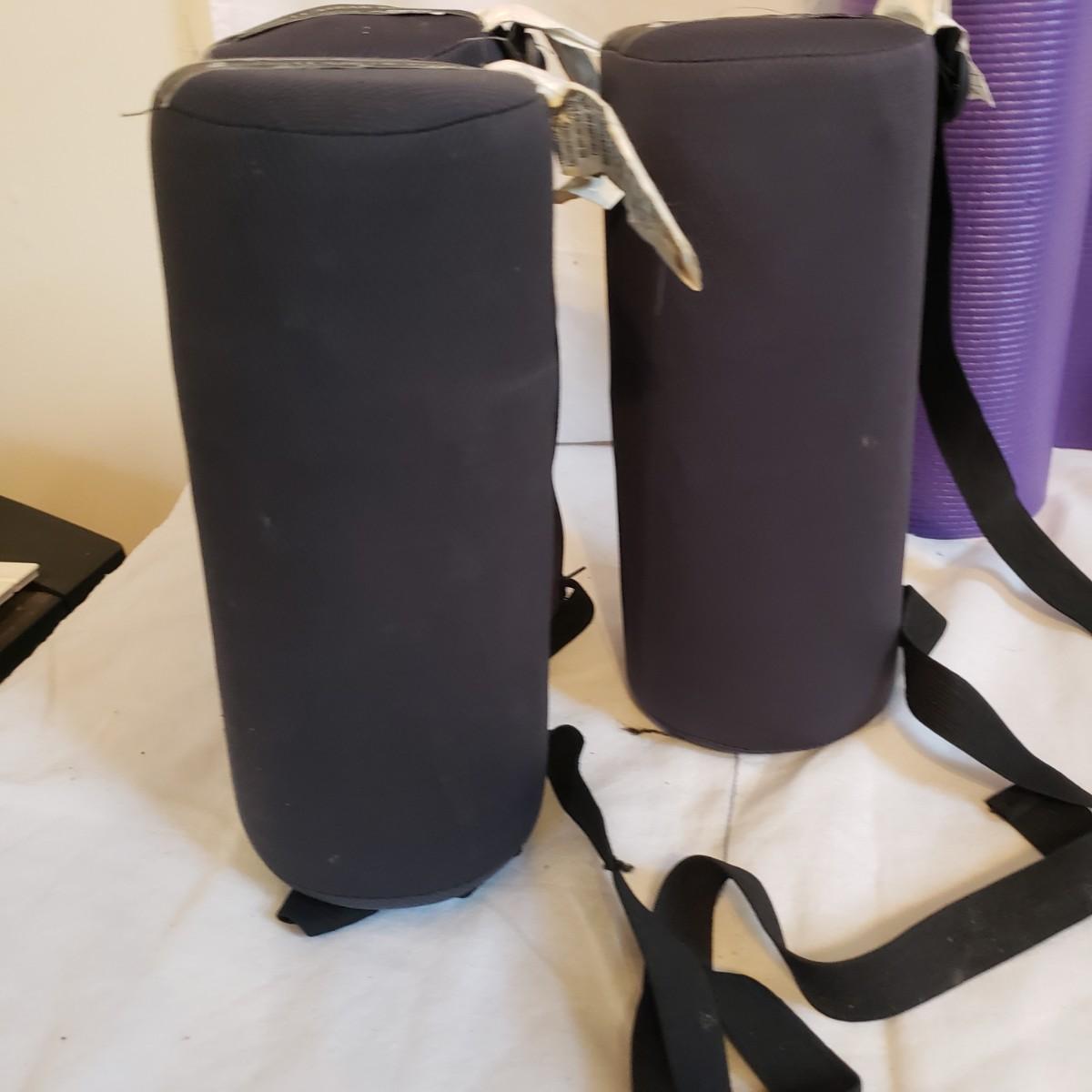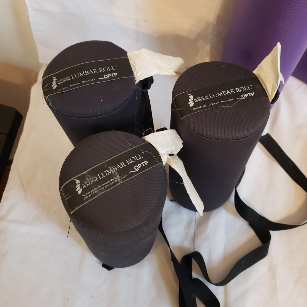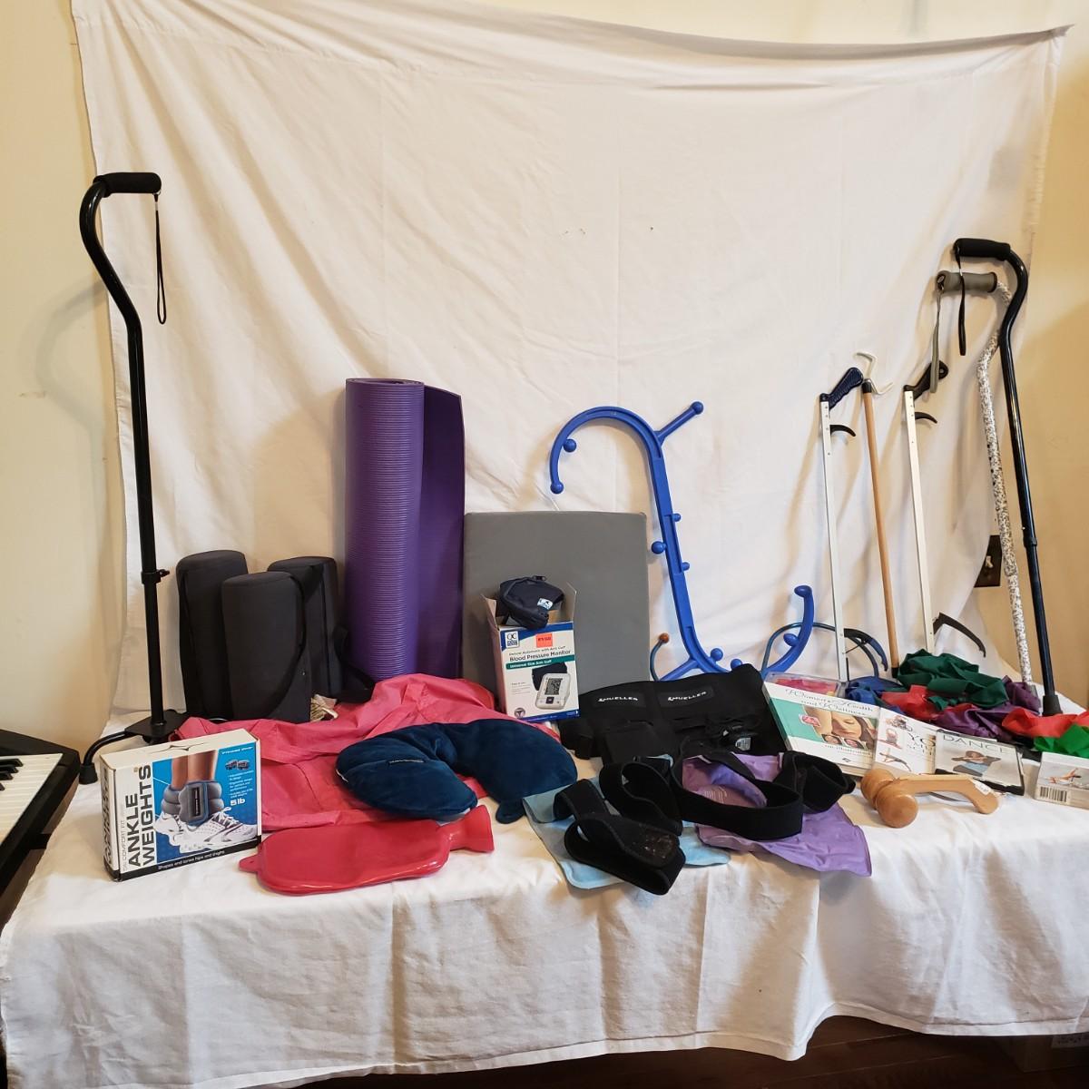 This lot will help in many ways! There are a pair of five-pound ankle weights that appear to be hardly used. The red rubber hot water bottle is just what your body ordered! The Revix cooling packs can velcro to the spot you need it. The QC blood pressure cuff powers on when tested. The are three grey the Original Lumbar Rolls measuring 4" x 11". A purple yoga mat that has some worn marks but is still plush. The grey velvet wedge pad measures 14" x 14" x 3" at its highest end. There are two back support braces, one is size large and the other by Mueller does not have a tag. There are also three canes: one with a base and the other two with sturdy rubber knobs at the bottom. All are adjustable. The Body Back Buddy is great for getting knots out of your back! There are multiple bands of various strengths and sizes.