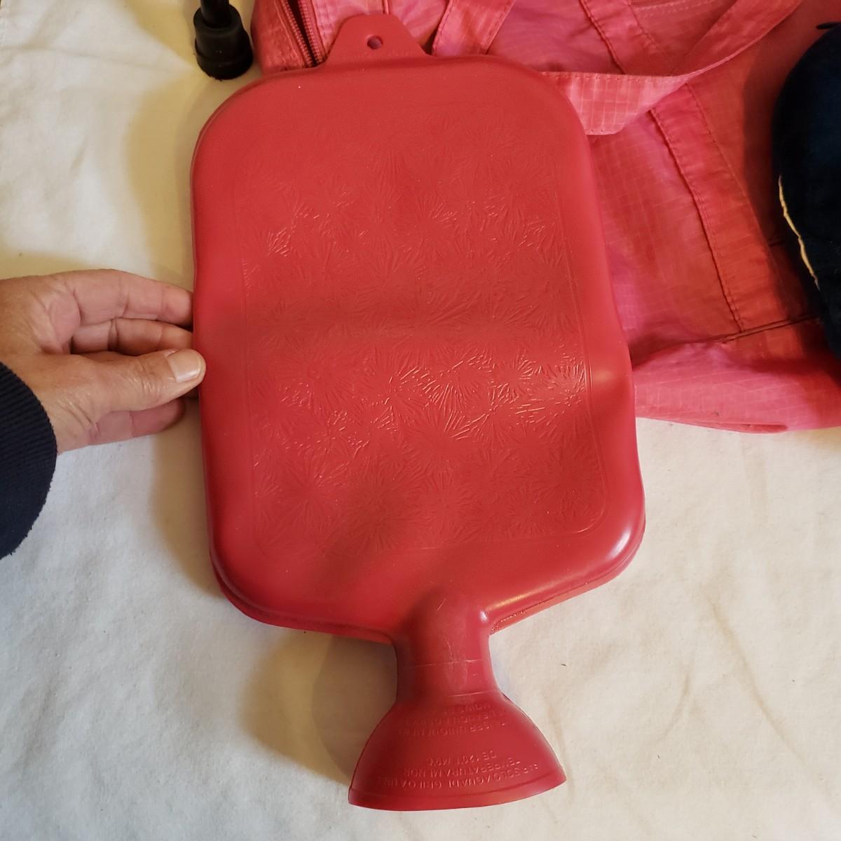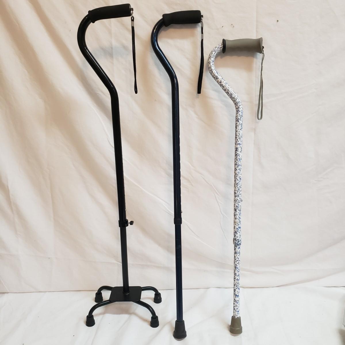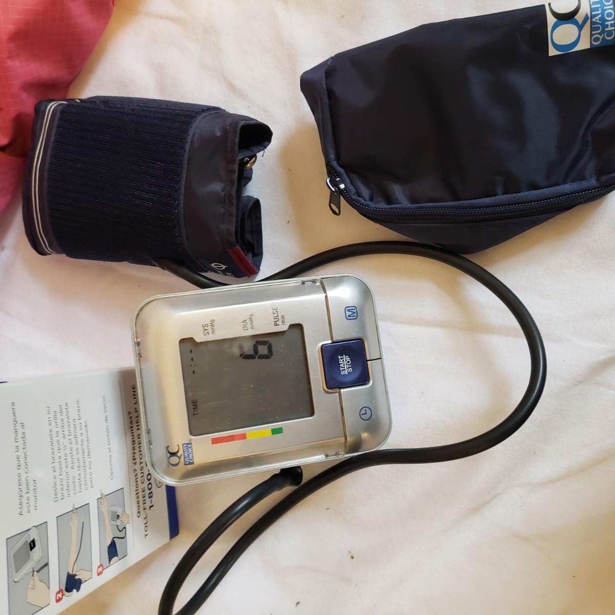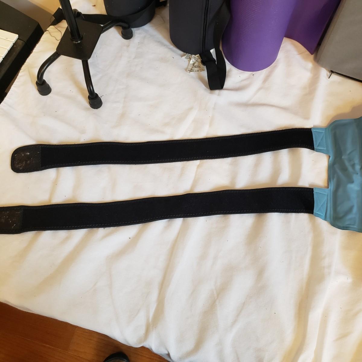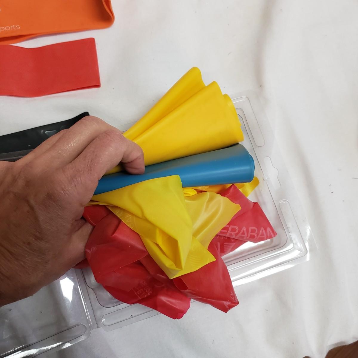 This lot will help in many ways! There are a pair of five-pound ankle weights that appear to be hardly used. The red rubber hot water bottle is just what your body ordered! The Revix cooling packs can velcro to the spot you need it. The QC blood pressure cuff powers on when tested. The are three grey the Original Lumbar Rolls measuring 4" x 11". A purple yoga mat that has some worn marks but is still plush. The grey velvet wedge pad measures 14" x 14" x 3" at its highest end. There are two back support braces, one is size large and the other by Mueller does not have a tag. There are also three canes: one with a base and the other two with sturdy rubber knobs at the bottom. All are adjustable. The Body Back Buddy is great for getting knots out of your back! There are multiple bands of various strengths and sizes.