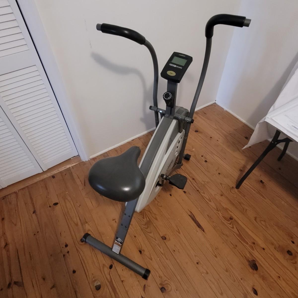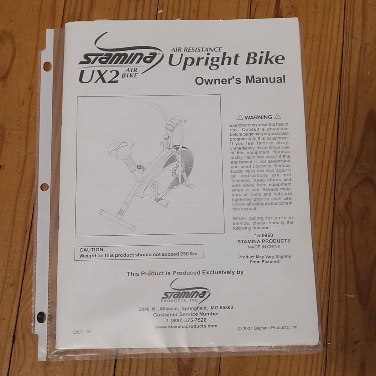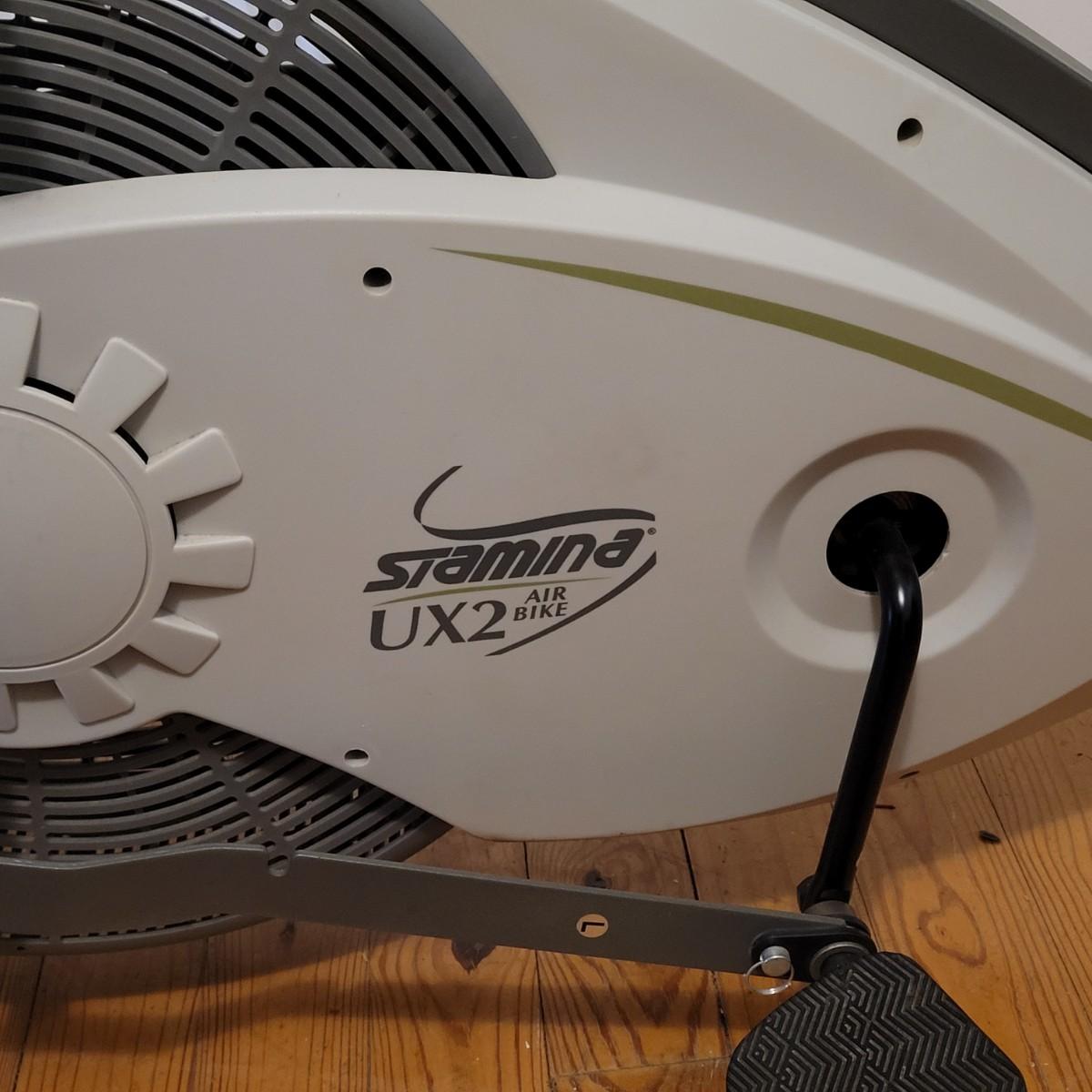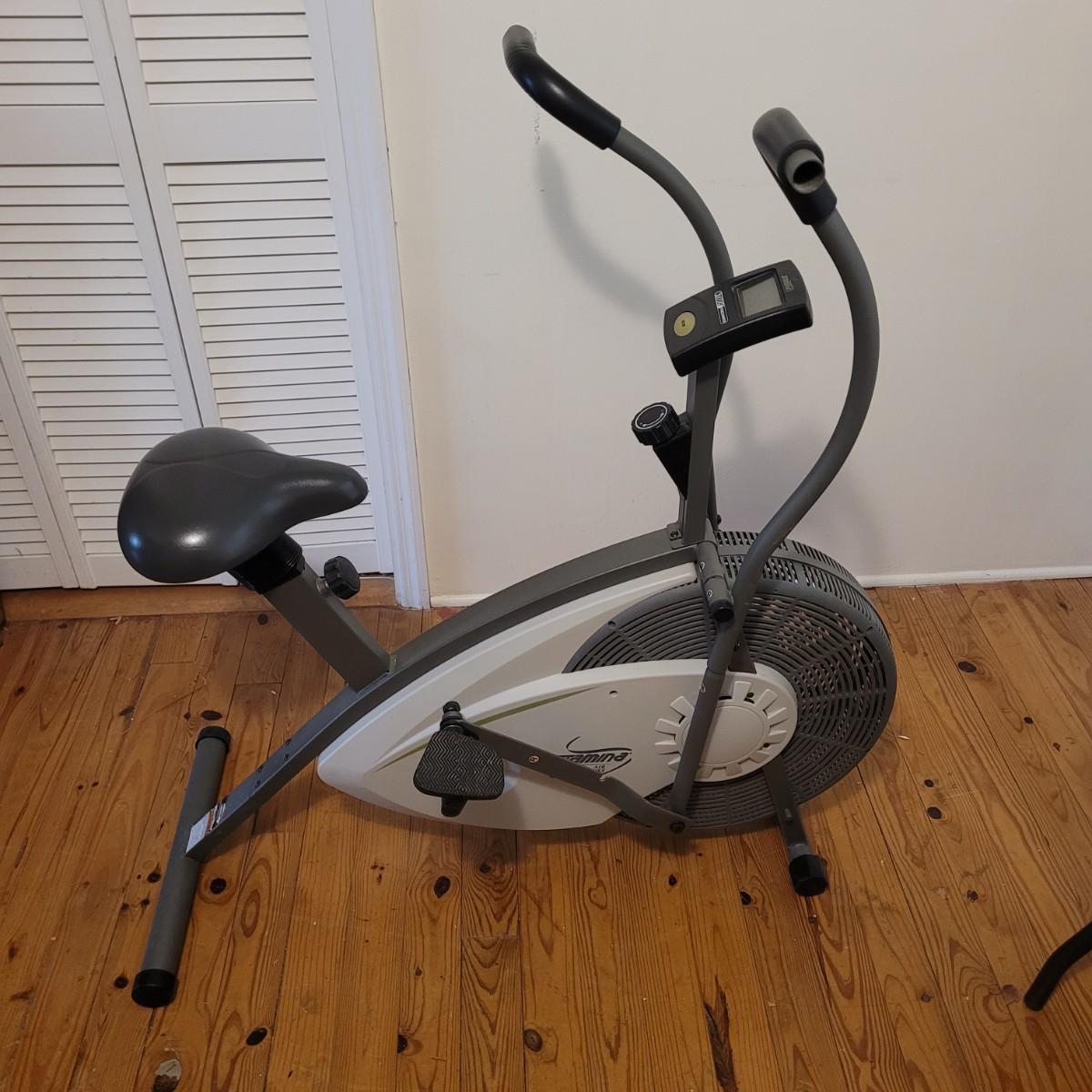 Stamina UX2 air bike with attached fitness monitor. Also includes six dumbbells, BodyBlade, walking sticks, strap on fitness monitor, and traction cleats. Bike includes original paperwork. Four dumbbells are metal and two are sand filled. Strap on monitor is Manaflexx brand and appears to be new in box. Bike measures 22" x 42" x 46"H.